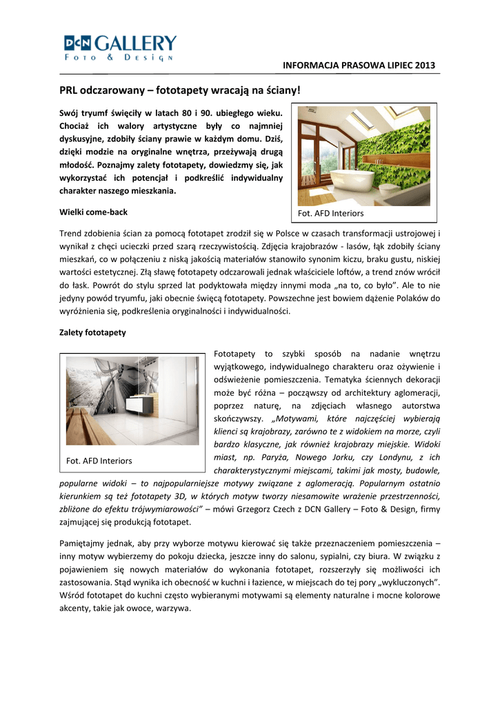 INFORMACJA PRASOWA LIPIEC 2013 PRL odczarowany – fototapety wracają na ściany! Swój tryumf święciły w latach 80 i 90. ubiegłego wieku. Chociaż ich walory artystyczne były co najmniej dyskusyjne, zdobiły ściany prawie w każdym domu. Dziś, dzięki modzie na oryginalne wnętrza, przeżywają drugą młodość. Poznajmy zalety fototapety, dowiedzmy się, jak wykorzystać ich potencjał i podkreślić indywidualny charakter naszego mieszkania. Wielki come-back Fot. AFD Interiors Trend zdobienia ścian za pomocą fototapet zrodził się w Polsce w czasach transformacji ustrojowej i wynikał z chęci ucieczki przed szarą rzeczywistością. Zdjęcia krajobrazów - lasów, łąk zdobiły ściany mieszkań, co w połączeniu z niską jakością materiałów stanowiło synonim kiczu, braku gustu, niskiej wartości estetycznej. Złą sławę fototapety odczarowali jednak właściciele loftów, a trend znów wrócił do łask. Powrót do stylu sprzed lat podyktowała między innymi moda „na to, co było”. Ale to nie jedyny powód tryumfu, jaki obecnie święcą fototapety. Powszechne jest bowiem dążenie Polaków do wyróżnienia się, podkreślenia oryginalności i indywidualności. Zalety fototapety Fototapety to szybki sposób na nadanie wnętrzu wyjątkowego, indywidualnego charakteru oraz ożywienie i odświeżenie pomieszczenia. Tematyka ściennych dekoracji może być różna – począwszy od architektury aglomeracji, poprzez naturę, na zdjęciach własnego autorstwa skończywszy. „Motywami, które najczęściej wybierają klienci są krajobrazy, zarówno te z widokiem na morze, czyli bardzo klasyczne, jak również krajobrazy miejskie. Widoki miast, np. Paryża, Nowego Jorku, czy Londynu, z ich Fot. AFD Interiors charakterystycznymi miejscami, takimi jak mosty, budowle, popularne widoki – to najpopularniejsze motywy związane z aglomeracją. Popularnym ostatnio kierunkiem są też fototapety 3D, w których motyw tworzy niesamowite wrażenie przestrzenności, zbliżone do efektu trójwymiarowości” – mówi Grzegorz Czech z DCN Gallery – Foto & Design, firmy zajmującej się produkcją fototapet. Pamiętajmy jednak, aby przy wyborze motywu kierować się także przeznaczeniem pomieszczenia – inny motyw wybierzemy do pokoju dziecka, jeszcze inny do salonu, sypialni, czy biura. W związku z pojawieniem się nowych materiałów do wykonania fototapet, rozszerzyły się możliwości ich zastosowania. Stąd wynika ich obecność w kuchni i łazience, w miejscach do tej pory „wykluczonych”. Wśród fototapet do kuchni często wybieranymi motywami są elementy naturalne i mocne kolorowe akcenty, takie jak owoce, warzywa. INFORMACJA PRASOWA LIPIEC 2013 Niepodważalną zaletą fototapety jest możliwość optycznej zmiany i kształtowania przestrzeni. W jakich pomieszczeniach sprawdzą się ścienne dekoracje? „Fototapeta to idealny sposób na ożywienie, ale także powiększenie wnętrza. Dlatego też rozwiązanie to doskonale sprawdza się w przypadku małych pomieszczeń, co więcej urządzonych w duchu minimalistycznym. Jeżeli decydujemy się na fototapetę, powinniśmy pamiętać, że to właśnie ona powinna stanowić główny akcent dekoracyjny wnętrza” – mówi Aleksandra Felska – Drożdż, architekt wnętrz. Fototapety można nakleić na ścianę, podłogę, sufit, meble, drzwi - wszystko jest kwestią naszej fantazji i pomysłu. Doskonale tuszują wady ściany, wszelkie nierówności, zadrapania, pęknięcia. Wybrać właściwą Dzięki zastosowaniu nowoczesnych technologii produkcji, laminowane fototapety są trwałym elementem dekoracji. W przeciwieństwie do tych sprzed lat, wykonane są z wysokiej jakości materiałów. Są odporne na tłuszcz, czynniki mechaniczne, a także promieniowanie UV, a to gwarantuje stałe nasycenie barw oraz ich trwałość. Ewentualne zabrudzenia w bardzo łatwy sposób można usunąć przy pomocy suchej Fot. DCN GALLERY Foto & Design lub wilgotnej szmatki. Dzięki odporności na wilgoć, możemy zamontować je także w łazience i kuchni. Fototapety to szybki sposób na ożywienie wnętrza. Szukajmy ich w wyspecjalizowanych sklepach internetowych, dzięki temu mamy gwarancję, że wykonane są z wysokiej jakości materiałów. Znajdziemy tu szeroki wybór motywów, profesjonalne doradztwo i obsługę klienta na wysokim poziomie. Ponadto każda fototapeta dostępna jest w różnych rozmiarach, może być także przygotowywana na indywidualne, niestandardowe zlecenie. Obecnie istnieje możliwość wydrukowania zdjęcia w najwyższej możliwej rozdzielczości i jakości kolorów. „Wybierając producenta najlepiej kierować się opiniami osób, które już skorzystały z jego oferty. To najbardziej wiarygodne źródło informacji „z pierwszej ręki”. Warto także zwrócić uwagę na to, czy producent dostarcza instrukcję przyklejania fototapety, jednym słowem, czy interesuje się tym, jak klient poradzi sobie z jej montażem. O wiarygodności producenta może również świadczyć także tak prozaiczna rzecz, jak jakość kontaktu, tj. możliwość uzyskania odpowiedzi na nurtujące pytania lub uzyskania wsparcia przy wyborze materiału do wykonania fototapety” – radzi Grzegorz Czech z DCN GALLERY – Foto & Design. http://www.dcngallery.pl/