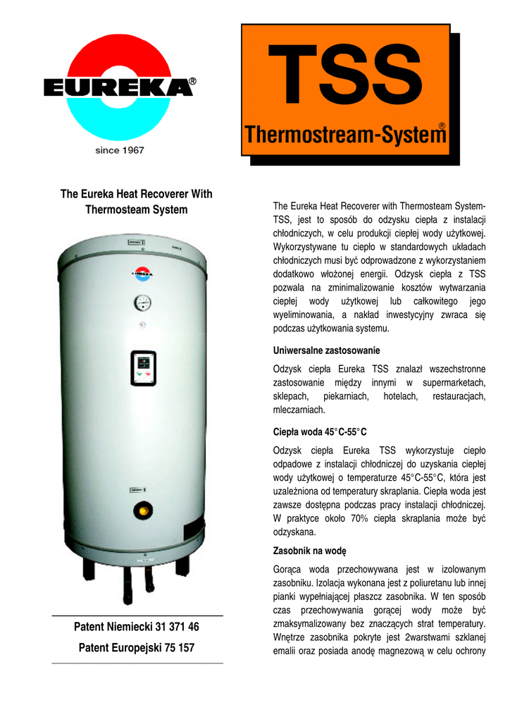 The Eureka Heat Recoverer With Thermosteam System The Eureka Heat Recoverer with Thermosteam SystemTSS, jest to sposób do odzysku ciepła z instalacji chłodniczych, w celu produkcji ciepłej wody użytkowej. Wykorzystywane tu ciepło w standardowych układach chłodniczych musi być odprowadzone z wykorzystaniem dodatkowo włożonej energii. Odzysk ciepła z TSS pozwala na zminimalizowanie kosztów wytwarzania ciepłej wody użytkowej lub całkowitego jego wyeliminowania, a nakład inwestycyjny zwraca się podczas użytkowania systemu. Uniwersalne zastosowanie Odzysk ciepła Eureka TSS znalazł wszechstronne zastosowanie między innymi w supermarketach, sklepach, piekarniach, hotelach, restauracjach, mleczarniach. Ciepła woda 45°C-55°C Odzysk ciepła Eureka TSS wykorzystuje ciepło odpadowe z instalacji chłodniczej do uzyskania ciepłej wody użytkowej o temperaturze 45°C-55°C, która jest uzależniona od temperatury skraplania. Ciepła woda jest zawsze dostępna podczas pracy instalacji chłodniczej. W praktyce około 70% ciepła skraplania może być odzyskana. Zasobnik na wodę Patent Niemiecki 31 371 46 Patent Europejski 75 157 Gorąca woda przechowywana jest w izolowanym zasobniku. Izolacja wykonana jest z poliuretanu lub innej pianki wypełniającej płaszcz zasobnika. W ten sposób czas przechowywania gorącej wody może być zmaksymalizowany bez znaczących strat temperatury. Wnętrze zasobnika pokryte jest 2warstwami szklanej emalii oraz posiada anodę magnezową w celu ochrony przed korozją. Zasobnik jest także wyposażony w posiadającą certyfikat TUV jednostkę monitorującą efektywność systemu ochrony przed korozją. System ten umożliwia bezawaryjne wykorzystanie zasobnika przez założony okres żywotności. Unikalna konstrukcja Eureka Projekt konstrukcji TSS do odzysku ciepła Eureka poparty jest wieloletnim doświadczeniem. Działa automatycznie i nie potrzebuje pomp. Dzięki unikalnej budowie Eureka, kiedy nastąpi zakamienienie, wymiennik może być szybko i łatwo wyczyszczony poprzez zapewnione specjalne połączenia. Nie jest konieczne odłączanie wody ani obiegu czynnika. 5 lat gwarancji Odzysk ciepła Eureka jest tak zaprojektowany, że praktycznie wszystkie możliwe formy korodowania zostały wyeliminowane. Na podstawie udowodnionej długiej żywotności jednostki, Eureka daje 5 letnią gwarancję na zasobnik, wszystkie inne elementy układu podlegają 2 letniej gwarancji. ZASADA DZIAŁANIA TSS EUREKA Doprowadzona zimna woda wodociągowa do dolnej części zasobnika, podgrzewana jest w osobnej komorze z zanurzonym wymiennikiem ciepła. Gorąca woda przepływa do górnej części zasobnika jak pokazano na rysunku powyżej. Wymiennik ciepła jest połączony bezpośrednio z instalacją chłodniczą. Czynnik chłodniczy przepływa w przeciwprądzie z wodą i ogrzewa ją do temperatury bliskiej temperaturze skraplania. OBIEG BEZPIECZEŃSTWA Wszystkie wymienniki ciepła są zatwierdzone przez TUV oraz zarejestrowane i monitorowane przez DVGW (German Association of Gas and Water Engineers). Oznaczenie testu: DIN-DVGW NW 9401 AR 3329. Wszystkie wymienniki produkowane są w standardzie z wysokojakościowej miedzi, zewnętrznie ocynkowane. Każdy wymiennik umieszczany jest w plastikowej komorze z rurą instalacyjną, która utrzymuje optymalny przepływ podgrzanej wody w obrębie zasobnika. ZAWARTOŚĆ ZESTAWU Odzysk ciepła TSS jest dostarczany wraz z izolacją, termometrem oraz określoną liczbą i typem wymiennika ciepła. Jednostka jest dostarczona gotowa do instalacji. Dane techniczne- wymienniki ciepła z obiegiem bezpieczeństwa. Wybór wymiennika: DUŻE MAŁE Zespół (ilość+wielkość) wymienników w zależności od wielkości mocującej płyty kołnierzowej (mała/duża) 3kW 6kW 12kW 18kW 1 1 1 - 1 1 1 4 2 2 1 3 1 1 1 1 1 1 1 2 1 1 1 1 2 3 and 1 1/2kW to max. 4 8 6 6 6 6 6 6 Max. Wydajność, Przyłącze Ø mm kW 1 1/2 12x1 3 16x1 6 18x1 12 22x1 18 22x1 Max ciśnienie robocze 35bar Podłączenie BSP pod termostat (poz 4) Podłączenie BSP pod termometr 0-120'C (poz 5) Maksymalne ciśnienie robocze Maksymalna temperatura robocza mm litry inch inch inch inch inch mm mm mm bar C 110 1050 500 400 40 30 1 1 1/2 instaler supply - 3./4 2 110 1xbottom 22Ø x 510 10 95 Pozycja 6a Masa Średnica włączając izolacje Model TSS TSS 110* Anoda (poz.7) Podłączenie pod odpowietrzanie i drugą cyrkulacje (poz3) kg Dodatkowe podłączenie pod grzałkę elektryczną. (poz.6) Podłączenie wody gorącej. Połączenie męskie BSP (poz.2) mm Średnica bez izolacji mm Wysokośc H litry Zasobnik na wodę Podłączenie zimnej wody. Połączenie męskie BSP (poz.1) TABELA 1 Dane Techniczne TSS- zasobnik wody TSS 220 220 1275 670 550 85 70 1 1 1./2 - 3./4 2 215 1xtop 33Ø x 450 10 95 TSS 450 450 1800 740 600 170 100 1 1/4 1 1/4 1./2 - 3./4 2 270 1xtop 33Ø x 700 10 95 TSS 750 TSS 1000 TSS1500 TSS 2000 750 1000 1500 2000 2030 2430 2290 2520 1000 1000 1200 1300 800 800 1000 1100 240 280 345 410 300 300 500 600 2 2 2 2 2 2 2 2 1./2 1./2 1./2 1./2 3./4 3./4 3./4 3./4 3./4 3./4 3./4 3./4 2 2 2 2 265 265 265 265 1top, 1xcentre 33Ø x 700 1top, 1xcentre 33Ø x 700 1top, 1xcentre 33Ø x 700 1top, 1xcentre 33Ø x 700 6 6 6 6 95 95 95 95 * jednostka montowana na ścianie. Wszystkie inne modele- zasobniki stojące.