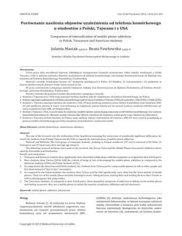 ORIGINAL PAPER Curr Probl Psychiatry 2013; 14(4):222-226 Porównanie nasilenia objawów uzależnienia od telefonu komórkowego u studentów z Polski, Tajwanu i z USA Comparison of intensification of mobile phone addiction in Polish, Taiwanese and American students Jolanta Masiak A,B,D-F, Beata Pawłowska A,B,D-F Katedra i Klinika Psychiatrii Uniwersytetu Medycznego w Lublinie Streszczenie Celem pracy była weryfikacja hipotezy zakładającej występowanie istotnych statystycznie różnic między studentami z Polski, Tajwanu i USA w zakresie nasilenia objawów uzależnienia od telefonu komórkowego, mierzonego Kwestionariuszem do Badania Uzależnienia od Telefonu Komórkowego Potembskiej i Pawłowskiej. Materiał i metody: Przebadano łącznie 147 studentów studiujących w Polsce: 83 Polaków, 31 Tajwańczyków i 33 studentów ze Stanów Zjednoczonych, których średni wiek wynosił 21 lat. W pracy zastosowano następujące metody badawcze: Ankietę oraz Kwestionariusz do Badania Uzależnienia od Telefonu Komórkowego, autorstwa Potembskiej i Pawłowskiej Wyniki i wnioski: Na podstawie badań sformułowano następujące wnioski: 1. Studenci z Tajwanu oraz z USA mają znacząco bardziej nasilone objawy uzależnienia od telefonu komórkowego, niż Polacy. 2. Kryteria zagrożenia uzależnieniem od telefonu komórkowego spełnia więcej studentów z Tajwanu (55%) niż studentów z USA (39%) i z Polski (22%). 3. Studenci z Tajwanu znacząco bardziej niż studenci z USA i Polacy preferują rozmowy przez telefon komórkowy oraz wysyłanie SMSów nad spotkania „twarzą w twarz” oraz informują, że negatywne emocje łatwiej jest im wyrazić podczas rozmowy telefonicznej i pisania wiadomości typu SMS, niż bezpośrednio. 4. Studenci z Tajwanu i z USA, w porównaniu do studentów polskich istotnie częściej kupują najnowszy model telefonu komórkowego oraz wykorzystują telefon komórkowy do: słuchania muzyki, robienia zdjęć i filmów, wysyłania ich znajomym, a także grania w gry i łączenia się z Internetem. 5. Studenci z Tajwanu istotnie bardziej niż Polacy mają nasilone objawy uzależnienia od rozmów i SMS-ów oraz częściej zaspokajają za pomocą telefonu komórkowego potrzebę akceptacji, przynależności i ujawniania siebie. Słowa kluczowe: telefon komórkowy, uzależnienie, młodzież Abstract The aim of the research was the verification of the hypothesis assuming the occurrence of statistically significant differences between the students from Poland, Taiwan and the USA as regards the intensification of mobile phone addiction. Material and Methods: The total group of examined students, studying in Poland, numbered 147 and it consisted of 83 Poles, 31 Taiwanese and 33 Americans, their average age being 21. The following research methods were used in the research: the Survey Form and the Mobile Phone Assessment Addiction developed by Potembska and Pawłowska. Results and conclusions: 1. Taiwanese and American students show significantly more intensified mobile phone addiction symptoms as compared to their Polish peers. 2. More students from Taiwan (55%) fulfil the criteria of being at risk of developing the mobile phone addiction as compared to the American students (39%) and Polish students (22%). 3. As compared to the American and Polish students, the students from Taiwan prefer using mobile phones to talk to other people and text them instead of “face to face” encounters. 4. As compared to the Polish students, the students from Taiwan and the USA significantly more often buy the latest models of mobile phones. Their use of the mobile phone includes listening to music, taking pictures, making films and sending them to their friends as well as playing games and going online. 5. The Taiwanese students, as compared to their Polish peers, show intensified symptoms of addiction to talking on the mobile phone and texting, moreover, they use a mobile phone to satisfy the need for acceptance, affiliation and self-disclosure. Keywords: mobile phone, addiction, adolescents Wstęp Badacze tematu [1, 2] wskazują na coraz większe rozpowszechnienie wśród młodzieży zagrożenia uzależnieniem od rozmów prowadzonych przez telefon komórkowy oraz od wiadomości tekstowych SMS. Copyright © 2013 Medical University of Lublin Griffiths [3] definiuje uzależnienie technologiczne jako uzależnienie behawioralne, w którym występuje zależność między człowiekiem a maszyną, przy braku jednoczesnej fizycznej intoksykacji. Analogicznie do kryteriów uzależnienia od Internetu [4], uzależnienie od telefonu komór- Porównanie nasilenia objawów uzależnienia od telefonu komórkowego u studentów z Polski kowego można definiować jako nieprawidłowy, dysfunkcjonalny sposób korzystania z telefonu komórkowego. Patologicznie korzysta z telefonu komórkowego we Włoszech 6,3% młodzieży (6,1% chłopców oraz 6,5% dziewcząt) [5], w Hiszpanii - 20% młodzieży (26,1% dziewcząt i 13% chłopców) [6], a na Tajwanie - 16,5% (18,5% dziewcząt i 14,4% chłopców) [7]. W Japonii 3,1% mężczyzn i 5,4% kobiet jest zagrożonych uzależnieniem od wysyłania wiadomości tekstowych z telefonów komórkowych [8]. Wyniki badań Pawłowskiej i Potembskiej [1], przeprowadzonych na grupie 658 osób, w wieku 13-24 lat informują, że ok.3% (2,9% kobiet i 2,5% mężczyzn) polskiej młodzieży spełnia kryteria uzależnienia od telefonu komórkowego. Dane uzyskane na podstawie dotychczasowych badań wskazują, że mniejsza liczba młodzieży w Polsce, niż we Włoszech, Hiszpanii i na Tajwanie, w Japonii jest uzależniona od telefonu komórkowego. Podkreślić należy, że niezależnie od kraju, w którym przeprowadzono badania oraz metody użytej do określenia objawów uzależnienia od telefonu komórkowego, wyniki analiz wskazują, że więcej kobiet niż mężczyzn patologicznie korzysta z telefonu komórkowego, przeciwnie do uzależnienia od Internetu. Należy jednak zwrócić uwagę na wyniki 