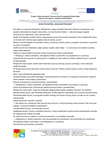 Janina Porazińska „Szewczyk Dratewka” Żył sobie raz szewczyk Dratewka. Biedak był z niego a biedak! Aby liche odzienie na grzbiecie, aby podarte skórzniaki na nogach, aby torba, a w niej kromka chleba — cały to był jego majątek. Od wsi do wsi wędrował i stare obuwie łatał. Szedł raz Dratewka wielkim lasem, zobaczył pod sosną rozrzucone mrowisko. Musi niedźwiedź, który na wiosnę rad mrówcze jaja wyjada, taką im psotę uczynił. Biedne mrówki biegały na wszystkie strony, znosiły po ziarnku piasku, po igiełce sosnowej i mrowisko na nowo narządzały. Użalił się nad nimi Dratewka, zdjął z głowy czapkę i jako mógł — to rozrzucone mrowisko na jedną kupę czapką zgarnął. Wtedy na wierzchołek mrowiska wyszła mrówcowa matka i powiedziała: — Dziękuję ci, dobry człowieku. Jak będziesz kiedy w potrzebie, to przyjdziemy ci z pomocą. Uśmiechnął się szewczyk, bo jakąż pomoc mogłyby mu dad nędzne mrówki, pokłonił się im i poszedł w dalszą drogę. Minęło dni mało-wiele. Szedł znów Dratewka puszczą zieloną, puszczy szumiącą i znów zobaczył wielką krzywdę. W dziupli starej sosny była bard i ktoś tę bard zniszczył. Plastry wosku leżały na ziemi, miód ściekał po drzewie. Musi i tutaj niedźwiedź gospodarował. Zaczął Dratewka pszczołom pomagad. Pownosił plastry na drzewo i w dziupli je umocował, woskiem otwór oblepił, miód ciekący zatamował. Wyszła na brzeg barci pszczela królowa i powiedziała: — Dziękujemy ci, dobry człowieku. Jak będziesz kiedy w potrzebie, to przyjdę ci z pomocą. Znów się Dratewka aby uśmiechnął, pokłonił się pszczołom i poszedł dalej. Minęło dni mało-wiele. Szedł raz Dratewka długą groblą między wielkimi stawami. Po stawach pływały dzikie kaczki. Jak Dratewkę zobaczyły, wielkim głosem zakwakały, po trzcinach się pochowały. Wiedziały dzikie kaczki, że po grobli myśliwi chodzą, do kaczek mierzą, bystre strzały na nie z łuków wypuszczają. Stanął szewczyk na grobli i zawołał: — Nie bójcie się, cyraneczki. Nie chcę do was mierzyd, a chcę się waszą urodą ucieszyd. Nie chcę was zabijad, a chcę was chlebem uczęstowad! I zaczął chleb kruszyd i do wody go wrzucad. Wypłynęły kaczki z trzciny, wszystkie okruchy z wody wyzbierały i bardzo się tej smakowitości dziwiły, bo nigdy jeszcze chleba nie jadły. Aż najstarszy kaczor, piękny, z modrym lusterkiem na skrzydłach powiada: — Dziękujemy ci, dobry człowieku, żeś nie przyszedł nas mordowad, aleś przyszedł nas uczęstowad. Jak będziesz kiedy w potrzebie, to przybędziemy ci z pomocą. Uśmiechnął się Dratewka, pomyślał: "Jakąż ja mogę mied z was pomoc? Przyszwy za mnie nie przyszyjecie, obcaska za mnie nie przybijecie". Ale ładnie, pięknie im się ukłonił i poszedł dalej. Idzie, idzie... aż zaszedł do takiej krainy, gdzie był zamek, a przy zamku wieża, a w tej wieży zamknięta była panna, a tej panny pilnowała czarownica. Koło zamku ludzie stoją i tak sobie rozmawiają: — Kto by się z tą panną ożenił, toby ją z niewoli czarownicy wybawił. — Ale tylko ten się z nią może ożenid, km dwie roboty odrobi i zagadkę odgadnie. — To może ja bym spróbował — mówi Dratewka. — Nie wyrywaj się, głupi! Życie ci niemiłe czy co? Kto pójdzie na ochotnika, a nie zrobi, to temu czarownica głowę urywa. A Dratewka swoje: — Ale może ja bym spróbował. — Nie tacy, jak ty, tu próbowali. Rycerze przyjeżdżali i królewicze, i książęta. Nikt nie potrafił tych robót zrobid, tej zagadki odgadnąd. Nikomu czarownica nie darowała, wszystkim pourywała głowy! Ale Dratewka swoje: — A ja pójdę i spróbuję. I szewczyk zastukał do bramy zamku. Wyszła zaraz czarownica i pyta się: Czyś ty człowiek? Czyś ty zwierz? Czemu pukasz? Czego chcesz? — Chcę się z tą panną, co siedzi na wieży, ożenid. Jak zrobisz niedługo robotę pierwszą i drugą, a potem składnie zagadkę odgadniesz, to się ożenisz. — Ano, popróbuję — mówi Dratewka. Tak czarownica wpuściła go na zamek, zaprowadziła do komnaty, co się na siedmioro drzwi zamykała, co w oknie żelazną kratę miała, i powiada: Masz tu piasku z makiem korzec. Przebierz, zanim błysną zorze. Jak nie zrobisz do poranku, to ci, panku, urwę głowę, i gotowe! I czarownica wyszła, i szewczyka w komnacie na siedmioro drzwi zamknęła. Siedzi Dratewka, w głowę się drapie i myśli: "Tylachny wór przebrad! Piasek osobno... mak osobno... Toż tu roboty jest na rok, od wiosny do wiosny, a ona mi każe do świtania to zrobid! Oj, źle z tobą, Dratewka, źle!" Wtem słyszy... za oknem po ścianie coś szura. Nabliża się ten szmer od okna, nabliża... i przez żelazną kratę zaczynają do izby wbiegad mrówki. Tysiące i tysiące... mnogośd nieprzeliczona! Skoczył Dratewka, mak z piaskiem z wora na podłogę wysypał. A mrówki, jak sil do roboty wzięły, jak zaczęły zwijad się, a jedna drugą poganiad, a ziarenka nosid mak na prawo, piasek na lewo... Do północka wszystko przebrały. Znó w po ścianie zaszurało... Mrówki przez kratę przelazły i w las poszły. Ucieszył się Dratewka, pusty worek zwinął, pod głowę go sobie podłożył i zasnął. O pierwszej zorzy czarownica siedmioro drzwi odmyka i już cieszy się, że i temu zalotnikowi głowę urwie. Wchodzi i widzi: mak na jednej kupce, piasek na drugiej, a szewczyk na ziemi siedzi i przeciąga się, bo się doskonale wyspał. Wielce się czarownica zdumiała, ale nie daje o tym poznaki po sobie, tylko powiada: Dzisiaj to masz do roboty: miała panna kluczyk złoty i jak poszła do kąpieli, upuściła go w topieli. Uwio mi się składnie i znajdź kluczyk na dnie. Jak nie znajdziesz do poranku, to ci, panku, urwę głowę, i gotowe! Poszedł Dratewka nad stawy. Stanął na grobli i zadumał się głębokim zadumaniem, i zafrasował się wielkim zafrasowaniem. Jakże mu ten kluczyk znaleźd? Czy 