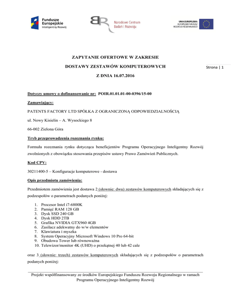 ZAPYTANIE OFERTOWE W ZAKRESIE DOSTAWY ZESTAWÓW KOMPUTEROWYCH Z DNIA 16.07.2016 Dotyczy umowy o dofinansowanie nr: POIR.01.01.01-00-0396/15-00 Zamawiający: PATENTS FACTORY LTD SPÓŁKA Z OGRANICZONĄ ODPOWIEDZIALNOŚCIĄ ul. Nowy Kisielin – A. Wysockiego 8 66-002 Zielona Góra Tryb przeprowadzenia rozeznania rynku: Formuła rozeznania rynku dotycząca beneficjentów Programu Operacyjnego Inteligentny Rozwój zwolnionych z obowiązku stosowania przepisów ustawy Prawo Zamówień Publicznych. Kod CPV: 30211400-5 – Konfiguracje komputerowe - dostawa Opis przedmiotu zamówienia: Przedmiotem zamówienia jest dostawa 2 (słownie: dwu) zestawów komputerowych składających się z podzespołów o parametrach podanych poniżej: 1. 2. 3. 4. 5. 6. 7. 8. 9. 10. Procesor Intel i7-6800K Pamięć RAM 128 GB Dysk SSD 240 GB Dysk HDD 2TB Grafika NVIDIA GTX960 4GB Zasilacz adekwatny do w/w elementów Klawiatura i myszka System Operacyjny Microsoft Windows 10 Pro 64-bit Obudowa Tower lub równoważna Telewizor/monitor 4K (UHD) o przekątnej 40 lub 42 cale oraz 3 (słownie: trzech) zestawów komputerowych składających się z podzespołów o parametrach podanych poniżej: __________________________________________________________________________________ Projekt współfinansowany ze środków Europejskiego Funduszu Rozwoju Regionalnego w ramach Programu Operacyjnego Inteligentny Rozwój Strona | 1 1. 2. 3. 4. 5. 6. 7. 8. 9. 10. Procesor Intel i7-4790K Pamięć RAM 64 GB Dysk SSD 240 GB Dysk HDD 1TB Grafika NVIDIA GTX960 4GB Zasilacz adekwatny do w/w elementów Klawiatura i myszka System Operacyjny Microsoft Windows 10 Pro 64-bit Obudowa Tower lub równoważna Telewizor/monitor 4K (UHD) o przekątnej 40 lub 42 cale Pożądanym jest, aby sfinansowanie zamówienia zostało dokonane w formie płatności ratalnych (36-48 rat), z zastrzeżeniem możliwości finansowania w drodze leasingu. Warunki udziału w postępowaniu: Do udziału w postępowaniu dopuszczone są wszystkie podmioty posiadające zdolność do zrealizowania zamówienia. Kryteria oceny ofert: Oferty otrzymane w odpowiedzi następujących kryteriów: na przedmiotowe zapytanie zostaną ocenione wg a) Cena – waga 80% Przedmiotowe kryterium dotyczy łącznej ceny netto za realizację zamówienia. Punkty w danej kategorii będą przyznawane odwrotnie proporcjonalnie do wzrostu ceny danej oferty – oferta najtańsza otrzyma największą ilość punktów. b) Termin realizacji – waga 20% Przedmiotowe kryterium dotyczy terminu realizacji zamówienia od dnia złożenia zamówienia lub zawarcia umowy zakupu zestawów komputerowych. Punkty w danej kategorii będą przyznawane odwrotnie proporcjonalnie do długości terminu realizacji zamówienia – oferta z najkrótszym terminem realizacji otrzyma największą liczbę punktów. Forma i treść składanych ofert: 1. Oferta musi zawierać: a) nazwę i dane kontaktowe oferenta; __________________________________________________________________________________ Projekt współfinansowany ze środków Europejskiego Funduszu Rozwoju Regionalnego w ramach Programu Operacyjnego Inteligentny Rozwój Strona | 2 b) specyfikację techniczną poszczególnych podzespołów; c) łączną cenę netto wszystkich 5 zestawów komputerowych; d) termin realizacji zamówienia; e) termin obowiązywania oferty. 2. Pożądanym jest, aby oferta zawierała informacje dotyczące płatności ratalnych – tj. ilość rat i kwotę poszczególnej raty. 3. Ofertę należy przesłać do dnia 24 lipca 2016 r. w formie elektronicznej na adres mailowy: [email protected] Informacje końcowe: 1. Wszelkie koszty związane z udziałem w przedmiotowym postępowaniu obciążają oferenta. 2. Zamawiający zastrzega sobie możliwość anulowania przedmiotowego postępowania na każdym jego etapie, w tym po dokonaniu wyboru dostawcy. W takiej sytuacji oferentom nie przysługują żadne roszczenia wobec Zamawiającego. 3. Złożenie oferty jest tożsame z akceptacją warunków określonych w przedmiotowym zapytaniu. 4. Wszelkie pytania związane z przedmiotowym postępowaniem należy kierować pod adres: [email protected] Prezes Zarządu Jacek Paczkowski __________________________________________________________________________________ Projekt współfinansowany ze środków Europejskiego Funduszu Rozwoju Regionalnego w ramach Programu Operacyjnego Inteligentny Rozwój Strona | 3