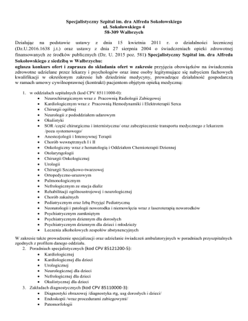 Specjalistyczny Szpital im. dra Alfreda Sokołowskiego ul. Sokołowskiego 4 58-309 Wałbrzych Działając na podstawie ustawy z dnia 15 kwietnia 2011 r. o działalności leczniczej (Dz.U.2016.1638 j.t.) oraz ustawy z dnia 27 sierpnia 2004 o świadczeniach opieki zdrowotnej finansowanych ze środków publicznych (Dz. U. 2015 poz. 581) Specjalistyczny Szpital im. dra Alfreda Sokołowskiego z siedzibą w Wałbrzychu: ogłasza konkurs ofert i zaprasza do składania ofert w zakresie przyjęcia obowiązków na świadczenia zdrowotne udzielane przez lekarzy i psychologów oraz inne osoby legitymujące się nabyciem fachowych kwalifikacji w określonym zakresie lub dziedzinie medycyny, prowadzące działalność gospodarczą w ramach umowy cywilnoprawnej (kontrakt) pacjentom objętym opieką medyczną: 1. w oddziałach szpitalnych (kod CPV 85111000-0): Neurochirurgicznym wraz z Pracownią Radiologii Zabiegowej Kardiologicznym wraz z Pracownią Hemodynamiki i Elektroterapii Serca Chirurgii ogólnej Neurologii z pododdziałem udarowym Okulistyki SOR /część chirurgiczna i internistyczna/ oraz zabezpieczenie transportu medycznego z lekarzem /poza systemowego/ Anestezjologii i Intensywnej Terapii Chorób wewnętrznych I i II Onkologiczny wraz z hematologią i Oddziałem Chemioterapii Dziennej Otolaryngologii Chirurgii Onkologicznej Urologii Chirurgii Szczękowo-twarzowej Ortopedyczno-urazowym Pulmonologicznym Nefrologicznym ze stacja dializ Rehabilitacji ogólnoustrojowej i neurologicznej Chorób zakaźnych Pediatrycznym oraz Izbą Przyjęć Pediatryczną Neonatologii i patologii noworodka i niemowlęcia wraz z laseroterapią noworodków Psychiatrycznym zamkniętym Psychiatrycznym dziennym dla dorosłych Psychiatrycznym dziennym dla dzieci i młodzieży Leczenia alkoholowych zespołów abstynencyjnych W zakresie także prowadzenie specjalizacji oraz udzielanie świadczeń ambulatoryjnych w poradniach przyszpitalnych zgodnych z profilem danego oddziału. 2. Poradniach specjalistycznych (kod CPV 85121200-5): Kardiologicznej Kardiologicznej dla dzieci Urologicznej Neurologicznej dla dzieci Nefrologicznej dla dzieci Okulistycznej dla dzieci 3. Zakładach diagnostycznych (kod CPV 85110000-3): Diagnostyki obrazowej /diagnostyka rtg, usg dorosłych i dzieci/ Endoskopii /wraz procedurami zabiegowymi/ Patomorfologii 4. W zakresie świadczeń/procedur psychologicznych (kod CPV 85112000-7) w oddziałach i poradniach psychiatrycznych, oddziale onkologii, chirurgii onkologicznej oraz oddziale rehabilitacji ogólnoustrojowej i neurologicznej). SZACUNKOWA LICZBA UPRAWNIONYCH DO ŚWIADCZEŃ – ok. 184.000 osób. I. Zakres świadczeń został określony w „SZCZEGÓŁOWYCH WARUNKACH KONKURSU OFERT” (SWKO), które stanowią integralną część do niniejszego ogłoszenia. SWKO wraz z regulaminem udzielania zamówień na realizację świadczeń zdrowotnych, projektem umowy i wzorem formularza ofertowego można pobrać ze strony internetowej www.zdrowie.walbrzych.pl II. Umowa zostanie zawarta od dnia 01.01.2017 r. do dnia 31.12.2018 r.. III. Oferta i sposób przygotowania ofert. Oferent składa w jednej kopercie ofertę na wybrany lub wybrane pakiety świadczeń. Ofertę należy złożyć zgodnie z wymogiem określonym w SWKO. Pod rygorem odrzucenia oferta musi być złożona w zamkniętej nieprzeźroczystej kopercie, z czytelną pieczątką oferenta i adnotacją „Konkurs na udzielanie świadczeń zdrowotnych z zakresu ……………………………………………………..”. Oferta musi być napisana w języku polskim. Oferent ponosi wszelkie koszty związane z przygotowaniem i złożeniem oferty. IV. Oferent musi zobowiązać się do zapoznania ze standardami ISO 9001:2008 dotyczącymi przedmiotu konkursu i zobowiązać się do realizowania umowy z zachowaniem tych standardów. V. Oferty należy składać w siedzibie Udzielającego zamówienie - bud C pok. 32-37 (sekretariat Dyrektora Szpitala) do dnia 09.12.2016 r. do godz. 10.00. Otwarcie ofert odbędzie się w dniach 09, 12 i 13.12.2016 r. o godz. 10.30, w siedzibie Udzielającego zamówienie – budynek C (sekretariat Dyrektora Szpitala). VI. Udzielającemu zamówienie przysługuje prawo swobodnego wyboru oferty, możliwość odwołania konkursu w całości lub części oraz prawo do przesunięcia terminu składania ofert. VII. Rozstrzygnięcie konkursu ofert nastąpi do dnia 22 .12.2016 r. poprzez zawiadomienie biorących udział w konkursie Oferentów za pośrednictwem strony internetowej Udzielającego zamówienie. VIII. Termin związania ofertą wynosi do 30 dni od dnia upływu terminu składania ofert. IX. Oferent ma prawo do składania umotywowanego protestu na dokonaną czynność w toku postępowania konkursowego i wniesienia odwołania dotyczącego rozstrzygnięcia konkursu ofert. X. Udzielający zamówienie ma prawo do odwołania konkursu i do przesunięcia terminu składania ofert. Dyrektor Szpitala Mariola Dudziak