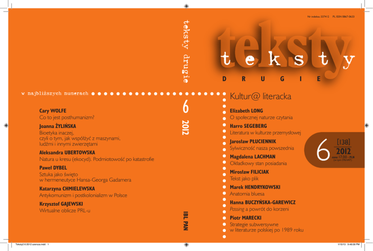 Nr indeksu 337412 teksty drugie . w najblizszych numerach Joanna Żylińska Bioetyka inaczej, czyli o tym, jak współżyć z maszynami, ludźmi i innymi zwierzętami 6 2012 Cary Wolfe Co to jest posthumanizm? t e k s t y D R U G E Kultur@ literacka Elizabeth Long O społecznej naturze czytania Harro Segeberg Literatura w kulturze przemysłowej Magdalena Lachman Okładkowy stan posiadania Mirosław Filiciak Tekst jako plik Katarzyna Chmielewska Antykomunizm i postkolonializm w Polsce Marek Hendrykowski Anatomia bluesa Krzysztof Gajewski Wirtualne oblicze PRL-u Hanna Buczyńska-Garewicz Passing a powrót do korzeni IBL PAN Paweł Dybel Sztuka jako święto w hermeneutyce Hansa-Georga Gadamera Teksty2 6 2012 szersza.indd 1 I Jarosław Płuciennik Sylwiczność nasza powszednia Aleksandra Ubertowska Natura u kresu (ekocyd). Podmiotowość po katastrofie PL ISSN 0867-0633 6 [138] 2012 cena 17.00 - PLN (w tym 5% VAT) Piotr Marecki Strategie subwersywne w literaturze polskiej po 1989 roku 1/15/13 9:48:58 PM Spis treści „Teksty Drugie” 2012 nr 6 Wstęp Maciej MARYL 6 Harro SEGEBERG 15 Paweł ZAJAS 38 Dominik ANTONIK Maciej MARYL Magdalena LACHMAN 62 77 101 Piotr SOBOLCZYK Michał WRÓBLEWSKI 119 129 Elizabeth LONG 136 Shai M. DROMI, Eva ILLOUZ 167 Literatura i e-społeczeństwo Szkice Literatura w kulturze przemysłowej Przeł. Bogdan Balicki Poetyckie penetracje. Literatura, jej tłumacze i wydawcy na frontach Wielkiej Wojny (1914-1918) Autor jako marka Kim jest pisarz (w internecie)? Okładkowy stan posiadania (w literaturze najnowszej) Roztrząsania i rozbiory GayRL czy QueeRL? Literatura, język i media Prezentacje O społecznej naturze czytania Przeł. Maciej Maryl Odzyskiwanie moralności socjologia pragmatyczna i literaturoznawstwo Przeł. Michał Wróblewski i Jarosław Płuciennik Interpretacje Marek HENDRYKOWSKI 188 Piotr STERCZEWSKI Tomasz KUKOŁOWICZ 210 229 Anatomia bluesa. Studium z semiotyki kultury Czytanie gry Transkrypcja tekstów hip-hopowych (rapu) w świetle teorii wiersza 2 Dociekania Jarosław PŁUCIENNIK 246 Mirosław FILICIAK 258 Sylwiczność nasza powszechna i metakognicja Tekst jako plik. Techno-społeczne wymiary czytania na przykładzie przemian procesów dystrybucji tekstów akademickich Marek KAŹMIERCZAK 270 Olga DAWIDOWICZ-CHYMKOWSKA 287 Izabella ADAMCZEWSKA 300 Piotr MARECKI 313 Agnieszka MROZIK 325 Użytkownik, nadawca i odbiorca w Web 2.0. Uwagi o różnych sposobach odnoszenia się do literatury w serwisie Twitter „Wynaturzone” Forum Fanów Małgorzaty Musierowicz jako interakcyjna maszyna interpretacyjna: studium przypadku Pisarz w mediach masowych, czyli autentyzm jako literacki chwyt (auto)promocyjny Strategie subwersywne w polskiej literaturze XXI wieku Kobiece archiwa – spiżarnie pamięci. Polityka tożsamości w (auto)biografiach kobiet po 1989 roku Stanowiska Anna NASIŁOWSKA Piotr RYSZTOWSKI Aleksandra KIL 342 346 358 Ryszard LÖW 373 Hanna BUCZYŃSKA-GAREWICZ 382 Bernardetta DARSKA 393 Tomek KITLIŃSKI 404 Manifest Kreatywnych Jak napisać historię grafomanii Nowe media jako nasi wspólnicy. O sprawczości technologii na podstawie myśli Bruno Latoura Przechadzki Rzecz o Berku Neumanie, drukarzu wileńskim Passing a powrót do korzeni. Na pięćdziesięciolecie książki Hertza Żydzi w kulturze polskiej Nauka i śledztwo. O sposobach portretowania nauki w powieściach kryminalnych (na wybranych przykładach) Świadectwa Noty o autorach 3 420 Wszyscy jesteśmy – piratkami. Kto/co w performatywności przeciw ACTA i za Pussy Riot? Jakie „socjologie literatury” (zawsze powszechnej)? Czy po-etyka po…? Index of Content „Teksty Drugie” 2012 no 6 Foreword Maciej MARYL 6 Literature and e-society Essays Harro SEGEBERG 15 Paweł ZAJAS 38 Dominik ANTONIK Maciej MARYL Magdalena LACHMAN 62 77 101 Literature in industrial culture Trans. Bogdan Balicki Poetic penetrations. Literature, its translators and editors on the battlefields of World War I The author as a brand What is a writer (on the Internet)? Cover inventory (in recent literature) Discussions and analyses Piotr SOBOLCZYK Michał WRÓBLEWSKI 119 129 GayRL or QueeRL? Literature, language and media Presentations Elizabeth LONG 136 Shai M. DROMI, Eva ILLOUZ 167 On the social nature of reading Trans. Maciej Maryl Recovering morality: Pragmatic sociology and literary studies Trans. Michał Wróblewski and Jarosław Płuciennik Interpretations Marek HENDRYKOWSKI 188 Piotr STERCZEWSKI Tomasz KUKOŁOWICZ 210 229 Jarosław PŁUCIENNIK Mirosław FILICIAK 246 258 Blues anatomy. A study in the semiotics of culture Reading the game Transcription of hip-hop lyrics in the light of the theory of the poem 4 Investigations Our common silva rerum and metacognition The text as a file. Techno-social dimension of reading based on the case study of the transformations of the processes of textual distribution. Marek KAŹMIERCZAK 270 Olga DAWIDOWICZ-CHYMKOWSKA 287 Izabella ADAMCZEWSKA 300 Piotr MARECKI 313 Agnieszka MROZIK 325 Anna NASIŁOWSKA Piotr RYSZTOWSKI Aleksandra KIL 342 346 358 Ryszard LÖW Hanna BUCZYŃSKA-GAREWICZ 373 382 Bernardetta DARSKA 393 User, sender and recipient in Web 2.0. Remarks on the various references to literature on Twitter “Degenerate” forum of Małgorzata Musierowicz’s fans as an interactive interpretative machine: a case study. Writer in mass media, or the authenticity as a (self) promotional trick in the literary world Subversive strategies in the 21st century Polish literature Female archives – pantries of memory. Identity politics in women’s (auto)biographies after 1989 Positions Manifesto of the creative How to write a history of graphomania New media as our associates. On the agency of technology in the light of Bruno Latour’s theory. Wanderings Berko Neuman – a printer from Lublin Passing and the return to the roots. The 50th anniversary of Hertz’s Jews in Polish Culture. Science and investigation. The image of science in selected detective stories Te