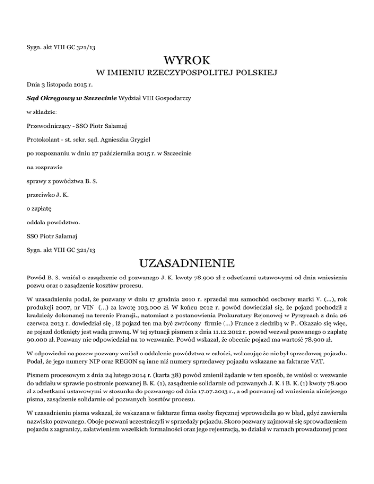 Sygn. akt VIII GC 321/13 WYROK W IMIENIU RZECZYPOSPOLITEJ POLSKIEJ Dnia 3 listopada 2015 r. Sąd Okręgowy w Szczecinie Wydział VIII Gospodarczy w składzie: Przewodniczący - SSO Piotr Sałamaj Protokolant - st. sekr. sąd. Agnieszka Grygiel po rozpoznaniu w dniu 27 października 2015 r. w Szczecinie na rozprawie sprawy z powództwa B. S. przeciwko J. K. o zapłatę oddala powództwo. SSO Piotr Sałamaj Sygn. akt VIII GC 321/13 UZASADNIENIE Powód B. S. wniósł o zasądzenie od pozwanego J. K. kwoty 78.900 zł z odsetkami ustawowymi od dnia wniesienia pozwu oraz o zasądzenie kosztów procesu. W uzasadnieniu podał, że pozwany w dniu 17 grudnia 2010 r. sprzedał mu samochód osobowy marki V. (...), rok produkcji 2007, nr VIN (...) za kwotę 103.000 zł. W końcu 2012 r. powód dowiedział się, że pojazd pochodził z kradzieży dokonanej na terenie Francji., natomiast z postanowienia Prokuratury Rejonowej w Pyrzycach z dnia 26 czerwca 2013 r. dowiedział się , iż pojazd ten ma być zwrócony firmie (...) France z siedzibą w P.. Okazało się więc, ze pojazd dotknięty jest wadą prawną. W tej sytuacji pismem z dnia 11.12.2012 r. powód wezwał pozwanego o zapłatę 90.000 zł. Pozwany nie odpowiedział na to wezwanie. Powód wskazał, że obecnie pojazd ma wartość 78.900 zł. W odpowiedzi na pozew pozwany wniósł o oddalenie powództwa w całości, wskazując że nie był sprzedawcą pojazdu. Podał, że jego numery NIP oraz REGON są inne niż numery sprzedawcy pojazdu wskazane na fakturze VAT. Pismem procesowym z dnia 24 lutego 2014 r. (karta 38) powód zmienił żądanie w ten sposób, że wniósł o: wezwanie do udziału w sprawie po stronie pozwanej B. K. (1), zasądzenie solidarnie od pozwanych J. K. i B. K. (1) kwoty 78.900 zł z odsetkami ustawowymi w stosunku do pozwanego od dnia 17.07.2013 r., a od pozwanej od wniesienia niniejszego pisma, zasądzenie solidarnie od pozwanych kosztów procesu. W uzasadnieniu pisma wskazał, że wskazana w fakturze firma osoby fizycznej wprowadziła go w błąd, gdyż zawierała nazwisko pozwanego. Oboje pozwani uczestniczyli w sprzedaży pojazdu. Skoro pozwany zajmował się sprowadzeniem pojazdu z zagranicy, załatwieniem wszelkich formalności oraz jego rejestracją, to działał w ramach prowadzonej przez niego działalności - komisu samochodowego. Nadto pozwany na żadnym etapie realizacji umowy nie poinformował powoda, że jako sprzedawca pojazdu zostanie wskazana jego małżonka. Postanowieniem z dnia 6 czerwca 2014 r. Sąd Okręgowy w Szczecinie na podstawie art. 194 § 1 k.p.c. wezwał do udziału w sprawie w charakterze pozwanej B. K. (1). Wyrokiem zaocznym częściowym z dnia 22 października 2014 r. Sąd Okręgowy w Szczecinie zasądził od pozwanej B. K. (1) na rzecz powoda kwotę 78.900 zł z ustawowymi odsetkami od dnia 24 lutego 2014 r. oraz kwotę 7.562 zł tytułem kosztów procesu oraz nadał wyrokowi rygor natychmiastowej wykonalności. Powyższy wyrok uprawomocnił się z dniem 16.09.2015 r. Sąd ustalił następujący stan faktyczny: Pozwany J. K. prowadzi działalność gospodarczą pod nazwą Firma Handlowa (...): (...) K. J. od 1 stycznia 2007 r., pod numerem NIP (...) oraz REGON (...). Głównym przedmiotem działalności pozwanego jest sprzedaż hurtowa i detaliczna samochodów osobowych i furgonetek. Pozwany prowadzi działalność gospodarczą pod adresami ul. (...), (...)-(...) M. (adres głównego miejsca wykonywania działalności gospodarczej) oraz przy ul. (...) w P.. Pozwana B. K. (1) prowadzi działalność gospodarczą pod firmą (...) - (...): (...) od 2 stycznia 1992 r., pod numerem NIP (...) oraz REGON (...). Głównym przedmiotem działalności pozwanej jest sprzedaż hurtowa i detaliczna samochodów osobowych i furgonetek. Pozwana prowadzi działalność gospodarczą pod adresami: ul. (...), (...)-(...) M. (adres głównego miejsca wykonywania działalności gospodarczej) oraz przy ul. (...) w P.. (dowód: wydruki z (...) k. 7, k. 43) Powód B. S. poszukiwał pojazdu, który mógłby wykorzystywać w prowadzonej działalności gospodarczej, z uwagi na problemy z dotychczas używanym. Powód znał J. K. i zwrócił się do niego z prośbą o pomoc w sprowadzeniu konkretnej marki samochodu. Po bezskutecznej próbie znalezienia pojazdu, pozwany zaproponował powodowi zakup w atrakcyjnej cenie samochodu osobowego marki V. (...). Pozwany oświadczył, że zajmie się formalnościami związanymi z uzyskaniem przez powoda kredytu na zakup pojazdu oraz dopełni wszystkich formalności, łącznie z zarejestrowaniem pojazdu. (dowód: protokół przesłuchania świadka w postępowaniu karnym k. 45, zeznania świadka E. S. (1) k. 92, od 00:18:07 do 00:27:39) W dniu 17 grudnia 2010 r. powód zakupił od B. K. (1) prowadzącej działalność gospodarczą pod firmą (...) - (...) samochód osobowy marki V. (...), rok produkcji 2007, nr VIN (...) za kwotę 103.000 zł. Pojazd został wydany powodowi z jednym kluczykiem. Powód zgłosił pozwanemu J. K. tę kwestię, a pozwany obiecał, że zapasowy kluczyk do pojazdu zostanie przesłany. (dowód: faktura VAT nr (...) k. 8, wydruk z (...) k. 43, zeznania świadka E. S. k. 92, od 00:18:07 do 00:27:39) W drugiej połowie roku 2012 okazało się, że pojazd zakupiony przez powoda pochodził z kradzieży. W toku czynności podejmowanych przez Komendę Miejską Policji w S. w dniu 22 listopada 2012 r. przesłuchano powoda w charakterze świadka. Według sporządzonej w dniu 28.12.2012 r., na zlecenie Komendy Powiatowej Policji w P., opinii wydanej na podstawie badań mechanoskopijnych numer identyfikacyjny VIN nadwozia samochodu V. (...), nr rej. (...), o treści (...) nie nosi widocznych śladów przerabiania, ma cechy wykonania fabrycznego; również nr silnika (...) nie nosi widocznych śladów przerabiania i ma cechy wykonania fabrycznego. Postanowieniem z dnia 26 czerwca 2013 r. Prokurator Prokuratury Rejonowej w Pyrzycach postanowił dowody rzeczowe w post