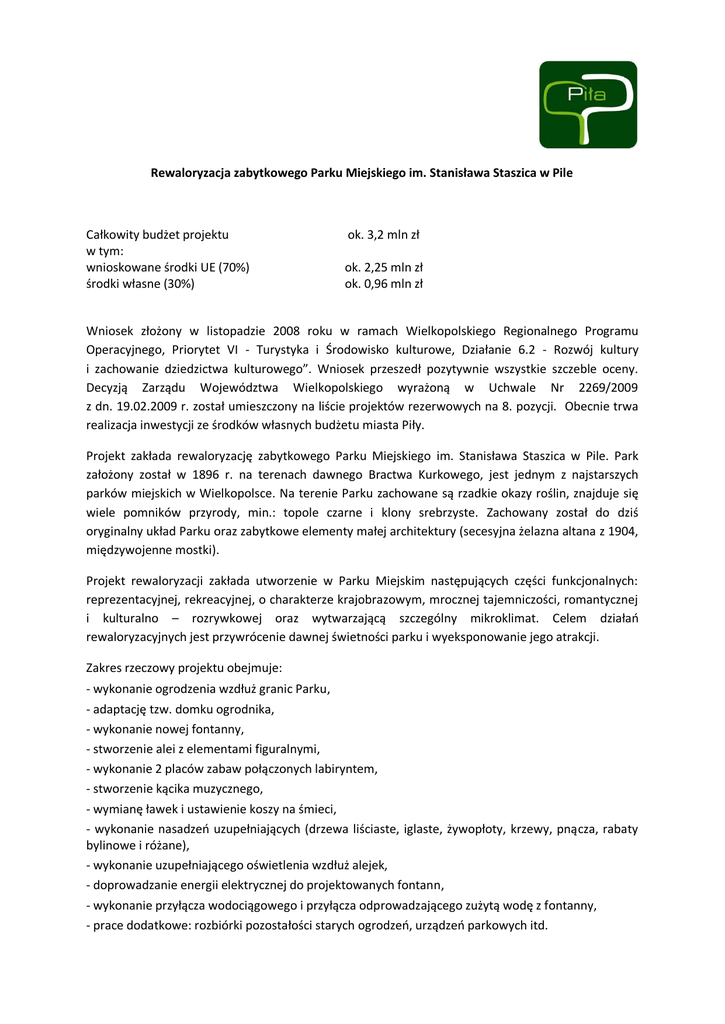 Rewaloryzacja zabytkowego Parku Miejskiego im. Stanisława Staszica w Pile Całkowity budżet projektu w tym: wnioskowane środki UE (70%) środki własne (30%) ok. 3,2 mln zł ok. 2,25 mln zł ok. 0,96 mln zł Wniosek złożony w listopadzie 2008 roku w ramach Wielkopolskiego Regionalnego Programu Operacyjnego, Priorytet VI - Turystyka i Środowisko kulturowe, Działanie 6.2 - Rozwój kultury i zachowanie dziedzictwa kulturowego”. Wniosek przeszedł pozytywnie wszystkie szczeble oceny. Decyzją Zarządu Województwa Wielkopolskiego wyrażoną w Uchwale Nr 2269/2009 z dn. 19.02.2009 r. został umieszczony na liście projektów rezerwowych na 8. pozycji. Obecnie trwa realizacja inwestycji ze środków własnych budżetu miasta Piły. Projekt zakłada rewaloryzację zabytkowego Parku Miejskiego im. Stanisława Staszica w Pile. Park założony został w 1896 r. na terenach dawnego Bractwa Kurkowego, jest jednym z najstarszych parków miejskich w Wielkopolsce. Na terenie Parku zachowane są rzadkie okazy roślin, znajduje się wiele pomników przyrody, min.: topole czarne i klony srebrzyste. Zachowany został do dziś oryginalny układ Parku oraz zabytkowe elementy małej architektury (secesyjna żelazna altana z 1904, międzywojenne mostki). Projekt rewaloryzacji zakłada utworzenie w Parku Miejskim następujących części funkcjonalnych: reprezentacyjnej, rekreacyjnej, o charakterze krajobrazowym, mrocznej tajemniczości, romantycznej i kulturalno – rozrywkowej oraz wytwarzającą szczególny mikroklimat. Celem działao rewaloryzacyjnych jest przywrócenie dawnej świetności parku i wyeksponowanie jego atrakcji. Zakres rzeczowy projektu obejmuje: - wykonanie ogrodzenia wzdłuż granic Parku, - adaptację tzw. domku ogrodnika, - wykonanie nowej fontanny, - stworzenie alei z elementami figuralnymi, - wykonanie 2 placów zabaw połączonych labiryntem, - stworzenie kącika muzycznego, - wymianę ławek i ustawienie koszy na śmieci, - wykonanie nasadzeo uzupełniających (drzewa liściaste, iglaste, żywopłoty, krzewy, pnącza, rabaty bylinowe i różane), - wykonanie uzupełniającego oświetlenia wzdłuż alejek, - doprowadzanie energii elektrycznej do projektowanych fontann, - wykonanie przyłącza wodociągowego i przyłącza odprowadzającego zużytą wodę z fontanny, - prace dodatkowe: rozbiórki pozostałości starych ogrodzeo, urządzeo parkowych itd. Celem rewaloryzacji zabytkowego Parku Miejskiego im. Stanisława Staszica w Pile przywrócenie mu atrakcyjności oraz zabezpieczenie zabytkowych elementów małej architektury i rzadkich okazów roślin przed aktami wandalizmu. Park po realizacji przedsięwzięcia stałby się wizytówką Piły, zwiększając atrakcyjnośd turystyczna miasta, przede wszystkim jednak poszerzy ofertę rekreacyjną dla swych mieszkaoców. Skutkiem zniszczeo wojennych jest mała ilośd zabytków na terenie miasta, dlatego przywrócenie Parkowi dawnej świetności jest takie istotne. Ze względu na planowane organizowanie w zbudowanym kąciku muzycznym koncertów, realizacja projektu poszerzy także ofertę kulturalną Piły.