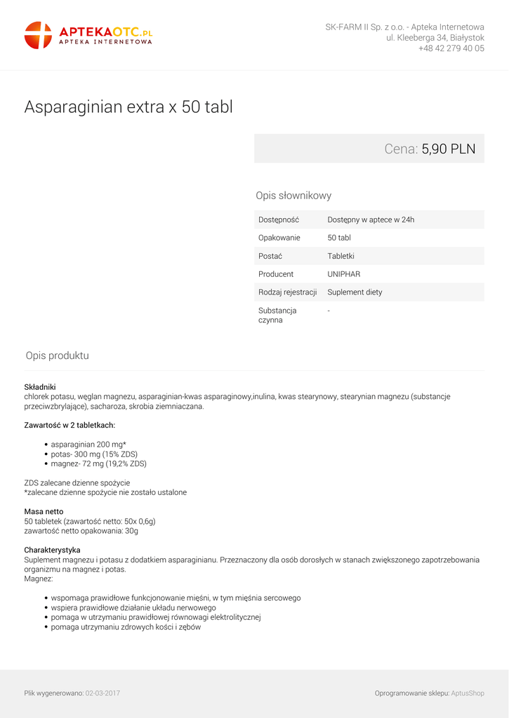 SK-FARM II Sp. z o.o. - Apteka Internetowa ul. Kleeberga 34, Białystok +48 42 279 40 05 Asparaginian extra x 50 tabl Cena: 5,90 PLN Opis słownikowy Dostępność Dostępny w aptece w 24h Opakowanie 50 tabl Postać Tabletki Producent UNIPHAR Rodzaj rejestracji Suplement diety Substancja czynna - Opis produktu Składniki chlorek potasu, węglan magnezu, asparaginian-kwas asparaginowy,inulina, kwas stearynowy, stearynian magnezu (substancje przeciwzbrylające), sacharoza, skrobia ziemniaczana. Zawartość w 2 tabletkach: asparaginian 200 mg* potas- 300 mg (15% ZDS) magnez- 72 mg (19,2% ZDS) ZDS zalecane dzienne spożycie *zalecane dzienne spożycie nie zostało ustalone Masa netto 50 tabletek (zawartość netto: 50x 0,6g) zawartość netto opakowania: 30g Charakterystyka Suplement magnezu i potasu z dodatkiem asparaginianu. Przeznaczony dla osób dorosłych w stanach zwiększonego zapotrzebowania organizmu na magnez i potas. Magnez: wspomaga prawidłowe funkcjonowanie mięśni, w tym mięśnia sercowego wspiera prawidłowe działanie układu nerwowego pomaga w utrzymaniu prawidłowej równowagi elektrolitycznej pomaga utrzymaniu zdrowych kości i zębów Plik wygenerowano: 02-03-2017 Oprogramowanie sklepu: AptusShop SK-FARM II Sp. z o.o. - Apteka Internetowa ul. Kleeberga 34, Białystok +48 42 279 40 05 Potas: pomaga w prawidłowym funkcjonowaniu układu nerwowo-mięśniowego pomaga w utrzymaniu prawidłowego ciśnienia krwi Przeciwwskazania Nie stosować w niewydolności nerek, podczas antybiotykoterapii, w czasie biegunki. Stosowanie Stosować 2 razy dziennie po 1 tabletce. Przechowywanie Preparat należy przechowywać w temperaturze pokojowej (15-25°C), w suchym miejscu, niedostępnym dla małych dzieci. Chronić przed wilgocią i światłem. Producent UNIPHAR Sp. z o.o. Bażancia 34, 02-892 Warszawa Informacje dodatkowe Suplementy diety nie mogą być stosowane jako substytut (zamiennik) zróżnicowanej diety ani zdrowego trybu życia. Nie należy przekraczać zalecanej porcji produktu do spożycia w ciągu dnia. Suplementy diety powinny być przechowywane w sposób niedostępny dla małych dzieci. Przed zastosowaniem produktu sugerujemy zapoznanie się z dokładnymi informacjami podanymi na opakowaniu lub załączonej ulotce. Służymy Państwu pomocą pod adresem [email protected]. Plik wygenerowano: 02-03-2017 Powered by TCPDF (www.tcpdf.org) Oprogramowanie sklepu: AptusShop