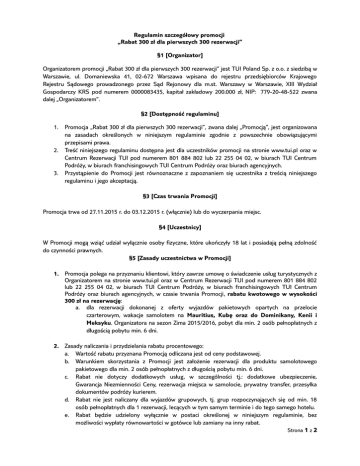 Regulamin szczegółowy promocji „Rabat 300 zł dla pierwszych 300 rezerwacji” §1 [Organizator] Organizatorem promocji „Rabat 300 zł dla pierwszych 300 rezerwacji” jest TUI Poland Sp. z o.o. z siedzibą w Warszawie, ul. Domaniewska 41, 02-672 Warszawa wpisana do rejestru przedsiębiorców Krajowego Rejestru Sądowego prowadzonego przez Sąd Rejonowy dla m.st. Warszawy w Warszawie, XIII Wydział Gospodarczy KRS pod numerem 0000083435, kapitał zakładowy 200.000 zł, NIP: 779-20-48-522 zwana dalej „Organizatorem”. §2 [Dostępność regulaminu] 1. Promocja „Rabat 300 zł dla pierwszych 300 rezerwacji”, zwana dalej „Promocją”, jest organizowana na zasadach określonych w niniejszym regulaminie zgodnie z powszechnie obowiązującymi przepisami prawa. 2. Treść niniejszego regulaminu dostępna jest dla uczestników promocji na stronie www.tui.pl oraz w Centrum Rezerwacji TUI pod numerem 801 884 802 lub 22 255 04 02, w biurach TUI Centrum Podróży, w biurach franchisingowych TUI Centrum Podróży oraz biurach agencyjnych. 3. Przystąpienie do Promocji jest równoznaczne z zapoznaniem się uczestnika z treścią niniejszego regulaminu i jego akceptacją. §3 [Czas trwania Promocji] Promocja trwa od 27.11.2015 r. do 03.12.2015 r. (włącznie) lub do wyczerpania miejsc. §4 [Uczestnicy] W Promocji mogą wziąć udział wyłącznie osoby fizyczne, które ukończyły 18 lat i posiadają pełną zdolność do czynności prawnych. §5 [Zasady uczestnictwa w Promocji] 1. Promocja polega na przyznaniu klientowi, który zawrze umowę o świadczenie usług turystycznych z Organizatorem na stronie www.tui.pl oraz w Centrum Rezerwacji TUI pod numerem 801 884 802 lub 22 255 04 02, w biurach TUI Centrum Podróży, w biurach franchisingowych TUI Centrum Podróży oraz biurach agencyjnych, w czasie trwania Promocji, rabatu kwotowego w wysokości 300 zł na rezerwację: a. dla rezerwacji dokonanej z oferty wyjazdów pakietowych opartych na przelocie czarterowym, wakacje samolotem na Mauritius, Kubę oraz do Dominikany, Kenii i Meksyku. Organizatora na sezon Zima 2015/2016, pobyt dla min. 2 osób pełnopłatnych z długością pobytu min. 6 dni. 2. Zasady naliczania i przydzielania rabatu procentowego: a. Wartość rabatu przyznana Promocją odliczana jest od ceny podstawowej. b. Warunkiem skorzystania z Promocji jest założenie rezerwacji dla produktu samolotowego pakietowego dla min. 2 osób pełnopłatnych z długością pobytu min. 6 dni. c. Rabat nie dotyczy dodatkowych usług, w szczególności tj.: dodatkowe ubezpieczenie, Gwarancja Niezmienności Ceny, rezerwacja miejsca w samolocie, prywatny transfer, przesyłka dokumentów podróży kurierem. d. Rabat nie jest naliczany dla wyjazdów grupowych, tj. grup rozpoczynających się od min. 18 osób pełnopłatnych dla 1 rezerwacji, lecących w tym samym terminie i do tego samego hotelu. e. Rabat będzie udzielony wyłącznie w postaci określonej w niniejszym regulaminie, bez możliwości wypłaty równowartości w gotówce lub zamiany na inny rabat. Strona 1 z 2 3. Promocja nie łączy się z promocją „Najtaniej w First Minute® - Lato 2016 – III etap”., „7% rabat First Minute® - Wakacje Samochodem Lato 2016– III etap”, 4. Uczestnictwo w Promocji jest dobrowolne. §6 [Skutki zmiany rezerwacji] 1. W przypadku rezygnacji z imprezy turystycznej przez uczestnika Promocji, zastosowanie mają postanowienia umowy o świadczenie usług turystycznych oraz Warunki Imprez Turystycznych Organizatora. 2. W przypadku rozwiązania umowy o świadczenie usług turystycznych z przyczyn leżących po stronie Organizatora uczestnicy nabywają prawo do zachowania korzyści wynikających z Promocji, ale zgodnych z postanowieniami niniejszego regulaminu. Rabat jest naliczany od cen podstawowych dostępnych dla klienta na www.tui.pl przy alternatywnej propozycji zaproponowanej przez Organizatora. 3. W przypadku zmian rezerwacji dokonywanych przez uczestnika Promocji zastosowanie mają postanowienia umowy o świadczenie usług turystycznych oraz Warunki Imprez Turystycznych Organizatora. Przyznany klientowi rabat na podstawie niniejszego regulaminu w momencie zawarcia umowy o świadczenie usług turystycznych i obliczany jest od wartości rezerwacji po zmianach. §7 [Reklamacje] 1. Wszystkie roszczenia, reklamacje, uwagi i zastrzeżenia do przebiegu Promocji można składać wyłącznie pisemnie na adres Organizatora: ul. Domaniewska 41, 02-672 Warszawa przez cały czas trwania Promocji, nie później jednak niż w terminie 14 dni od dnia zakończenia Promocji (o rozpatrzeniu reklamacji decyduje data stempla pocztowego). 2. Reklamacja powinna zawierać: imię, nazwisko, adres, jak również dokładny opis i powód reklamacji. 3. Reklamacje złożone po upływie terminu, o którym mowa w ust. 1 powyżej nie będą rozpatrywane. 4. Reklamacje Organizator rozpatruje w terminie 14 dni od dnia ich otrzymania. Reklamacje będą rozpatrywane w oparciu o postanowienia niniejszego regulaminu. Uczestnik zostanie poinformowany o decyzji Organizatora na adres wskazany w reklamacji. §8 [Postanowienia końcowe] 1. Administratorem danych osobowych jest Organizator. 2. Organizator informuje uczestników, że ich dane osobowe będą przetwarzane wyłącznie w związku z wykonaniem postanowień niniejszego regulaminu, w celu przeprowadzenia Promocji. 3. Uczestnicy mają prawo dostępu do treści swoich danych osobowych oraz do ich poprawiania. Podanie danych osobowych w celu realizacji Promocji jest dobrowolne, choć niezbędne dla prawidłowego przeprowadzenia Promocji. 4. Niniejszy regulamin wchodzi w życie z dniem 27.11.2015r. Strona 2 z 2