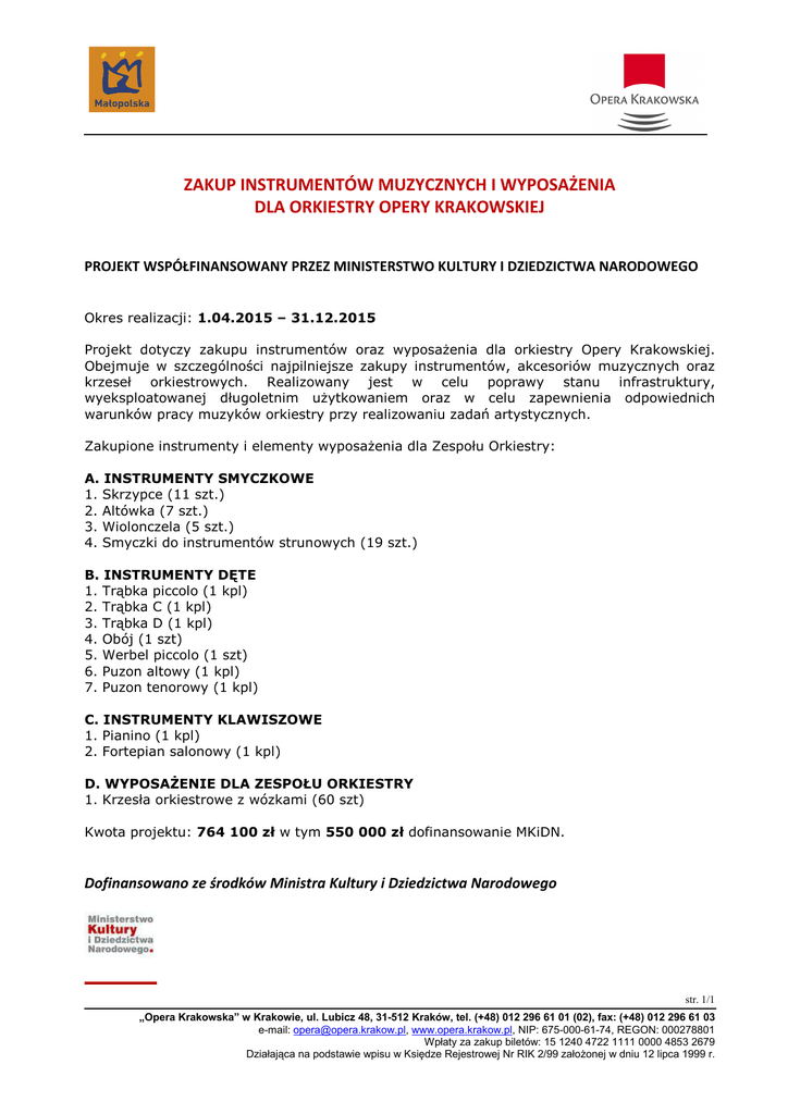 ZAKUP INSTRUMENTÓW MUZYCZNYCH I WYPOSAŻENIA DLA ORKIESTRY OPERY KRAKOWSKIEJ PROJEKT WSPÓŁFINANSOWANY PRZEZ MINISTERSTWO KULTURY I DZIEDZICTWA NARODOWEGO Okres realizacji: 1.04.2015 – 31.12.2015 Projekt dotyczy zakupu instrumentów oraz wyposażenia dla orkiestry Opery Krakowskiej. Obejmuje w szczególności najpilniejsze zakupy instrumentów, akcesoriów muzycznych oraz krzeseł orkiestrowych. Realizowany jest w celu poprawy stanu infrastruktury, wyeksploatowanej długoletnim użytkowaniem oraz w celu zapewnienia odpowiednich warunków pracy muzyków orkiestry przy realizowaniu zadań artystycznych. Zakupione instrumenty i elementy wyposażenia dla Zespołu Orkiestry: A. INSTRUMENTY SMYCZKOWE 1. Skrzypce (11 szt.) 2. Altówka (7 szt.) 3. Wiolonczela (5 szt.) 4. Smyczki do instrumentów strunowych (19 szt.) B. INSTRUMENTY DĘTE 1. Trąbka piccolo (1 kpl) 2. Trąbka C (1 kpl) 3. Trąbka D (1 kpl) 4. Obój (1 szt) 5. Werbel piccolo (1 szt) 6. Puzon altowy (1 kpl) 7. Puzon tenorowy (1 kpl) C. INSTRUMENTY KLAWISZOWE 1. Pianino (1 kpl) 2. Fortepian salonowy (1 kpl) D. WYPOSAŻENIE DLA ZESPOŁU ORKIESTRY 1. Krzesła orkiestrowe z wózkami (60 szt) Kwota projektu: 764 100 zł w tym 550 000 zł dofinansowanie MKiDN. Dofinansowano ze środków Ministra Kultury i Dziedzictwa Narodowego str. 1/1 „Opera Krakowska” w Krakowie, ul. Lubicz 48, 31-512 Kraków, tel. (+48) 012 296 61 01 (02), fax: (+48) 012 296 61 03 e-mail: [email protected], www.opera.krakow.pl, NIP: 675-000-61-74, REGON: 000278801 Wpłaty za zakup biletów: 15 1240 4722 1111 0000 4853 2679 Działająca na podstawie wpisu w Księdze Rejestrowej Nr RIK 2/99 założonej w dniu 12 lipca 1999 r.