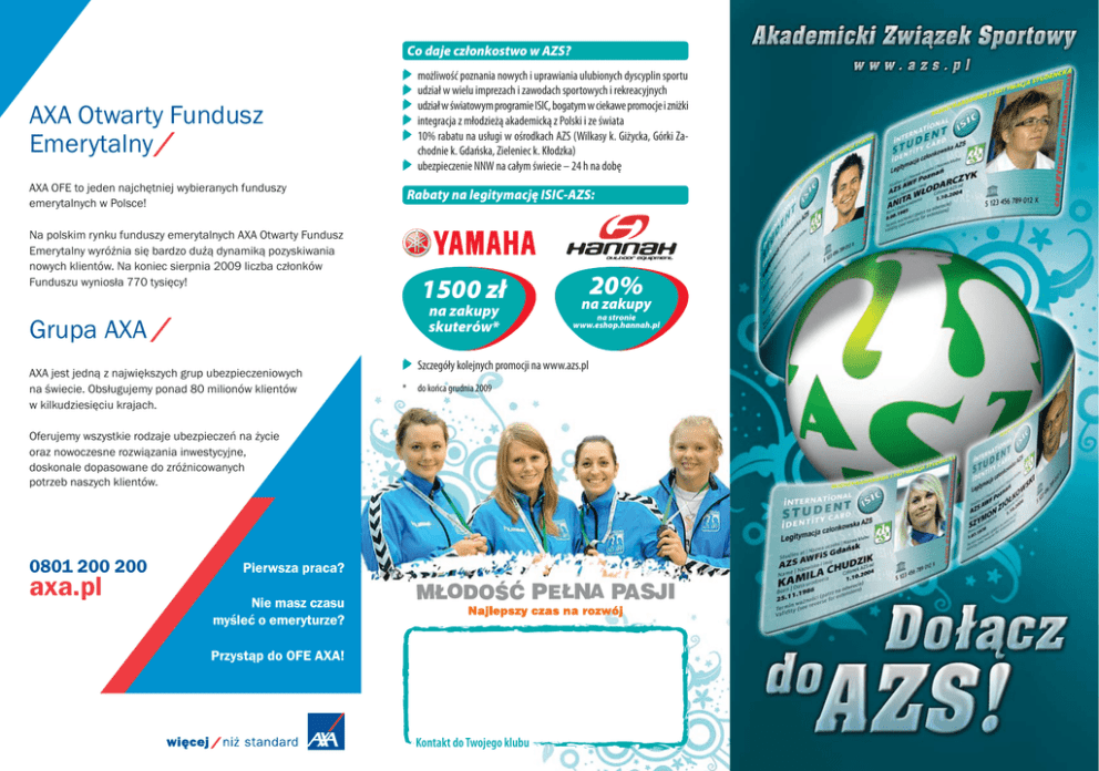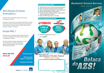 Co daje członkostwo w AZS? AXA Otwarty Fundusz Emerytalny B B B B B możliwość poznania nowych i uprawiania ulubionych dyscyplin sportu udział w wielu imprezach i zawodach sportowych i rekreacyjnych udział w światowym programie ISIC, bogatym w ciekawe promocje i zniżki integracja z młodzieżą akademicką z Polski i ze świata 10% rabatu na usługi w ośrodkach AZS (Wilkasy k. Giżycka, Górki Zachodnie k. Gdańska, Zieleniec k. Kłodzka) B ubezpieczenie NNW na całym świecie – 24 h na dobę AXA OFE to jeden najchętniej wybieranych funduszy emerytalnych w Polsce! Rabaty na legitymację ISIC-AZS: Na polskim rynku funduszy emerytalnych AXA Otwarty Fundusz Emerytalny wyróżnia się bardzo dużą dynamiką pozyskiwania nowych klientów. Na koniec sierpnia 2009 liczba członków Funduszu wyniosła 770 tysięcy! 1500 zł na zakupy skuterów* Grupa AXA AXA jest jedną z największych grup ubezpieczeniowych na świecie. Obsługujemy ponad 80 milionów klientów w kilkudziesięciu krajach. axa.pl na stronie www.eshop.hannah.pl B Szczegóły kolejnych promocji na www.azs.pl * do końca grudnia 2009 Oferujemy wszystkie rodzaje ubezpieczeń na życie oraz nowoczesne rozwiązania inwestycyjne, doskonale dopasowane do zróżnicowanych potrzeb naszych klientów. 0801 200 200 20% na zakupy Pierwsza praca? Nie masz czasu myśleć o emeryturze? Przystąp do OFE AXA! Kontakt do Twojego klubu 100 lat Akademickiego Związku Sportowego w Polsce ISIC dla Ciebie! Rok akademicki 2008/2009 był dla Akademickiego Związku Sportowego rokiem obchodów setnej rocznicy powstania. W ramach jubileuszu odbyła się międzynarodowa konferencja Forum FISU (Kraków, lipiec 2008 r.), a grupa młodych członków naszego stowarzyszenia w ramach Sztafety przez Polskę przemierzyła 2000 km, docierając z Babiej Góry do Warszawy (maj 2009 r.). W murach Politechniki Warszawskiej odbyła się Gala 100-lecia AZS – kulminacja jubileuszowych obchodów. AZS powstał w Krakowie, stamtąd rozprzestrzenił się na niemal wszystkie ośrodki akademickie w Polsce i liczy obecnie ponad 50 tys. członków. Działa nieprzerwanie od wieku, mając za swój główny cel zaszczepienie w studentach zamiłowania do sportu i promocję aktywnego sposobu życia. AZS prowadzi działalność w zakresie sportu powszechnego i wyczynowego. W ramach sportu powszechnego od prawie 50 lat organizujemy Mistrzostwa Polski Szkół Wyższych (od 2008 roku pod nazwą Akademickie Mistrzostwa Polski), które propagują sport wśród społeczności akademickiej (Kluby Uczelniane AZS działają dziś w około 300 szkołach wyższych). Chcąc popularyzować nowe, szerzej nieznane dyscypliny organizujemy Puchary Zarządu Głównego AZS (m.in. w futsalu kobiet i biczsokerze) oraz sportowe festiwale. AZS – jako członek Międzynarodowej Organizacji Sportu Studenckiego (FISU) i Europejskiej Federacji Sportu Studenckiego (EUSA) – bierze też udział w systemie światowej rywalizacji. Startujemy w akademickich mistrzostwach Europy (wciąż jesteśmy w ścisłej czołówce rankingu krajowego), akademickich mistrzostwach świata, a także w największych imprezach sportowych dla studentów: uniwersjadach. W 2009 r. w Zimowej Uniwersjadzie w Harbinie i w Letniej Uniwersjadzie w Belgradzie Polacy wywalczyli w sumie 38 medali. Naszą wizytówką jest jednak sport wyczynowy. Członkowie AZS – gwiazdy światowego sportu – sięgają po najwyższe laury w czasie najważniejszych imprez. W ostatnich latach triumfy święcą azetesiacy: Adam Korol, Marek Kolbowicz, Michał Jeliński, Konrad Wasielewski (wioślarstwo), Justyna Kowalczyk (narciarstwo klasyczne), Leszek Blanik (gimnastyka sportowa), Paweł Korzeniowski i Otylia Jędrzejczak (pływanie), czy też lekkoatleci, medaliści ostatnich Mistrzostw Świata w Berlinie – Agnieszka Włodarczyk i Szymon Ziółkowski (rzut młotem), Tomasz Majewski (pchnięcie kulą), Kamila Chudzik (siedmiobój) i wielu innych. ISIC (International Student Identity Card) Jedyny dokument potwierdzający status ucznia i studenta na całym świecie. Gwarantuje dostęp do kilkudziesięciu tysięcy zniżek na całym świecie, w tym ponad 5000 w Polsce. ISIC, uznawany w 120 krajach świata, przysługuje wszystkim studentom bez ograniczenia wieku oraz uczniom szkół średnich i gimnazjów powyżej 12. roku życia. Każdego roku korzysta z niego około 10 milionów osób. Sprawde, czy Twoje picie jest bezpieczne: www.wyhamujwpore.pl Zniżki w Polsce Pizza Dominium B 15% B 40% na pizzę w restauracjach językowe w szkow kawiarniach Coffee Heaven B 15% na kursy usługi SkiTeam na 35% i t łach EMPIK B 10% na asortymen asortyment na 20% n B 10% na produkty HiMountai B Spark – Microsoft Springfield B bezpłatne oprogramowanie Dream transport, Kilkadziesiąt tysięcy zniżek na świecie. m cały na g usłu le bilety wstępu i wie Dodatkowy pakiet ubezpieczeniowy* już od 35 zł!!! Każdy członek AZS może na podstawie ważnej legitymacji ISIC-AZS wykupić za 35 zł specjalny pakiet ubezpieczeniowy (na cały okres ważności swojej legitymacji), obejmujący: B koszty leczenia (250 000 zł) i następstwa nieszczęśliwych wypadków (25 000 zł) za granicą (z wyłączeniem USA, Kanady, Australii i Japonii). Wykupując powyższy pakiet, masz możliwość nabyć za dodatkową opłatą także rozszerzenie ubezpieczenia: B na terenie USA, Kanady, Australii i Japonii (dopłata 70 zł), B w zakresie uprawiania sportów ekstremalnych i odpowiedzialności cywilnej w życiu prywatnym (dopłata 40 zł). Ochronę ubezpieczeniową w ramach opisanego pakietu zapewnia * tylko dla posiadaczy ISIC-AZS Szukaj informacji na stronach: www.isic.pl www.azs.pl
