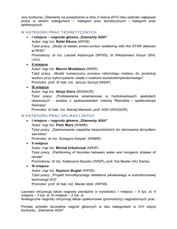 Jury konkursu „Diamenty na posiedzeniu w dniu 2 marca 2015 roku wybrało najlepsze prace w dwóch kategoriach – kategorii prac teoretycznych i kategorii prac aplikacyjnych. W KATEGORII PRAC TEORETYCZNYCH I miejsce – nagroda główna „Diamenty AGH” Autor: mgr inż. Rafał Sikora (WFiIS) Tytuł pracy: „Study of elastic proton-proton scattering with the STAR detector at RHIC” Promotorzy: dr inż. Leszek Adamczyk (WFiIS), dr Włodzimierz Guryn (BNL USA) II miejsce Autor: mgr inż. Marcin Moździerz (WEiP) Tytuł pracy: „Model numeryczny procesu reformingu metanu do produkcji wodoru przy wykorzystaniu ciepła z reaktora wysokotemperaturowego” Promotor: prof. dr hab. inż. Janusz Szmyd (WEiP) III miejsce Autor: mgr inż. Alicja Giera (WGGiOŚ) Tytuł pracy: „Podstawienia arsenianowe w hydroksylowych apatytach ołowiowych - analiza z zastosowaniem metody Rietvelda i spektroskopii Ramana” Promotor: dr hab. inż. Maciej Manecki, prof. AGH (WGGiOŚ) W KATEGORII PRAC APLIKACYJNYCH I miejsce – nagroda główna „Diamenty AGH” Autor: mgr inż. Piotr Mars (WIMiR) Tytuł pracy: „Zastosowanie napędów bezpośrednich do sterowania skrzydłem samolotu” Promotor: dr inż. Grzegorz Karpiel (WIMiR) II miejsce Autor: mgr inż. Michał Urbańczyk (WEiP) Tytuł pracy: „Partitioning of biocides between water and inorganic phases of render” Promotorzy: dr inż. Katarzyna Styszko (WEiP), prof. Kai Bester (AU Dania) III miejsce Autor: mgr inż. Szymon Bugiel (WFiIS) Tytuł pracy: „Projekt monolitycznego detektora pikselowego w submikronowej technologii SOI” Promotor: prof. dr hab. inż. Marek Idzik (WFiIS) Laureaci otrzymują także nagrody pieniężne w wysokości: I miejsce – 5 tys. zł, II miejsce – 3 tys. zł, III miejsce – 2 tys. zł. Analogiczne nagrody otrzymują także opiekunowie (promotorzy) nagrodzonych prac. Poniżej sylwetki laureatów nagród głównych w obu kategoriach w XVI edycji konkursu „Diamenty AGH”. Piotr Mars urodził się 30 maja 1989 roku w Krakowie. Uczęszczał do klasy o profilu telekomunikacyjnym w Technikum Łączności nr 14 w Zespole Szkół Łączności w Krakowie. Podczas nauki w technikum osiągnął liczne sukcesyw olimpiadach. Został m. in.: laureatem XXXIV Ogólnopolskiej Olimpiady Wiedzy Technicznej w grupie elektryczno -elektronicznej, finalistą X Olimpiady Elektrycznej i Elektronicznej „Euroelektra” w grupie elektrycznej oraz finalistą XXXI Ogólnopolskiej Olimpiady Wiedzy Elektrycznej i Elektronicznej w grupie elektrycznej. Za wybitne osiągnięcia naukowe podczas nauki w technikum otrzymał Stypendia: Ministra Edukacji Narodowej, Małopolskiego Programu Stypendialnego Dla Uczniów Szczególnie Uzdolnionych oraz Nagrodę Edukacyjną Stołecznego Królewskiego Miasta Krakowa. W 2009 roku rozpoczął studia I stopnia na Wydziale Inżynierii Mechanicznej i Robotyki na kierunku Mechatronika. Praca inżynierska Piotra Marsa dotyczyła projektu koncepcyjnego efektora mobilnego robota kołowego, którego później wykonał w ramach pracy w projekcie „Łazika Marsjańskiego” realizowanego przez koło naukowe INTEGRA. W roku akademickim 2012/2013 zaczął studia II stopnia na kierunku Mechatronika specjalizując się w dziedzinie wytwarzania mechatronicznego. W października 2013 roku rozpoczął działania pod kątem swojej pracy magisterskiej, gdzie współpracował ze znanym konstruktorem samolotów, Panem Edwardem Margańskim. Przez cały okres studiów I i II stopnia otrzymywał stypendium rektora za wysoką średnią ocen. Oba stopnie studiów ukończył z wyróżnieniem summa cum laude. W 2014 zaczął studia doktoranckie na tym samym wydziale. W trakcie studiów przez rok był na stażu w Korporacyjnym Centrum Badawczym ABB Sp. z. o.o. zapoczątkowanym dwumiesięczną praktyką studencką w fabryce transformatorów łódzkiego oddziału firmy ABB. Podczas stażu i praktyki zajmował się projektowaniem prostych elementów konstrukcyjnych oraz budową prototypów urządzeń do aplikacji średnio-napięciowych. Piotr Mars aktualnie zajmuj się techniką napędów bezpośrednich, zarówno do strony mechanicznej budowy, jak i układów elektronicznych oraz algorytmów sterowania. W grudniu 2014 roku wziął udział w ogólnopolskiej konferencji naukowej Nowe trendy w naukach inżynieryjnych, gdzie prezentował temat Zastosowanie napędów bezpośrednich w urządzeniach mechatronicznych. W wolnych chwilach ćwiczy na siłowni, czyta książki kryminalne i fantastykę. Resztę czasu poświęca swoim bliskim. Interesuje się kulturystyką oraz lubi podróżować. Rafał Sikora urodził się 10 listopada 1990 roku w Rybniku. Uczęszczał do II Liceum Ogólnokształcącego im. Andrzeja Frycza Modrzewskiego w Rybniku do klasy o profilu matematyczno-fizycznym, gdzie pod okiem nauczyciela fizyki mgr Romualda Kondysa rozwijał zamiłowanie do nauk ścisłych. W 2009 roku został laureatem LII Olimpiady Astronomicznej oraz uzyskał wyróżnienie na III Międzynarodowej Olimpiadzie Astronomii i Astrofizyki w Teheranie. W tym samym roku rozpoczął studia I stopnia na Wydziale Fizyki i Informatyki Stosowanej na kierunku fizyka techniczna. Dzięki bardzo dobrym wynikom w nauce od trzeciego roku studiów kształcenie kontynuował w toku studiów indywidualnych pod opieką dr hab. inż. Mariusza Przybycienia, prof. AGH. Wtedy też rozpoczął współpracę z dr inż. Leszkiem Adamczykiem, promotorem jego pracy inżynierskiej i magisterskiej. Był to początek zaangażowania w tematykę fizyki wysokich energii, które zaowocowało członkostwem w eksperymencie STAR działającym przy zderzaczu cząstek RHIC w Brookhaven National Laboratory. Rafał Sikora kilkakrotnie odbył staż naukowy pod opieką dr Włodzimierza Guryna w BNL oraz prezentował wyniki swojej pracy na spotkaniach członków kolaboracji. Zainteresowanie astronomią realizował uczestnicząc w projekcie budowy studenckiego satelity księżycowego ESMO prowadzonym prze