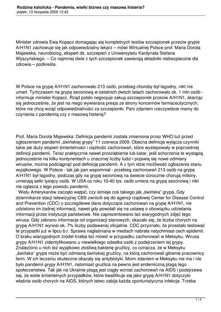 Rodzina katolicka - Pandemia, wielki biznes czy masowa histeria? piątek, 13 listopada 2009 12:42 Minister zdrowia Ewa Kopacz domagając się kompletnych testów szczepionek przeciw grypie A/H1N1 zachowuje się jak odpowiedzialny lekarz – mówi Wirtualnej Polsce prof. Maria Dorota Majewska, neurobiolog, ekspert ds. szczepień z Uniwersytetu Kardynała Stefana Wyszyńskiego. – Co najmniej dwie z tych szczepionek zawierają składniki niebezpieczne dla zdrowia – podkreśla. W Polsce na grypę A/H1N1 zachorowało 213 osób, przebieg choroby był łagodny, nikt nie umarł. Tymczasem na grypę sezonową w ostatnich dwóch latach zachorowało ok. 1 mln osób informuje minister Kopacz. Rząd polski negocjuje zakup szczepionek przeciw A/H1N1, skarżąc się jednocześnie, że jest na niego wywierana presja ze strony koncernów farmaceutycznych, które nie chcą wziąć odpowiedzialności za szczepionki. Pani zdaniem rzeczywiście mamy do czynienia z pandemią czy z masową histerią? Prof. Maria Dorota Majewska: Definicja pandemii została zmieniona przez WHO tuż przed ogłoszeniem pandemii „świńskiej grypy” 11 czerwca 2009. Obecna definicja wyłącza czynniki takie jak duży stopień śmiertelności i ciężkość zachorowań, które wystepowały w poprzedniej definicji pandemii. Teraz praktycznie nawet przeziębienie lub katar, jeśli schorzenia te wystąpią jednocześnie na kilku kontynentach u znacznej liczby ludzi i pojawią się nowe odmiany wirusów, można podciągnąć pod definicję pandemii. A z tym idzie możliwość ogłoszenia stanu wyjątkowego. W Polsce - tak jak pan wspomniał - przebieg zachorowań 213 osób na grypę A/H1N1 był łagodny, podczas gdy na grypę sezonową na świecie corocznie chorują miliony, umierają setki tysięcy osób. W USA co roku 10-40 tys. osób umiera na grypę sezonową i nikt nie ogłasza z tego powodu pandemii. Wielu Amerykanów zaczęło wątpić, czy istnieje coś takiego jak „świńska” grypa. Gdy dziennikarze stacji telewizyjnej CBS zwrócili się do agencji rządowej Center for Disease Control and Prevention (CDC) o szczegółowe dane dotyczące zachorowań na grypę A/H1N1, nie udzielono im żadnej informacji, nawet gdy powołali się na ustawę o obowiązku udzielania informacji przez instytucje państwowe. Nie zaprezentowano też wiarygodnych zdjęć tego wirusa. Gdy zebrano informacje od organizacji stanowych, okazało się, że liczba chorych na grypę A/H1N1 wynosi ok. 7% liczby podawanej oficjalnie. CDC przyznało, że przestało testować te przypadki już w lipcu b.r. Sprawa nagłaśniana w mediach nabrała natychmiast cech epidemii. O braku wiarygodnych źródeł trzeba też mówić w przypadku zachorowań w Meksyku. Wirusa grypy A/H1N1 zidentyfikowano u niewielkiego odsetka osób z podejrzeniem tej grypy. Znaleziono u nich też wyjątkowo złośliwą bakterię gruźlicy, co oznacza, że w Meksyku „świńska” grypa może być odmianą świńskiej gruźlicy, na którą zachorowali głównie pracownicy ferm. W ich leczeniu skuteczne okazały się antybiotyki. Moim zdaniem w Meksyku nie ma i nie było pandemii grypy A/H1N1, natomiast gruźlica na pewno jest endemiczną plagą tego społeczeństwa. Tak jak na Ukrainie plagą jest ciągły wzrost zachorowań na AIDS i podejrzewa się, że wiele śmiertelnych przypadków, które kwalifikuje się jako grypę A/H1N1 dotyczyło właśnie osób chorych na AIDS, których łatwo zabija każda oportunistyczna infekcja. Trzeba 1/4 Rodzina katolicka - Pandemia, wielki biznes czy masowa histeria? piątek, 13 listopada 2009 12:42 jednak przyznać, że nie mamy wiarygodnych danych z Ukrainy odnośnie patogenów, które spowodowały w krótkim czasie śmierć poniosło 14 osób. Polski wiceminister zdrowia Adam Fronczak mówi o sześciu ofiarach śmiertelnych w „kraju, gdzie dokonano dużych zakupów szczepionki przeciw A/H1N1 - chodzi o Szwecję. Rzeczniczka KE ds. zdrowia Nina Papadulaki twierdzi, nie ma żadnych informacji o potwierdzonych przypadkach zgonów w wyniku zastosowania szczepionki przeciwko grypie A/H1N1, dodając jednak, że troje Szwedów - starszych i schorowanych - zmarło w wyniku komplikacji zdrowotnych po podaniu szczepionki. Skąd ten chaos informacyjny? - Mam dużo wątpliwości, gdy czytam alarmujące tytuły w mediach i doniesienia o danych dotyczących grypy A/H1N1, chociażby dlatego, że w niektórych przypadkach opinia publiczna nie dowiaduje się wszystkiego. W Szwecji jest podobno blokada informacji, mówi się o 12 ofiarach śmiertelnych, a na stronie internetowej "theflucase", założonej przez Jane Bugermeister, internauci skarżą się na powszechną cenzurę w tej sprawie. Austriacka dziennikarka medyczna, autorka wielu publikacji naukowych, kieruje bardzo mocne oskarżenia przeciwko koncernom farmaceutycznym, za co zapłaciła m.in. utratą pracy. Złożyła w tym roku pozew przeciwko amerykańskiej firmie Baxter o to, że z centrum badawczego tej firmy w Austrii wysłano do kilku europejskich krajów szczepionki przeciw grypie sezonowej zakażone wirusem ptasiej grypy, co mogło skończyć się ogólnoeuropejską pandemią. Sprawa wyszła na jaw w lutym 2009 r. w laboratorium w Czechach i wzbudziła wiele kontrowersji w mediach. Firma utrzymuje, że był to ludzki błąd, niegroźny w skutkach dla ludzi, ale faktem jest, że fretki, na których wypróbowano zakażoną szczepionkę zmarły we wspomnianym laboratorium, a wobec firmy nie wyciągnięto żadnych konsekwencji. Prokuratura austriacka umorzyła sprawę. Bugermeister uważa, że celowo zatruto 72 kilo szczepionki, by WHO mogła ogłosić pandemię szóstego stopnia. Dziennikarka oskarża austriackie ministerstwo zdrowia, policję i najwyższe władze światowe, w tym ONZ o brak odpowiedniej reakcji i szeroko zakrojonego śledztwa. Baxter jest jednym z producentów szczepionki przeciw grypie A/H1N1. Wielu ludzi w UE patrzy bardzo podejrzliwie na szczepionki A/H1N1 i odmawia szczepie