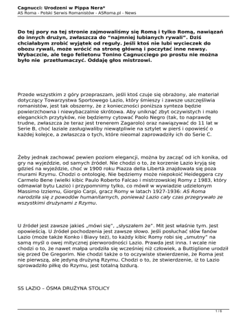 Cagnucci: Urodzeni w Pippa Nera* AS Roma - Polski Serwis Romanistów - ASRoma.pl - News Do tej pory na tej stronie zajmowaliśmy się Romą i tylko Romą, nawiązań do innych drużyn, zwłaszcza do “najmniej lubianych rywali”. Dziś chciałabym zrobić wyjątek od reguły. Jeśli ktoś nie lubi wycieczek do obozu rywali, może wrócić na stronę główną i poczytać inne newsy. Wybaczcie, ale tego felietonu Tonino Cagnucciego po prostu nie można było nie przetłumaczyć. Oddaję głos mistrzowi. Przede wszystkim z góry przepraszam, jeśli ktoś czuje się obrażony, ale materiał dotyczący Towarzystwa Sportowego Lazio, który śmieszy i zawsze uszczęśliwia romanistów, jest tak obszerny, że z konieczności poniższa synteza będzie powierzchowna i niewybaczalnie skrótowa. Aby uniknąć zbyt oczywistych i mało eleganckich przytyków, nie będziemy cytować Paolo Negro (tak, to naprawdę trudne, zwłaszcza że teraz jest trenerem Zagarolo) oraz nawiązywać do 11 lat w Serie B, choć laziale zasługiwaliby niewątpliwie na sztylet w pierś i opowieść o każdej kolejce, a zwłaszcza o tych, które nieomal zaprowadziły ich do Serie C. Żeby jednak zachować pewien poziom elegancji, można by zacząć od ich konika, od gry na wyjeździe, od samych źródeł. Nie chodzi o to, że korzenie Lazio kryją się gdzieś na wyjeździe, choć w 1900 roku Piazza della Libertà znajdowała się poza murami Rzymu. Chodzi o ontologię. Nie będziemy może niepokoić Heideggera czy Carmelo Bene (wielki kibic Paulo Roberto Falcao i mistrzowskiej Romy z 1983, który odmawiał bytu Lazio) i przypomnimy tylko, co mówił w wywiadzie udzielonym Massimo Izziemu, Giorgio Carpi, gracz Romy w latach 1927-1936: AS Roma narodziła się z powodów humanitarnych, ponieważ Lazio cały czas przegrywało ze wszystkimi drużynami z Rzymu. U źródeł jest zawsze jakieś „mówi się”, „słyszałem że”. Mit jest właśnie tym. Jest opowieścią. U źródeł pochodzenia jest zawsze słowo. Jeśli posłuchać słów fanów Lazio (może także Konko i Biavy też), to każdy kibic Romy robi się „smutny” na samą myśl o owej mitycznej pierworodności Lazio. Prawda jest inna. I wcale nie chodzi o to, że nawet małpa urodziła się wcześniej niż człowiek, a Buttiglione urodził się przed De Gregorim. Nie chodzi także o to oczywiste stwierdzenie, że Roma jest nie pierwszą, ale jedyną drużyną Rzymu. Chodzi o to, że stwierdzenie, iż to Lazio sprowadziło piłkę do Rzymu, jest totalną bzdurą. SS LAZIO – ÓSMA DRUŻYNA STOLICY 1/6 Cagnucci: Urodzeni w Pippa Nera* AS Roma - Polski Serwis Romanistów - ASRoma.pl - News Pierwszy udokumentowany mecz piłki nożnej w Rzymie odbył się 18 września 1895 roku pomiędzy klubami Udinese di Scherma i la Società rodigiana di ginnastica, na Velodromo di Via Isonzo. Obejrzało go 20 tysięcy osób, w tym Król i Królowa. W listopadzie 1895 roku Klub Gimnastyczny Roma (Società Ginnastica Roma) zaczął grać w piłkę i był pierwszą drużyną, która robiła to w stolicy. W 1896 roku studenci z Regio Liceo Ginnasio "Ennio Quirino Visconti" założyli Football Club Roma. Jednocześnie rodził się Sporting Club Roma. Società Ginnastica Roma, FC Roma i Sporting Club Roma w maju 1899 roku rozegrały w Villa Pamphili pierwsze mistrzostwa piłki nożnej w rejonie Lacjum. W latach 1899-1900 powstały Cristiana, Veloce Club Podistico i Forza e Coraggio. W 1901 powstał Roman Cricket and Football Club – klub, który w 1927 roku połączył się z Albą i Fortiduo, tworząc AS Romę. Roman grał więc w piłkę, zanim zaczęło robić to SS Lazio powstałe w 1902 z założonego w 1900 zespołu Podistica. I dlatego właśnie Lazio nazywa się Lazio a nie Roma. Zresztą, jak pytał Szekspir, czymże jest nazwa? Wszystkim i niczym. Ale jeśli urodziłeś się w Pippa Nera... PIPPA NERA Nie da się ukryć, że dyskursy tego rodzaju wydawać się mogą stronnicze, nawet jeśli starasz się trzymać podejścia czysto filologicznego. Ale koszulka wywieszona przez ultra-lacjowatych graczy Lazio w meczu z Bologną z napisem „Romanisti sempre tristi” (Romaniści zawsze smutni) zasługuje na równie lacjowaty komentarz, bo stawka jest wysoka. Zacytujmy książkę Sergio Barbero “Il lungo volo dell’Aquila” (Długi lot orła) wydaną przez Graphot Editrice i opublikowaną w listopadzie 1999. Na stronie 11 czytamy: Rozmowy nabierają konkretnego wyrazu 9 stycznia 1900 roku. Istnieje już la Ginnastica Roma. Bigiarelli, zwracając się do przyjaciół, mówi: „musimy znaleźć nazwę, które obejmie Rzym i jednocześnie przekroczy mury samego miasta”. Przedsiębiorczy eks-urzędnik przez chwilę się zastanawia. Potem, z trudem panując nad wybuchem entuzjazmu, wykrzykuje: „Proponuję nazwę Società Podistica Lazio!”... „I stało się Lazio!” – wykrzyknęli inni chórem. A wnętrza Pippa Nera zatrzęsły się od gorących oklasków. Dorzucenie do tego opisu jakiegokolwiek komentarza byłoby zbrodnią. NOMEN OMEN Że ważny członek kierownictwa i współwłaściciel Podistica Lazio (a potem także prazes) nazywa się Vaccaro [“vacca” to po włosku krowa; “vaccaro” można rozumieć jako pasterza krów – od red.], może być tylko przypadkiem. Ale jeśli pierwszy gracz Lazio, który strzela gola w derby nazywa się Pastore [włoskie „pasterz”], to zbiegów okoliczności zaczyna być za dużo. Stało sie to 4 maja 1930 roku: Roma-Lazio 3-1. Drugie derby. Pierwsze w historii miały miejsce 8 grudnia 1929 roku: Lazio-Roma 0-1, 30 tysięcy widzów, 30 tysięcy romanistów, ponieważ 2/6 Cagnucci: Urodzeni w Pippa Nera* AS Roma - Polski Serwis Romanistów - ASRoma.pl - News Roma narodziła się, żeby Rzym mógł mieć drużynę ze swoją nazwą, swoim symbolem i barwami. I rzeczywiście od tego momentu Romaniści stali się „smutni” i do dzisiaj dalej tacy są. 13 MARCA 2011 Dokładnie rok temu od dziś Francesco Totti strzela