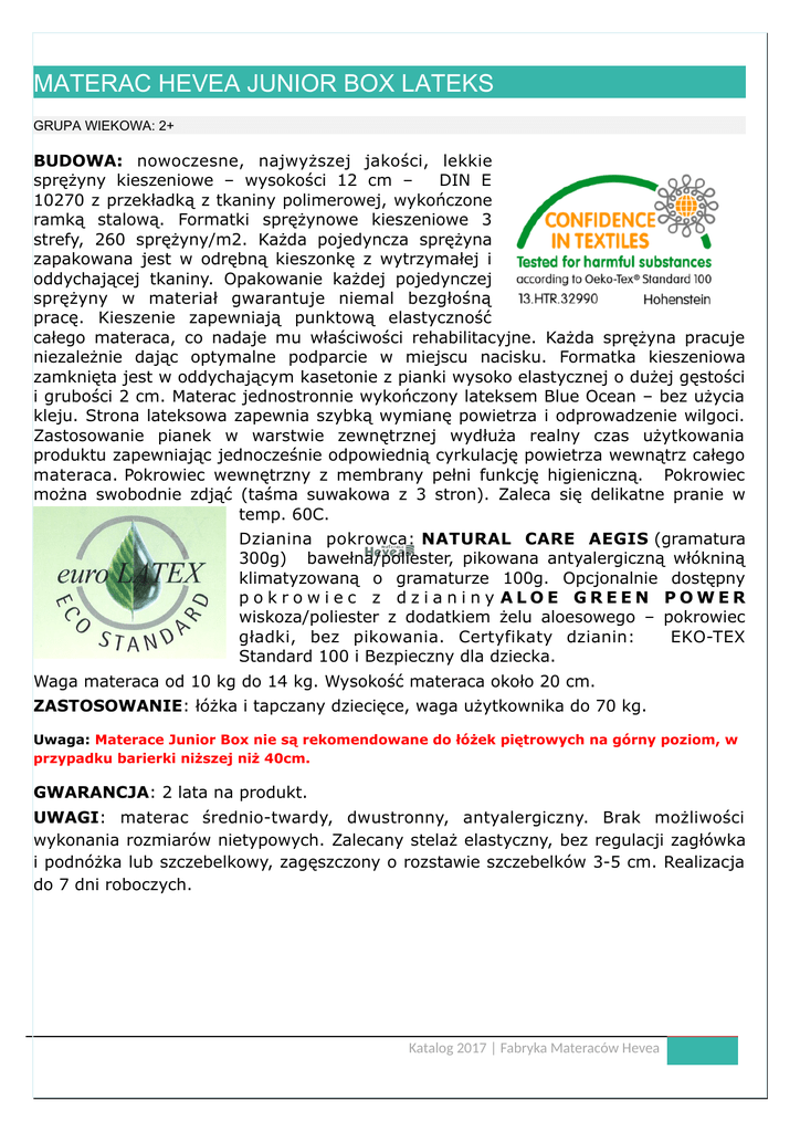 MATERAC HEVEA JUNIOR BOX LATEKS GRUPA WIEKOWA: 2+ BUDOWA: nowoczesne, najwyższej jakości, lekkie sprężyny kieszeniowe – wysokości 12 cm – DIN E 10270 z przekładką z tkaniny polimerowej, wykończone ramką stalową. Formatki sprężynowe kieszeniowe 3 strefy, 260 sprężyny/m2. Każda pojedyncza sprężyna zapakowana jest w odrębną kieszonkę z wytrzymałej i oddychającej tkaniny. Opakowanie każdej pojedynczej sprężyny w materiał gwarantuje niemal bezgłośną pracę. Kieszenie zapewniają punktową elastyczność całego materaca, co nadaje mu właściwości rehabilitacyjne. Każda sprężyna pracuje niezależnie dając optymalne podparcie w miejscu nacisku. Formatka kieszeniowa zamknięta jest w oddychającym kasetonie z pianki wysoko elastycznej o dużej gęstości i grubości 2 cm. Materac jednostronnie wykończony lateksem Blue Ocean – bez użycia kleju. Strona lateksowa zapewnia szybką wymianę powietrza i odprowadzenie wilgoci. Zastosowanie pianek w warstwie zewnętrznej wydłuża realny czas użytkowania produktu zapewniając jednocześnie odpowiednią cyrkulację powietrza wewnątrz całego materaca. Pokrowiec wewnętrzny z membrany pełni funkcję higieniczną. Pokrowiec można swobodnie zdjąć (taśma suwakowa z 3 stron). Zaleca się delikatne pranie w temp. 60C. Dzianina pokrowca: NATURAL CARE AEGIS (gramatura 300g) bawełna/poliester, pikowana antyalergiczną włókniną klimatyzowaną o gramaturze 100g. Opcjonalnie dostępny p o kro wie c z d zianiny ALOE GREEN POWER wiskoza/poliester z dodatkiem żelu aloesowego – pokrowiec gładki, bez pikowania. Certyfikaty dzianin: EKO-TEX Standard 100 i Bezpieczny dla dziecka. Waga materaca od 10 kg do 14 kg. Wysokość materaca około 20 cm. ZASTOSOWANIE: łóżka i tapczany dziecięce, waga użytkownika do 70 kg. Uwaga: Materace Junior Box nie są rekomendowane do łóżek piętrowych na górny poziom, w przypadku barierki niższej niż 40cm. GWARANCJA: 2 lata na produkt. UWAGI: materac średnio-twardy, dwustronny, antyalergiczny. Brak możliwości wykonania rozmiarów nietypowych. Zalecany stelaż elastyczny, bez regulacji zagłówka i podnóżka lub szczebelkowy, zagęszczony o rozstawie szczebelków 3-5 cm. Realizacja do 7 dni roboczych. Katalog 2017 | Fabryka Materaców Hevea Kody produktu i ceny detaliczne pln: POKROWIEC AEGIS NATURAL CARE MATERAC MATERAC MATERAC MATERAC HEVEA HEVEA HEVEA HEVEA JUNIOR JUNIOR JUNIOR JUNIOR BOX BOX BOX BOX LATEKS LATEKS LATEKS LATEKS 160/80 180/80 200/80 200/90 5901602101919 5901602101926 5901602101902 5901602101933 590 615 630 675 5901602101988 5901602102671 5901602102756 5901602102763 593 615 630 675 POKROWIEC ALOE GREEN POWER MATERAC MATERAC MATERAC MATERAC HEVEA HEVEA HEVEA HEVEA JUNIOR JUNIOR JUNIOR JUNIOR BOX BOX BOX BOX LATEKS LATEKS LATEKS LATEKS 160/80 180/80 200/80 200/90 Katalog 2017 | Fabryka Materaców Hevea Katalog 2017 | Fabryka Materaców Hevea Katalog 2017 | Fabryka Materaców Hevea Katalog 2017 | Fabryka Materaców Hevea