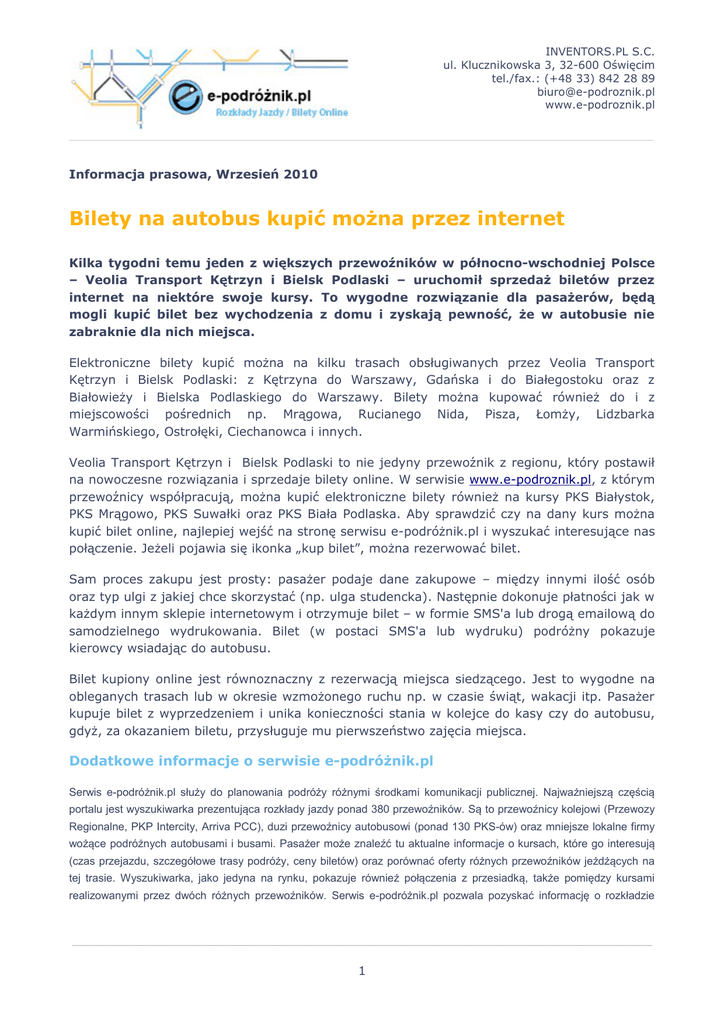 INVENTORS.PL S.C. ul. Klucznikowska 3, 32-600 Oświęcim tel./fax.: (+48 33) 842 28 89 [email protected] www.e-podroznik.pl ________________________________________________________________________________________________________________________________________________________________ Informacja prasowa, Wrzesień 2010 Bilety na autobus kupić można przez internet Kilka tygodni temu jeden z większych przewoźników w północno-wschodniej Polsce – Veolia Transport Kętrzyn i Bielsk Podlaski – uruchomił sprzedaż biletów przez internet na niektóre swoje kursy. To wygodne rozwiązanie dla pasażerów, będą mogli kupić bilet bez wychodzenia z domu i zyskają pewność, że w autobusie nie zabraknie dla nich miejsca. Elektroniczne bilety kupić można na kilku trasach obsługiwanych przez Veolia Transport Kętrzyn i Bielsk Podlaski: z Kętrzyna do Warszawy, Gdańska i do Białegostoku oraz z Białowieży i Bielska Podlaskiego do Warszawy. Bilety można kupować również do i z miejscowości pośrednich np. Mrągowa, Rucianego Nida, Pisza, Łomży, Lidzbarka Warmińskiego, Ostrołęki, Ciechanowca i innych. Veolia Transport Kętrzyn i Bielsk Podlaski to nie jedyny przewoźnik z regionu, który postawił na nowoczesne rozwiązania i sprzedaje bilety online. W serwisie www.e-podroznik.pl, z którym przewoźnicy współpracują, można kupić elektroniczne bilety również na kursy PKS Białystok, PKS Mrągowo, PKS Suwałki oraz PKS Biała Podlaska. Aby sprawdzić czy na dany kurs można kupić bilet online, najlepiej wejść na stronę serwisu e-podróżnik.pl i wyszukać interesujące nas połączenie. Jeżeli pojawia się ikonka „kup bilet”, można rezerwować bilet. Sam proces zakupu jest prosty: pasażer podaje dane zakupowe – między innymi ilość osób oraz typ ulgi z jakiej chce skorzystać (np. ulga studencka). Następnie dokonuje płatności jak w każdym innym sklepie internetowym i otrzymuje bilet – w formie SMS'a lub drogą emailową do samodzielnego wydrukowania. Bilet (w postaci SMS'a lub wydruku) podróżny pokazuje kierowcy wsiadając do autobusu. Bilet kupiony online jest równoznaczny z rezerwacją miejsca siedzącego. Jest to wygodne na obleganych trasach lub w okresie wzmożonego ruchu np. w czasie świąt, wakacji itp. Pasażer kupuje bilet z wyprzedzeniem i unika konieczności stania w kolejce do kasy czy do autobusu, gdyż, za okazaniem biletu, przysługuje mu pierwszeństwo zajęcia miejsca. Dodatkowe informacje o serwisie e-podróżnik.pl Serwis e-podróżnik.pl służy do planowania podróży różnymi środkami komunikacji publicznej. Najważniejszą częścią portalu jest wyszukiwarka prezentująca rozkłady jazdy ponad 380 przewoźników. Są to przewoźnicy kolejowi (Przewozy Regionalne, PKP Intercity, Arriva PCC), duzi przewoźnicy autobusowi (ponad 130 PKS-ów) oraz mniejsze lokalne firmy wożące podróżnych autobusami i busami. Pasażer może znaleźć tu aktualne informacje o kursach, które go interesują (czas przejazdu, szczegółowe trasy podróży, ceny biletów) oraz porównać oferty różnych przewoźników jeżdżących na tej trasie. Wyszukiwarka, jako jedyna na rynku, pokazuje również połączenia z przesiadką, także pomiędzy kursami realizowanymi przez dwóch różnych przewoźników. Serwis e-podróżnik.pl pozwala pozyskać informację o rozkładzie ___________________________________________________________________________ 1 INVENTORS.PL S.C. ul. Klucznikowska 3, 32-600 Oświęcim tel./fax.: (+48 33) 842 28 89 [email protected] www.e-podroznik.pl ________________________________________________________________________________________________________________________________________________________________ jazdy nie tylko poprzez stroną internetową, ale i poprzez serwis SMS oraz infolinię 118 000. Jest to profesjonalne, całodobowe call centre prowadzone we współpracy z Telekomunikację Polską S.A. Jednym z najważniejszych wdrażanych obecnie przedsięwzięć jest ogólnopolski system sprzedaży biletów autobusowych online. Obok Veolia Transport elektroniczne bilety w serwisie sprzedają już PKS Wschód, PKS Piotrków Trybunalski, PKS Radomsko, PKS Mrągowo, PKS Kraków, PKS Suwałki, PKS Gorzów Wielkopolski, PKS Bytów i PKS Białystok, PKS Gryfice. Do końca roku 2010, około 30 PKS-ów będzie sprzedawało bilety w systemie online prowadzonym przez portal. Obecnie usługa dotyczy tylko biletów jednorazowych, jednakże w niedalekiej przyszłości twórcy serwisu planują wprowadzić również sprzedaż biletów okresowych zintegrowanych z systemem kart bezstykowych, tzw. EM-kart. Dzięki współpracy z jednym z liderów w sprzedaży biletów lotniczych online, w portalu epodróżnik.pl można również zarezerwować bilety lotnicze. Za pośrednictwem serwisu można też kupić bilety w międzynarodowej komunikacji autokarowej. Portal e-podróżnik.pl zyskuje coraz większą popularność – miesięcznie korzysta z niego około 3 mln użytkowników, a w najnowszym ogólnopolskim rankingu serwisów tematycznych, w kategorii Turystyka, serwis e-podróżnik.pl zajął 5. miejsce (Megapanel, PBI/Gemius, czerwiec 2010). Więcej informacji udziela: Katarzyna Soroczyńska [email protected] www.e-podroznik.pl tel: 694 429 960 ___________________________________________________________________________ 2