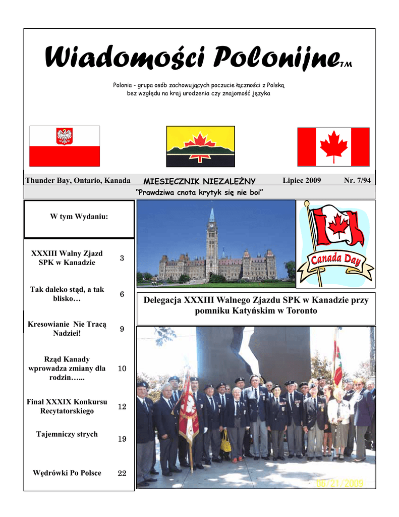 Wiadomosci Polonijne TM Polonia - grupa osób zachowujących poczucie łączności z Polską bez względu na kraj urodzenia czy znajomość języka Thunder Bay, Ontario, Kanada MIESIĘCZNIK NIEZALEŻNY Lipiec 2009 Nr. 7/94 “Prawdziwa cnota krytyk się nie boi” W tym Wydaniu: XXXIII Walny Zjazd SPK w Kanadzie 3 Tak daleko stąd, a tak blisko… 6 Kresowianie Nie Tracą Nadziei! 9 Rząd Kanady wprowadza zmiany dla rodzin…... 10 Finał XXXIX Konkursu Recytatorskiego 12 Tajemniczy strych Wędrówki Po Polsce 19 22 Delegacja XXXIII Walnego Zjazdu SPK w Kanadzie przy pomniku Katyńskim w Toronto 2 Redaguje Zespół: Lucy Michalak Tadeusz Michalak Agnieszka Reszkowska-Kania Robert Kania Wiadomości Polonijne WIADOMOŚCI Z POLSKI-Tadeusz Michalak Rekordzistą w eurowyborach Korespondenci: Został Jerzy Buzek (393 Joanna Adamik tys. głosów). B. premier Agnieszka Buda-Rodriguez ma duże szanse na A. Cooke B. Ejbich przewodniczącego PE. Rekordzistą z PiS I.. Giżewska został Zbigniew Ziobro, w Warszawie A. Siwiak gromiła konkurentów Danuta Huebner (PO). Waldi Najlepszy wynik na Pomorzu miał Janusz Opracowanie: Lucy Michalak Lewandowski. Do Europarlamentu dostali Wydawca: Wiadomości Polonijne się jednak Wojciech Olejniczak i Marek 236 Masters Street. Siwiec z SLD, a także Richard Henry Thunder Bay, Ont. Czarnecki, reprezentujący PiS, co do których P7B 6L5 były wątpliwości czy uzyskali odpowiednią e-mail: [email protected] liczbę głosów. Ostateczne wyniki Redakcja zastrzega sobie prawo procentowe to PO 44.43%, PiS 27.4, SLD skracania i edycji nadesłanych 12.34, PSL 7.01. Frekwencja 24.53% tekstów. Wyrażone w tekstach (wyższa niż 5 lat temu). opinie należą do autorów i nie zawsze odzwierciedlają stanowisko Pracujący na czarno Polacy złapani w redakcji. Za treść ogłoszeń i reklam Berlinie redakcja nie ponosi Podczas kontroli okazało się, że Polacy odpowiedzialności. pracowali przy budowie terminalu w Berlinie jako zbrojarze, choć nie mieli na to Wiadomości Polonijne są pismem pozwolenia. całkowicie bezpłatnym. Wszelkie koszty związane z drukiem są Celnicy podejrzewają, że przy ich pokrywane z dotacji. Każda pomoc zatrudnieniu posłużono się starym trikiem. Firma postarała się o pozwolenia na pracę finansowa jest mile widziana. dla spawaczy, którzy są w Niemczech Wszelkiego rodzaju ogloszenia i najbardziej poszukiwani, po czym życzenia do “Wiadomości zatrudniała Polaków do innych robót. Polonij ych” przyj muj e Lucy Towarzystwo Lotnicze natychmiast usunęło Michalak tel. 767-4200 firmę i robotników z budowy. Wobec Wzory reklam zaprojektowanych p r a c o d a wc ó w w s z c z ę t e z o s t a n i e przez Wiadomości Polonijne” są postępowanie karne. własnością wydawnictwa. Kopiowanie i ich publikowanie bez Nowe prawo rodzinne zgody redakcji jest nielegalne. Wchodzi w życie nowelizacja kodeksu rodzinnego i opiekuńczego. Najważniejsze zmiany: nowe zasady ustalania rodzicielstwa. O uznaniu dziecka (przez mężczyznę niebędącego mężem matki) decyduje biologia - w razie potrzeby, badanie DNA. Matka jest kobieta, która urodziła (ważny zapis wobec pojawiania się Termin nadsyłania materiałów do problemu `matek zastępczych'). Ułatwienie gazety upływa 15-go każdego kontaktów z dzieckiem po rozwodzie miesiąca. rodziców. Złagodzenie obowiązku alimentacyjnego wobec dorosłych dzieci niestarających się o samodzielne utrzymanie. Przysłowie miesiąca Redakcja “ Wiadomości Polonijnych” zaprasza wszystkich Czytelników do przysyłania własnej twórczości. Mogą to być zarówno wiersze jak i proza. Gdy czerwiec chłodem i wodą szafluje, to zwykle rok cały popsuje. Lipiec 2009 Nową ustawę o szkolnictwie wyższym Proponuje minister Barbara Kudrycka. Szereg pomysłów: limitowanie przez ministra liczby miejsc na uczelniach publicznych, bezpłatne studia tylko na jednym kierunku, więcej stypendiów socjalnych, mniej naukowych. Projekt Skierowano do konsultacji Międzyresortowych. Kandydatem na unijnego komisarza Jest Janusz Lewandowski. Opozycja zgodnie (PiS i SLD) raptem "broni" dotychczasową komisarz Danute Huebner, która wobec rekomendowania przez premiera Janusza Lewandowskiego, będzie musiała zadowolić się mandatem europosła. Kazania świętokrzyskie Najstarszy zabytek polskiej prozy, zostały opublikowane w nowym naukowym opracowaniu. Publikacja pod redakcją prof. Pawła Stępnia została uroczyście zaprezentowana w Pałacu Rzeczpospolitej, gdzie mieszczą się zbiory specjalne Biblioteki Narodowej. Prezentacje uświetniło odczytanie jednego z kazań przez Zbigniewa Zapasiewicza oraz koncert muzyki średniowiecznej w wykonaniu zespołu Ars Nova. Nie ma pieniędzy na podwyżki dla nauczycieli. W budżecie na przyszły rok nie ma pieniędzy na wyższe pensje dla nauczycieli i związkowcy już wiedzą, że będą musieli ustąpić z obiecanych im podwyżek - informuje "Gazeta Wyborcza". W wyniku negocjacji płacowych, prowadzonych z oświatowymi związkami zawodowymi podczas strajków pod koniec 2008 r., rząd dał nauczycielom dwie podwyżki z tegorocznego budżetu. Przewidywana wcześniej podwyżka miała wynieść 10%, ale dziś rząd proponuje tylko 1-procentowy wzrost pensji. Jednak przypomina gazeta - prowadzący te negocjacje minister Michał Boni, wpisał do osiągniętego wtedy porozumienia warunek, który zakładał przeprowadzenie w połowie 2009 roku rozmów. W ich wyniku rząd i związki mają ocenić, jak obiecane podwyżki mają się do "tempa wzrostu gospodarczego i sytuacji budżetowej państwa". No i po co było wystawiać posłów Sejmowych do Europarlamentu? Po pierwsze - to nielojalne wobec wyborców miejscowych. Po drugie - bywają kłopoty. Po Sławomirze Nitrasie (PO), który wejdzie do parlamentu europejskiego, mandat w …cd na str 8 Lipiec 2009 XXXIII Walny Zjazd SPK w Kanadzie „Walny Zjazd jest najwyższą władzą Stowarzyszenia....” „Zwyczajny Walny Zjazd zwo