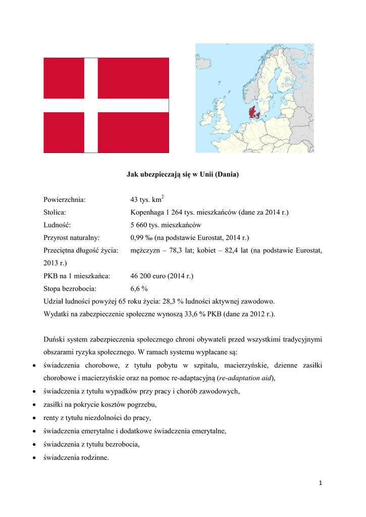 Jak ubezpieczają się w Unii (Dania) Powierzchnia: 43 tys. km2 Stolica: Kopenhaga 1 264 tys. mieszkańców (dane za 2014 r.) Ludność: 5 660 tys. mieszkańców Przyrost naturalny: 0,99 ‰ (na podstawie Eurostat, 2014 r.) Przeciętna długość życia: mężczyzn – 78,3 lat; kobiet – 82,4 lat (na podstawie Eurostat, 2013 r.) PKB na 1 mieszkańca: 46 200 euro (2014 r.) Stopa bezrobocia: 6,6 % Udział ludności powyżej 65 roku życia: 28,3 % ludności aktywnej zawodowo. Wydatki na zabezpieczenie społeczne wynoszą 33,6 % PKB (dane za 2012 r.). Duński system zabezpieczenia społecznego chroni obywateli przed wszystkimi tradycyjnymi obszarami ryzyka społecznego. W ramach systemu wypłacane są: świadczenia chorobowe, z tytułu pobytu w szpitalu, macierzyńskie, dzienne zasiłki chorobowe i macierzyńskie oraz na pomoc re-adaptacyjną (re-adaptation aid), świadczenia z tytułu wypadków przy pracy i chorób zawodowych, zasiłki na pokrycie kosztów pogrzebu, renty z tytułu niezdolności do pracy, świadczenia emerytalne i dodatkowe świadczenia emerytalne, świadczenia z tytułu bezrobocia, świadczenia rodzinne. 1 System podstawowy jest obowiązkowy dla wszystkich osób zamieszkałych na terenie Danii – pracowników, osób samozatrudnionych, urzędników państwowych, emerytów, studentów, uchodźców, osób nieaktywnych/biernych zawodowo (non-active persons). System ten zapewnia wszystkie świadczenia z wyjątkiem świadczeń z tytułu bezrobocia i przedemerytalnego. System jest jednolity, bez względu na typ płatnika składek Co do zasady, osoba fizyczna nie jest zobowiązana do odprowadzania składek na duński system zabezpieczenia społecznego, jeśli nie jest zobowiązana do płacenia podatków w Danii. Jeśli jednak odprowadza podatki w Dani, to musi również opłacić podstawową składkę na tzw. fundusz rynku pracy (tzw. Arbejdsmarkedsbidrag lub AM). Osoba fizyczna musi również opłacać obowiązkową składkę na uzupełniający system emerytalny (Arbejdsmarkedets Tillægspension, ATP). W ramach tego systemu składki odprowadza pracownik - 1/3 kwoty składki (90 DKK), oraz pracodawca - 2/3 kwoty składki (180 DKK). Ubezpieczenie emerytalne, renta z tytułu niezdolności do pracy Podstawowy system emerytalny (tzw. powszechna emerytura – folkepension,) jest zarządzany przez Duński Urząd Płatniczy (Udbetaling Danmark) oraz władze lokalne. Wszyscy obywatele rezydujący na terenie Danii, którzy nie przekroczyli 65 roku życia (ten wiek jest stopniowo wydłużany do 67 roku życia) są uprawnieni do uzyskania świadczenia rentowego na wypadek niezdolności do pracy (førtidspension). O przyznaniu świadczenia decydują władze lokalne. Renta z tytułu niezdolności do pracy przysługuje osobom, których zdolność do pracy jest trwale ograniczona. Wysokość świadczenia zależy od stanu cywilnego oraz dochodu osoby pobierającej świadczenie i dochodu jej małżonka/partnera. Renta przestaje być wypłacana w chwili osiągnięcia wieku emerytalnego (automatycznie zostaje wówczas zamieniona na emeryturę). Dodatkowe świadczenie pieniężne jest wypłacane na pokrycie kosztów wynikających z niepełnosprawności np.: pomoc ze strony osoby trzeciej, ogrzewanie, sprzęt medyczny czy koszty leczenia. Po ukończeniu 65 (67) roku życia Duńczycy są uprawieni do otrzymywania emerytury. Jej wysokość uzależniona jest od okresu zamieszkiwania na terenie Danii. Wyliczenie wysokości świadczenia rentowego oraz podstawowego świadczenia emerytalnego i ich wypłata leży w kompetencji Duńskiego Urzędu Płatniczego. Pełne świadczenie emerytalne otrzymuje się po 40 latach mieszkania na terenie Danii. Jeżeli okres ten był krótszy, to za każdy brakujący rok świadczenie jest zmniejszane o 1/40. Świadczenie składa się z kwoty podstawowej i dodatku, 2 którego wysokość uzależniona jest od dochodu. Łączna wysokość świadczenia emerytalnego zależy od bieżącego dochodu emeryta oraz jego stanu cywilnego. Nadzór nad wdrożeniem ustaw – bez uprawnień do orzekania w indywidualnych sprawach – sprawuje Ministerstwo Dzieci, Równości Płci, Integracji i Spraw Społecznych (Ministeriet for Børn, Ligestilling, Integration og Sociale forhold). Uzupełniający system emerytalny (ATP) Obejmuje on każdą osobę, która ukończyła 16 rok życia, jest zatrudniona w Danii i pracuje minimum 9 godzin tygodniowo (w przypadku osób samozatrudnionych udział w tym systemie jest dobrowolny). Uzupełniający plan emerytalny oparty jest na zdefiniowanej składce. Jej wysokość jest, zależna od liczby przepracowanych miesięcznie godzin i jest opłacana zarówno przez pracownika, jak i pracodawcę. System ATP wypłaca świadczenia emerytalne (dodatek do podstawowej emerytury) począwszy od 65 roku życia. Otrzymywana miesięcznie kwota zależy od tego, jak długo dana osoba objęta była systemem i od wysokości składek. System ATP obejmuje również świadczenie jednorazowe (lump-sum payment) lub skapitalizowane świadczenie emerytalne wypłacane pozostałemu przy życiu małżonkowi/konkubencie i dzieciom zmarłej osoby. Uzupełniający system emerytalny zarządzany jest przez administrację centralną i podlega Ministerstwu ds. Zatrudnienia (Beskæftigelsesministeriet). Dobrowolny uzupełniający system emerytalny W Danii istnieje również dobrowolny uzupełniający system emerytalny rynku pracy dla osób otrzymujących świadczenie z tytułu niezdolności do pracy (Supplerende arbejdsmarkedspension, SUPP). Celem tego świadczenia jest zapewnienie beneficjentom systemu podstawowego dostępu do świadczeń z rynku pracy – uzupełniających system podstawowy. System SUPP zarządzany jest przez różne instytucje ubezpieczeniowe (większość emerytów wybrała w tym zakresie instytucje z zakresu ATP), a podlega Ministerstwu Dzieci, Równości Płci, Integracji i Spraw Społecznych. Obok dobrowolnego emerytalnego ubezpieczenia rynku pracy stworzono również 