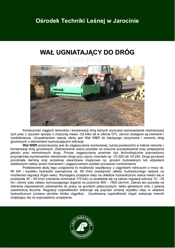 Ośrodek wJarocinie Jarocinie OśrodekTechniki Techniki Leśnej Leśnej w WAŁ UGNIATAJĄCY DO DRÓG Konieczność ciągłych remontów i konserwacji dróg leśnych wymusza wprowadzenie mechanizacji tych prac z użyciem sprzętu o znacznej masie. Od kilku lat w ofercie OTL Jarocin dostępne są równiarki i rozdrabniacze. Uzupełnieniem naszej oferty jest Wał WBR do bieżącego utrzymania i remontu dróg gruntowych z elementami wymuszającymi wibracje. Wał WBR przeznaczony jest do zagęszczenia wyrównanej, luźnej powierzchni w trakcie remontu i konserwacji dróg gruntowych. Zastosowanie walca pozwala na znaczne przyspieszenie oraz polepszenie jakości prac remontowych drogi. Proces zagęszczania powinien być technologicznie poprzedzony przynajmniej wyrównaniem nierówności drogi przy użyciu równiarki np. V3-220 lub V4-240. Drogi gruntowe porośnięte darniną oraz wcześniej utwardzane miejscowo np. gruzem budowlanym lub odpadami asfaltowymi należy przed równaniem i zagęszczaniem poddać procesowi rozdrobnienia. Podstawowe atuty tego urządzenia to możliwość współpracy z ciągnikami rolniczymi o mocy ok. 90 kW i wydatku hydrauliki zewnętrznej ok. 60 l/min (wydajność układu hydraulicznego wpływa na możliwości regulacji drgań wału). Wymagany przepływ oleju na układzie hydraulicznym walca mieści się w przedziale 30 – 60 l/min (ciśnienie nominalne 175 bar) co przekłada się na zakres regulacji wibracji 12 – 25 Hz i obroty wału układu wymuszającego drgania na poziomie 900 – 1500 obr/min. Zakres ten pozwala na dobranie odpowiednich parametrów do pracy na gruntach piaszczystych, lekko gliniastych oraz z pewną zawartością tłucznia. Regulacji częstotliwości dokonuje się poprzez zmianę wydatku oleju w układzie hydraulicznym (zmiana obrotów silnika ciągnika) . Uzyskiwaną częstotliwość drgań wskazuje miernik znajdujący się na wyposażeniu urządzenia. Ośrodek Techniki Leśnej Ośrodek Techniki Leśnej, ul.Przemysłowa 2 D, 63-200 Jarocin tel.: +48 62Techniki 747-35-82, fax:, +48 62 747-29-33,2 e-mail: [email protected] Ośrodek Leśnej ul. Przemysłowa D, 63-200 Jarocin Ośrodek Techniki Leśnej, ul.Przemysłowa 2 D, 63-200 Jarocin tel.: +48 62 747-35-82, fax: +48 62 747-29-33, e-mail: [email protected] www.otljarocin.lasy.gov.pl tel.: +48 62 747-35-82, fax: +48 62 747-29-33, e-mail: [email protected] Ośrodek Techniki Leśnej w Jarocinie PARAMETRY TECHNICZNE Parametr długość szerokość wysokość masa obsługa moc ciągnika obroty WOM ciągnika Napęd Częstotliwość Amplituda prędkość robocza Wielkość 3370 mm 2220 mm 1500 mm 5000kg 1 osoba 80 kW 540 obr/min Własna hydraulika 30 Hz 1,1 mm średnio ok. 0,6 km/h Platforma do przewozu wału wibracyjnego Ośrodek Techniki Leśnej Ośrodek Techniki Leśnej, ul.Przemysłowa 2 D, 63-200 Jarocin tel.: +48 62Techniki 747-35-82, fax:, +48 62 747-29-33,2 e-mail: [email protected] Ośrodek Leśnej ul. Przemysłowa D, 63-200 Jarocin Ośrodek Techniki Leśnej, ul.Przemysłowa 2 D, 63-200 Jarocin tel.: +48 62 747-35-82, fax: +48 62 747-29-33, e-mail: [email protected] www.otljarocin.lasy.gov.pl tel.: +48 62 747-35-82, fax: +48 62 747-29-33, e-mail: [email protected]