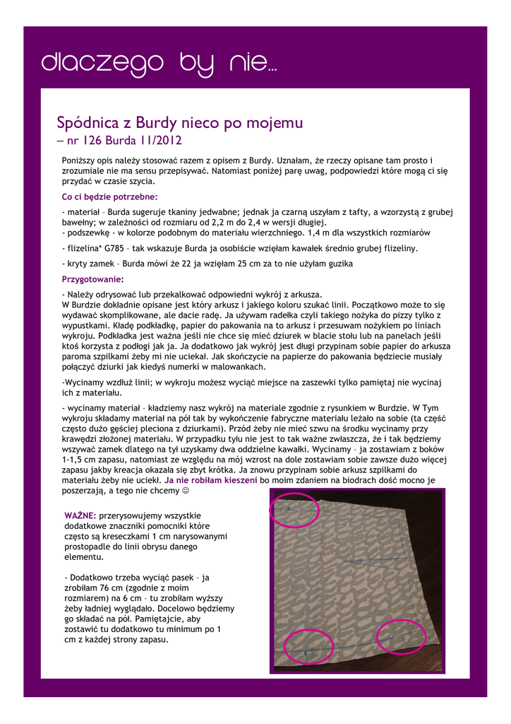 Dlaczego by nie… Spódnica z Burdy nieco po mojemu – nr 126 Burda 11/2012 Poniższy opis należy stosować razem z opisem z Burdy. Uznałam, że rzeczy opisane tam prosto i zrozumiale nie ma sensu przepisywać. Natomiast poniżej parę uwag, podpowiedzi które mogą ci się przydać w czasie szycia. Co ci będzie potrzebne: - materiał – Burda sugeruje tkaniny jedwabne; jednak ja czarną uszyłam z tafty, a wzorzystą z grubej bawełny; w zależności od rozmiaru od 2,2 m do 2,4 w wersji długiej. - podszewkę - w kolorze podobnym do materiału wierzchniego. 1,4 m dla wszystkich rozmiarów - flizelina* G785 – tak wskazuje Burda ja osobiście wzięłam kawałek średnio grubej flizeliny. - kryty zamek – Burda mówi że 22 ja wzięłam 25 cm za to nie użyłam guzika Przygotowanie: - Należy odrysować lub przekalkować odpowiedni wykrój z arkusza. W Burdzie dokładnie opisane jest który arkusz i jakiego koloru szukać linii. Początkowo może to się wydawać skomplikowane, ale dacie radę. Ja używam radełka czyli takiego nożyka do pizzy tylko z wypustkami. Kładę podkładkę, papier do pakowania na to arkusz i przesuwam nożykiem po liniach wykroju. Podkładka jest ważna jeśli nie chce się mieć dziurek w blacie stołu lub na panelach jeśli ktoś korzysta z podłogi jak ja. Ja dodatkowo jak wykrój jest długi przypinam sobie papier do arkusza paroma szpilkami żeby mi nie uciekał. Jak skończycie na papierze do pakowania będziecie musiały połączyć dziurki jak kiedyś numerki w malowankach. -Wycinamy wzdłuż linii; w wykroju możesz wyciąć miejsce na zaszewki tylko pamiętaj nie wycinaj ich z materiału. - wycinamy materiał – kładziemy nasz wykrój na materiale zgodnie z rysunkiem w Burdzie. W Tym wykroju składamy materiał na pół tak by wykończenie fabryczne materiału leżało na sobie (ta część często dużo gęściej pleciona z dziurkami). Przód żeby nie mieć szwu na środku wycinamy przy krawędzi złożonej materiału. W przypadku tyłu nie jest to tak ważne zwłaszcza, że i tak będziemy wszywać zamek dlatego na tył uzyskamy dwa oddzielne kawałki. Wycinamy – ja zostawiam z boków 1-1,5 cm zapasu, natomiast ze względu na mój wzrost na dole zostawiam sobie zawsze dużo więcej zapasu jakby kreacja okazała się zbyt krótka. Ja znowu przypinam sobie arkusz szpilkami do materiału żeby nie uciekł. Ja nie robiłam kieszeni bo moim zdaniem na biodrach dość mocno je poszerzają, a tego nie chcemy ☺ WAŻNE: przerysowujemy wszystkie dodatkowe znaczniki pomocniki które często są kreseczkami 1 cm narysowanymi prostopadle do linii obrysu danego elementu. - Dodatkowo trzeba wyciąć pasek – ja zrobiłam 76 cm (zgodnie z moim rozmiarem) na 6 cm – tu zrobiłam wyższy żeby ładniej wyglądało. Docelowo będziemy go składać na pół. Pamiętajcie, aby zostawić tu dodatkowo tu minimum po 1 cm z każdej strony zapasu. Dlaczego by nie… No to szyjemy: (tu zmieniłam kolejność – dla mnie wygodniejsza) -Zszywamy zaszewki -Zszywamy szwy boków I. kładziemy lewą stronę na lewą odpowiednich części wykrojonego materiału. Na tym wykroju jest po proste ponieważ zewnętrzna krawędź na górze jest dość wypukła, a poza tym na górze boków do zaznaczenia były dwie kreski pomocnicze teraz one powinny się nachodzić (rys. 1). II. Ja zawsze najpierw spinam szpilkami po linii szycia rozpoczynając od miejsca oznaczonego jak na rysunku obok. Dopiero później przepinam szpilki prostopadle (rys. 2). Dlaczego wbijamy szpilki prostopadle do linii szycia? Ponieważ wtedy szyjąc igła z maszyny ominie szpilkę, a materiał nie będzie się przesuwał (rys. 3). III. Zszywamy ściegiem prostym -To samo ćwiczenie robimy z podszewką -Czas na zamek. Ja osobiście zamek wszywam najpierw w materiał, a dopiero w drugim kroku doszywam do niego podszewkę. Może więcej pracy, może mniej profesjonalnie ale jeszcze nie opanowałam ładnego wykończenia przy zamku wszywając go na materiał i podszewkę w tym samym czasie. WAŻNE: pamiętajcie by zamek troszkę wystawał bo będziecie jeszcze przyszywać pasek. WAŻNE: przy wszyciu zamka sugerowałabym przyszyć go najpierw ręcznie, kolorową nicią którą później wyprujesz. Igły w tym przypadku nie sprawdzają się (rys. 4). -Podszewka i spódnica - jak już wszyjecie zamek czas na połączenie podszewki ze spódnicą. Ja nawywijam na lewą stronę spódnicę i wciągam na nią podszewkę tak by lewe strony były styczne do siebie (rys. 5). Dzięki temu te lewe – brzydsze strony nie będą widoczne. Zanim jednak wciągniecie jedną część na drugą w tym wykroku musicie jeszcze ładnie ułożyć plisę i przypiąć ją szpilkami. Jak już będziecie gotowe przypnijcie szwy spódnicy i podszewki jak to wcześniej robiłyście. Dodatkowo zawińcie przy zamku pod spód materiał i doszyjcie ja do zamka. -Pasek -Składamy go na pół i zaprasowujemy -Przykładamy flizelinę do jednej z połówek i odrysowujemy na niej linie szycia. WAŻNE: flizelina powinna znajdować się tylko między linia polowy materiału, a linią szycia. Zaprasowujemy ją. -Zaginamy zapasy do środka i zaprasowujemy. Ja je dodatkowo zszywam lekkim ściegiem ręcznie żeby mi nie uciekły -Przypinamy do spódnicy tak by objąć zarówno spódnice jak podszewkę zaczynając od zamka (ja dodatkowo je przyszywam żeby nic się nie przesunęło). -Przyszywamy i gotowe