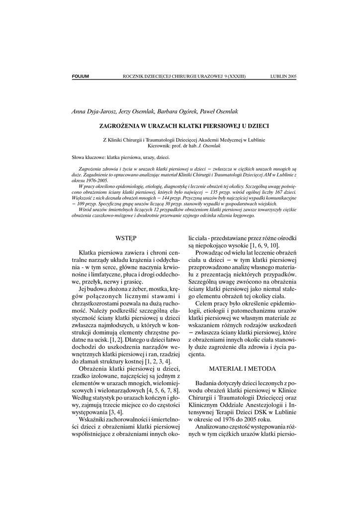 FOLIUM ROCZNIK DZIECIĘCEJ CHIRURGII Zagrożenia w urazach klatki URAZOWEJ piersiowej u9 (XXXIII) dzieci LUBLIN 2005 59 Anna Dyja-Jarosz, Jerzy Osemlak, Barbara Ogórek, Paweł Osemlak ZAGROŻENIA W URAZACH KLATKI PIERSIOWEJ U DZIECI Z Kliniki Chirurgii i Traumatologii Dziecięcej Akademii Medycznej w Lublinie Kierownik: prof. dr hab. J. Osemlak Słowa kluczowe: klatka piersiowa, urazy, dzieci. Zagrożenia zdrowia i życia w urazach klatki piersiowej u dzieci − zwłaszcza w ciężkich urazach mnogich są duże. Zagadnienie to opracowano analizując materiał Kliniki Chirurgii i Traumatologii Dziecięcej AM w Lublinie z okresu 1976-2005. W pracy określono epidemiologię, etiologię, diagnostykę i leczenie obrażeń tej okolicy. Szczególną uwagę poświęcono obrażeniom ściany klatki piersiowej, których było najwięcej − 135 przyp. wśród ogólnej liczby 167 dzieci. Większość z nich doznała obrażeń mnogich − 144 przyp. Przyczyną urazów były najczęściej wypadki komunikacyjne − 109 przyp. Specyficzną grupę urazów liczącą 30 przyp. stanowiły wypadki w gospodarstwach wiejskich. Wśród urazów śmiertelnych liczących 12 przypadków obrażeniom klatki piersiowej zawsze towarzyszyły ciężkie obrażenia czaszkowo-mózgowe i dwukrotnie przerwanie szyjnego odcinka rdzenia kręgowego. WSTĘP Klatka piersiowa zawiera i chroni centralne narządy układu krążenia i oddychania - w tym serce, główne naczynia krwionośne i limfatyczne, płuca i drogi oddechowe, przełyk, nerwy i grasicę. Jej budowa złożona z żeber, mostka, kręgów połączonych licznymi stawami i chrząstkozrostami pozwala na dużą ruchomość. Należy podkreślić szczególną elastyczność ściany klatki piersiowej u dzieci zwłaszcza najmłodszych, u których w konstrukcji dominują elementy chrzęstne podatne na ucisk. [1, 2]. Dlatego u dzieci łatwo dochodzi do uszkodzenia narządów wewnętrznych klatki piersiowej i ran, rzadziej do złamań struktury kostnej [1, 2, 3, 4]. Obrażenia klatki piersiowej u dzieci, rzadko izolowane, najczęściej są jednym z elementów w urazach mnogich, wielomiejscowych i wielonarządowych [4, 5, 6, 7, 8]. Według statystyk po urazach kończyn i głowy, zajmują trzecie miejsce co do częstości występowania [3, 4]. Wskaźniki zachorowalności i śmiertelności dzieci z obrażeniami klatki piersiowej współistniejące z obrażeniami innych oko- lic ciała - przedstawiane przez różne ośrodki są niepokojąco wysokie [1, 6, 9, 10]. Prowadząc od wielu lat leczenie obrażeń ciała u dzieci − w tym klatki piersiowej przeprowadzono analizę własnego materiału z prezentacją niektórych przypadków. Szczególną uwagę zwrócono na obrażenia ściany klatki piersiowej jako niemal stałego elementu obrażeń tej okolicy ciała. Celem pracy było określenie epidemiologii, etiologii i patomechanizmu urazów klatki piersiowej we własnym materiale ze wskazaniem różnych rodzajów uszkodzeń − zwłaszcza ściany klatki piersiowej, które z obrażeniami innych okolic ciała stanowiły duże zagrożenie dla zdrowia i życia pacjenta. MATERIAŁ I METODA Badania dotyczyły dzieci leczonych z powodu obrażeń klatki piersiowej w Klinice Chirurgii i Traumatologii Dziecięcej oraz Klinicznym Oddziale Anestezjologii i Intensywnej Terapii Dzieci DSK w Lublinie w okresie od 1976 do 2005 roku. Analizowano częstość występowania różnych w tym ciężkich urazów klatki piersio- 60 A. Dyja-Jarosz, J. Osemlak, B. Ogórek, P. Osemlak wej − wskazując na rodzaje uszkodzeń ściany klatki piersiowej u dzieci i ich leczenie w powiązaniu z obrażeniami innych okolic ciała. Badania dotyczyły pacjentów od 1-go dnia do 17 lat życia, przebywających w momencie wypadku na terenie województwa Lubelskiego, których skierowano do leczenia w Klinice Chirurgii i Traumatologii Dziecięcej AM w Lublinie. Zwrócono uwagę nowe metody diagnostyczne oraz postępowanie zachowawcze i zabiegowe. Wyniki badań opracowano podając przykłady różnych postaci obrażeń klatki piersiowej. WYNIKI BADAŃ W Klinice Chirurgii i Traumatologii Dziecięcej AM oraz Klinicznym Oddziale Anestezjologii i Intensywnej Terapii Dzieci DSK w Lublinie w ciągu ostatnich 30-tu lat leczono 167 dzieci z obrażeniami klatki piersiowej. Wśród nich było 118 chłopców. Przeważały dzieci w wieku szkolnym. Do urazu klatki piersiowej dochodziło najczę- ściej w wypadku komunikacyjnym - 109 przyp. (tab. I) − zwłaszcza w drugiej połowie analizowanego okresu. Ponadto 13-ro dzieci spadło z wysokości, zaś 9-ro przejechały maszyny w gospodarstwie rolnym: ciągnik, przyczepa lub samochód. Dziesięciokrotnie uraz spowodowały zwierzęta gospodarskie. W 8 przyp. doszło do obrażeń klatki piersiowej na skutek pobicia. Zwraca uwagę grupa 30-tu dzieci poszkodowanych w gospodarstwach wiejskich ze względu na okoliczności i patomechanizm urazu oraz ich skutki. Izolowane urazy klatki piersiowej dotyczyły tylko 23 pacjentów, zaś pozostałych 144 doznało urazów mnogich − w tym często wielonarządowych. Spośród nich 31 było w stanie bardzo lub skrajnie ciężkim (TS < 7). Takich pacjentów przyjmowano w ostatnich 8-miu latach bezpośrednio do Klinicznego Oddziału Anestezjologii i Intensywnej Terapii Dzieci z pominięciem szczegółowej diagnostyki w Szpitalnym Oddziale Ratunkowym. U leczonych dzieci najczęściej występo- Tabela I. Okoliczności urazów klatki piersiowej u dzieci Table I. Circumstances of thoracic injuries in children Okoliczności Circumstances Uraz komunikacyjny Traffic accident Upadek z wysokości Fall from height Uraz w betoniarce Trauma in a concret-mixer Przejechanie przez spychacz Trample by a bulldozer Postrzał śrutem Shot with an air-gun Urazy sportowe Sport injuries Pobicia Beating L. przyp. Wypadki rolnicze L. przyp. No. of cases Agricultural accidents No. of cases 109 13 1 1 2 3 8 Przejechanie przez koło Trample by a wheel Maszyna rolnicza Agricultural machi