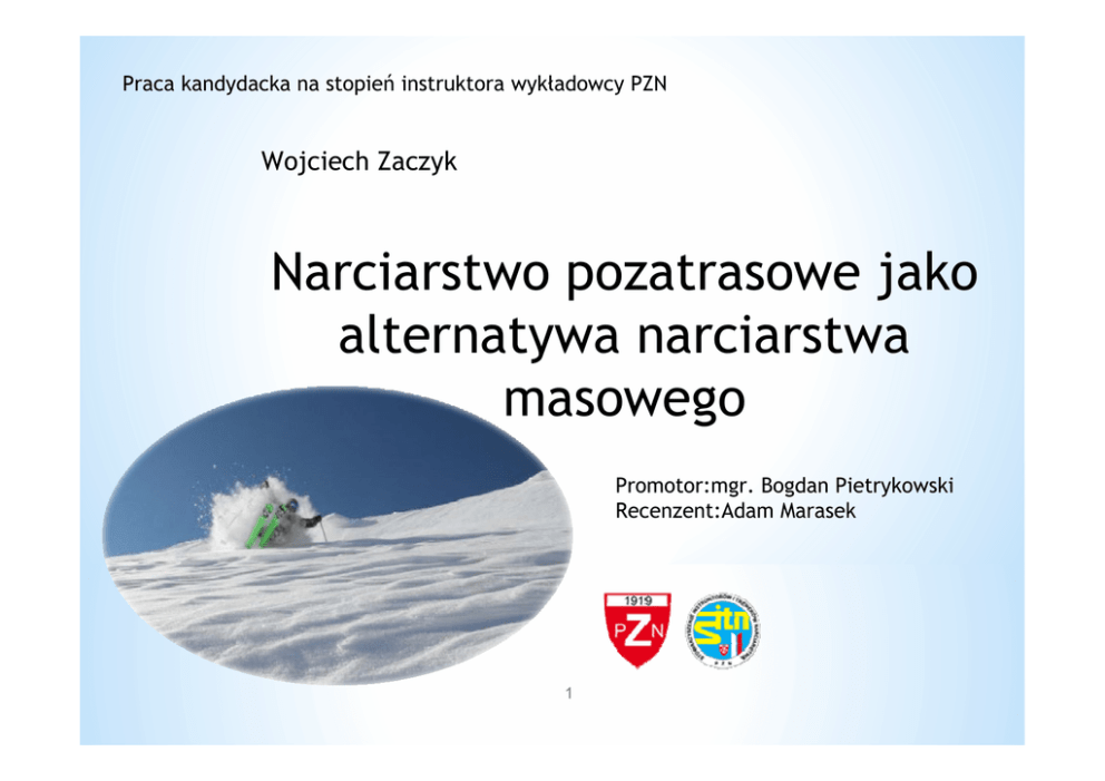 Praca kandydacka na stopień instruktora wykładowcy PZN Wojciech Zaczyk Narciarstwo pozatrasowe jako alternatywa narciarstwa masowego Promotor:mgr. Bogdan Pietrykowski Recenzent:Adam Marasek 1 Narciarstwo alpejskie jest masowo uprawiane przez liczną rzeszę narciarzy rekreacyjnych. Na trasach panuje tłok, hałas, rewia mody i sprzętu. Coraz więcej narciarzy, którzy szukają kontaktu z naturą, ciszy lub ekstremalnych doznań, wyrusza poza trasy. Żeby takie wyprawy były bezpieczne, niezbędny jest zasób wiedzy specjalistycznej. 2 Narciarstwo pozatrasowe jako alternatywa narciarstwa masowego W magazynach i na stronach internetowych można znaleźć wiele artykułów zachęcających do uprawiania tego typu narciarstwa, jest wiele informacji o sprzęcie, o zachwytach nad jazdą w puchu, ale niestety marginalnie jest poruszana sprawa bezpieczeństwa. 3 Narciarstwo pozatrasowe jako alternatywa narciarstwa masowego Jazda pozatrasowa może uzależniać, nie tylko, towarzysząca temu adrenalina, ale bliskość przyrody, spokój, i ten pierwszy pozostawiony tylko przez siebie ślad. To jest właśnie ta esencja jazdy poza trasami. To jest właśnie powrót do prawdziwych korzeni narciarstwa 4 Narciarstwo pozatrasowe jako alternatywa narciarstwa masowego Cel pracy Celem pracy jest krótkie scharakteryzowanie narciarstwa pozatrasowego, przedstawienie możliwych zagrożeń wynikających z uprawiania tego typu narciarstwa oraz próba scharakteryzowania osób które, podejmują ryzyko w narciarstwie pozatrasowym i ich motywacje wyboru tej odmiany narciarstwa na przykładzie wybranej grupy ankietowanych polskich narciarzy. 5 Narciarstwo pozatrasowe jako alternatywa narciarstwa masowego Terminologia związana z narciarstwem pozatrasowym może być mylącą, gdyż różne nazwy można używać zamiennie, odnosząc to tej samej jazdy. freeride back country skiing off-piste skiing skitouring skialpinizm extreme skiing heli-skiing cat-skiing 6 Narciarstwo pozatrasowe jako alternatywa narciarstwa masowego Terminy określające obszar uprawiania narciarstwa pozatrasowego Backcountry - jazda w nieoznakowanym terenie, z dala od kontrolowanych szlaków i ośrodków narciarskich off-piste - jazda pozatrasami w bliskim sąsiedztwie uczęszczanych tras i w kontrolowanym terenie ośrodków narciarskich Glade skiing (tree skiing) jazda pomiędzy drzewami 8 Narciarstwo pozatrasowe jako alternatywa narciarstwa masowego terminy opisujące sposób dostania się na szczyt heli-skiing narciarze dostają się na szczyt góry za pomocą helikoptera cat-skiing transport do góry przy pomocy ratraków lub skuterów śnieżnych ny określające technikę i taktykę wyprawy Skitouring - poruszanie się na nartach w urozmaiconym terenie – podejścia i zjazdy. charakterystyczną cechą sprzętu jest przełączana, wolna pięta i foki służące do podchodzenia przy stromszych stokach. narciarstwo wysokogórskie narciarstwo w terenie poza ośrodkami narciarskimi i szlakami, powyżej 1500 m n.p.m. ski – extreme - zjazdy na długich i stromych zboczach (nachylenie od 450 do 600+) w niebezpiecznym terenie ski-alpinizm - rodzaj sportu narciarskiego; połączenie wspinaczki zimowej, wędrówki na nartach oraz zjazdu narciarskiego w terenie górskim, o znacznym stopniu nachylenia i dużych niebezpieczeństwach obiektywnych. Istotą skialpinizmu jest połączenie wszystkich trzech elementów, Esencja narciarstwa wysokogórskiego a się w Norwegii. Tam właśnie Sondre Norheim zaprezentował specjalnie wyprofilowane narty, ały ułatwić wchodzenie w skręty. Według znych faktów, Sondre wraz z bratem czyli dach ich wiejskiego domu. Mariusz Zaruski uprawiał narciarstwo z prawdziwą pasją, a swoje bogate narciarskie doświadczenie opisywał w wielu wydanych przewodnikach, oraz publikacjach. Należał on do grupy pierwszych zdobywców Kasprowego Wierchu. Zasłynął z tego, że nawet w najtrudniejszych momentach podczas podchodzenia nie zdejmował nart. Był jednym z pierwszych propagatorów narciarstwa wysokogórskiego. Warto przytoczyć opis zjazdu Zaruskiego z Kościelca w roku 1911 Ze wspomnień „Kościelec na nartach” my się liną i ruszamy. Twardy i stromy śnieg, rozciągający się między dwiema przepaściami a gęsto ywany lodowymi polami, wał nam wielką uwagę i zupełnie usprawiedliwioną ostrożność, upadek na tych płaśniach mógł ąć za sobą fatalne następstwa. Asekurowaliśmy się, przeto kolejno w ten sposób, że gdy jeden z niżej o długość liny (25 metrów) mocno w śnieg wkopany, drugi puszczał się na dół i zatoczywszy półkole, zatrzymywał się o 50 metrów od miejsca, z którego wyruszył. Tak kolejno wielkimi łukami śmy do progu lodowego, ale i tu nart nie odpięliśmy. Jechałem pierwszy. Narty poniosły mię jak e, panowałem jednak nad niemi, zatoczyłem łuk i obróciwszy się na drugą stronę, zbliżałem się do wego zakosu, gdy narta mi się podwinęła na buli lodowej i upadłem. Od razu z zawrotną szybkością m spadać. Od razu też, leżąc, miałem już czekan pod pachą i z całej siły nim hamowałem. Czekan się i zgrzytał po lodzie, czułem jednak, że jestem panem sytuacji i zwalniam biegu. Jakoż po chwili Okolice Aiquille Verte (4102m) we Francji to prawdziwa mekka dla ekstremalistów. Jest to pięć trudnych kuluarów opadających w różne strony góry. W roku w 1967 Sylvian Saudan otwiera erę skiextreme zjeżdżając kuluarem Spencera o W tym samym roku niejaki Kurt Lapuch i Manfred Oberegger z Austrii, zjechali 55 stopni w Wysokich Taurach, 500- metrowym kuluarem. Podczas tego zjazdu asekurowali się 40 metrową liną oraz podjęli ryzyko miękkiego śniegu, gdyż nie wierzyli w jakiekolwiek inne oparcie dla nart w innych warunkach. Jednym z pionierów ski extreme w USA jest Glen Plake, 3-krotny mistrz świata Hot Dog Ski, autor i aktor wielu filmów o narciarstwie ekstremalnym. O popularności freeridu świadczą liczne zawody rozgrywane od lat w ych 