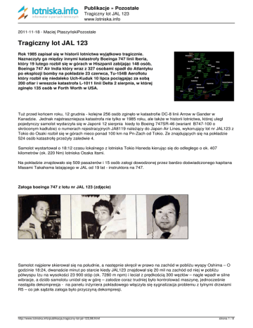 Publikacje » Pozostałe Tragiczny lot JAL 123 www.lotniska.info 2011-11-18 - Maciej PtaszyńskiPozostałe Tragiczny lot JAL 123 Rok 1985 zapisał się w historii lotnictwa wyjątkowo tragicznie. Naznaczyły go między innymi katastrofy Boeinga 747 linii Iberia, który 19 lutego rozbił się w górach w Hiszpanii zabijając 148 osób, Boeinga 747 Air India który wraz z 327 osobami spadł do Atlantyku po eksplozji bomby na pokładzie 23 czerwca, Tu-154B Aerofłotu który rozbił się niedaleko Uch-Kuduk 10 lipca pociągając za sobą 200 ofiar i wreszcie katastrofa L-1011 linii Delta 2 sierpnia, w której zginęło 135 osób w Forth Worth w USA. Tuż przed końcem roku, 12 grudnia - kolejne 256 osób zginęło w katastrofie DC-8 linii Arrow w Gander w Kanadzie. Jednak najstraszniejsza katastrofa nie tylko w 1985 roku, ale także w historii lotnictwa, której uległ pojedynczy samolot wydarzyła się w Japonii 12 sierpnia kiedy to Boeing 747SR-46 (wariant B747-100 o skróconym kadłubie) o numerach rejestracyjnych JA8119 należący do Japan Air Lines, wykonujący lot nr JAL123 z Tokio do Osaki rozbił się w górach nieco ponad 100 km na Pn-Zach od Tokio. Ze znajdujących się na pokładzie 524 osób katastrofę przeżyły zaledwie 4. Samolot wystartował o 18:12 czasu lokalnego z lotniska Tokio Haneda kierując się do odległego o ok. 407 kilometrów (ok. 220 Nm) lotniska Osaka Itami. Na pokładzie znajdowało się 509 pasażerów i 15 osób załogi dowodzonej przez bardzo doświadczonego kapitana Masami Takahama latającego w JAL od 19 lat - instruktora na 747. Załoga boeinga 747 z lotu nr JAL 123 (zdjęcie) Samolot najpierw skierował się na południe, a następnie skręcił w prawo na zachód w pobliżu wyspy Oshima – O godzinie 18:24, dwanaście minut po starcie kiedy JAL123 znajdował się 20 mil na zachód od niej w pobliżu półwyspu Izu na wysokości 23 900 stóp (ok. 7280 m npm) i leciał z prędkością 300 węzłów – nagle wpadł w silne wibracje, a dziób samolotu uniósł się w górę – załodze coraz trudniej było kontrolować maszynę, jednocześnie nastąpiła dekompresja - na panelu inżyniera pokładowego włączyła się sygnalizacja problemu z tylnymi drzwiami R5 – co jak sądziła załoga było przyczyną dekompresji. http://www.lotniska.info/publikacja,tragiczny-lot-jal-123,98.html strona 1 / 8 Publikacje » Pozostałe Tragiczny lot JAL 123 www.lotniska.info Lecąca w tym locie jako pasażer, stewardessa linii JAL Yumi Ochiai, jedna z 4 czterech ocalałych osób opisała to co wydarzyło się wtedy w kabinie pasażerskiej następująco: „Najpierw miał miejsce głośny huk – to było nad głową z tyłu (siedziała w rzędzie 56 więc dźwięk dochodził z samego tyłu samolotu przyp. aut). Uszy zaczęły mnie boleć. Nagle wewnątrz kabiny zrobiło się biało.” – nastąpiła dekompresja samolotu przyp. aut.). Otworzył się otwór wentylacyjny wyrównania ciśnienia pomiędzy lukiem bagażowym a kabiną pasażerską umieszczony przy fotelach załogi kabinowej. Nie było słychać eksplozji, zerwany został sufit tylnej toalety. Automatycznie wypadły maski tlenowe. W rzeczywistości problem był znacznie poważniejszy niż dekompresja drzwi – część statecznika pionowego o długości 5 m wraz ze sterem kierunku oraz tylną końców kadłuba (zawierającą pomocniczą jednostkę napędową APU) zostały oderwane od samolotu. W wyniku tego przerwane zostały przewody hydrauliczne instalacji zasilającej napędy sterów wysokości, lotek, oraz zniszczony system stabilizacji kierunkowej (yaw damper) – płyn hydrauliczny wyciekał z systemu. System sterowania samolotu wykrwawiał się. Konstrukcja feralnego elementu boeinga 747 (zdjęcie) Załoga samolotu zgłosiła kontrolerowi problem z samolotem i poprosiła o zgodę na powrót do Tokio na lotnisko Haneda oraz o zgodę na obniżenie pułapu do 22 000 stóp. Dwie minuty później załoga wprowadziła do http://www.lotniska.info/publikacja,tragiczny-lot-jal-123,98.html strona 2 / 8 Publikacje » Pozostałe Tragiczny lot JAL 123 www.lotniska.info transpondera kod 7700 oznaczający niebezpieczeństwo i potwierdziła to kontrolerowi werbalnie. Sterowanie samolotem stawało się coraz bardziej utrudnione – nie można było utrzymać kursu, wpadł on w oscylacje o interwale 20 do 100 sekund podczas których tracił a potem odzyskiwał nawet do 700 m wysokości w jednym cyklu – wznosił się i kiedy prędkość zmniejszała się opuszczał nos i nurkował rozpędzając się tak długo aż wzrost prędkości powodował wzrost siły nośnej na skrzydłach co powodowało podniesienie nosa i rozpoczęcie wznoszenia aż do ponownej utraty prędkości. Kontrola lotu w Tokio skierowała uszkodzony samolot z powrotem na lotnisko Haneda jednak bez steru kierunku oraz bez działających lotek sterowanie kierunkiem lotu nie było możliwe – w rezultacie samolot zaczął krążyć w sposób niekontrolowany przemieszczając się stopniowo na północny zachód zamiast na północny wschód w stronę Tokio. Około godziny 18:31 kontroler z Tokio zaproponował załodze próbę lądowania na lotnisku w Nagoi od której wówczas samolot znajdował się w odległości 72 mil – załoga jednak chciała wrócić do Tokio. Mapa przelotu samolotu JAL 123 (zdjęcie) O 18:35 wyczerpał się zapas tlenu dla masek w kabinie jednak pasażerowie byli w stanie oddychać – Załoga http://www.lotniska.info/publikacja,tragiczny-lot-jal-123,98.html strona 3 / 8 Publikacje » Pozostałe Tragiczny lot JAL 123 www.lotniska.info pokładowa przygotowywała pasażerów do lądowania awaryjnego. Wtedy też załoga podjęła próbę opanowania samolotu i ustabilizowania jego lotu sterując wyłącznie ciągiem silników – zmniejszając go dla silników z jednej strony i zwiększając z przeciwnej – jednak te działania spowodowały gwałtowne przechylenia samolotu i niekontrolowane zmiany kierunku lotu – w rezultacie sam