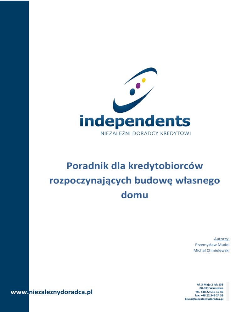 Poradnik dla kredytobiorców rozpoczynających budowę własnego domu Autorzy: Przemysław Mudel Michał Chmielewski www.niezaleznydoradca.pl Al. 3 Maja 2 lok 136 00-391 Warszawa tel. +48 22 616 12 46 fax: +48 22 349 24 39 [email protected] Większość z nas marzy o swoim własnym domu z pięknym ogrodem, gdzie można odpocząć od zmartwień i kłopotów dnia codziennego. Jednak niewiele osób zdaje sobie sprawę, iż budowa domu sposobem gospodarczym to nie lada wyzwanie. Myśląc o wybudowaniu swojego wymarzonego domu, należy zacząć od finansowania całej inwestycji. Ważną pytaniem, na które należy odpowiedzieć możliwi wcześniej, jest pytanie o to czy chcemy sfinansować inwestycję w całości z kredytu, czy też w części z własnych oszczędności. Warto, więc zbadać swoją zdolność kredytową w różnych bankach jeszcze przed rozpoczęciem pierwszych kroków formalnych związanych z budową. Mówiąc o zbadaniu możliwości finansowych, mamy na myśli poznanie brzegowych wartości, widełek, w których banki zaszufladkują każdego kredytobiorcę (zdolność kredytowa - jest to indywidualnie oceniana przez bank zdolność Wnioskodawcy do spłaty kredytu wraz z jego odsetkami według założonego harmonogramu). Zdolność statystycznego kredytobiorcy różni się w znaczący sposób w zależności od polityki kredytowej wybranego banku (na jej wielkość mają wpływ zarobki, zobowiązania finansowe, posiadany wkład własny, wiek, wykształcenie oraz inne istotne dla banku czynniki). Różnice w szacowaniu zdolności kredytowej przez funkcjonujące na krajowym rynku banki mogą dochodzić w wybranych przypadkach do setek tysięcy złotych. Dbając, więc o bezpieczeństwo założonych planów, w pierwszym kroku zalecamy sprawdzenie zarówno minimalnej jak i maksymalnej dostępnej dla kredytobiorcy kwoty kredytu. Dopiero z tą wiedzą radzimy wykonać kolejny ruchy związane z zaprojektowaniem domu oraz uzyskaniem pozwolenia na budowę. Równolegle z wysiłkami formalnymi zmierzającymi do rozpoczęcia budowy warto powrócić do myślenia o kredycie i ostatecznie ustalić kryteria, według których porównywane będą oferty banków. W tym momencie sugerujemy zwrócić szczególną uwagę na następujące czynniki: Waluta kredytu Wymagany wkład własny Maksymalny okres kredytowania Opłaty około kredytowe Szybkość podejmowania przez bank decyzji Sposób wypłaty oraz rozliczania kolejnych transz kredytu Wszystkie te elementy powinny mieć odzwierciedlenie w budowanym przez nas planie finansowania inwestycji. Błędne dobranie kryteriów może doprowadzić do wyboru jedynie pozornie najkorzystniejszej oferty lub do odrzucenia naszego wniosku kredytowego przez bank. Naszym zdaniem oferty banków różnią się między sobą na tyle, że nie możemy mówić o „kredytowym panaceum”, które będzie spełniało oczekiwania wszystkich kredytobiorców równocześnie. Wybór optymalnego rozwiązania kredytowego zależy przede wszystkim od planów życiowych kredytobiorcy. Banki, tworząc swoje produkty, prześcigają się w pomysłowym zarabianiu na kredycie. Zadłużając się, należy wybrać tę ofertę, która pozwoli na zrealizowanie naszej strategii, utrudniając równocześnie realizację zysku naszemu kredytodawcy. Chcąc skredytować budowę domu, należy pamiętać o tym, że istnieją dwie ścieżki, którymi można podążać. Pierwszym rozwiązaniem jest budowa domu na działce, należącej już do kredytobiorcy. W tym przypadku bank pożycza środki, mając pewność, że budowa się rozpocznie w planowanym terminie, ponieważ warunkiem uruchomienia kredytu jest przedstawianie prawomocnego pozwolenia na budowę. Drugi przypadek dotyczy osób, które zamierzają sfinansować jednym kredytem zarówno www.niezaleznydoradca.pl Al. 3 Maja 2 lok 136 00-391 Warszawa tel. +48 22 616 12 46 fax: +48 22 349 24 39 [email protected] zakup działki, jaki i budowę domu. Taki przypadek jest trudniejszy do zrealizowania, ponieważ znacznie mniej banków zechce finansować inwestycję, w której nie ma pewności, kiedy i czy w ogóle zostanie wydane pozwolenie na budowę. Ponieważ w obu przypadkach wydanie pozwolenia na budowę jest kluczowym czynnikiem, od którego zależy pozyskanie finansowania, chcielibyśmy przybliżyć Państwu procedurę prowadzącą do uzyskania tego dokumentu. W pierwszym kroku powinniśmy się udać do urzędu miasta/gminy z wnioskiem o wydanie planu zagospodarowania przestrzennego. W przypadku, gdy plan zagospodarowania przestrzennego nie jest dostępny, wnioskuje się o wydanie decyzji o warunkach zabudowy na wybranej przez nas działce ( Urząd gminy/miasta ma dwa miesiące na rozpatrzenie wniosku i wydanie stosownego dokumentu). W kolejnym kroku czeka nas zwrócenie się do Starostwa Powiatowego o wydanie decyzji pozwolenia na budowę na podstawie uzyskanej wcześniej decyzji o warunkach zabudowy lub planu zagospodarowania przestrzennego. Do wniosku o wydanie pozwolenia na budowę należy załączyć: Wypis z planu zagospodarowania przestrzennego lub decyzję o warunkach zabudowy (prawomocną) Projekt budowlany – wraz wymaganymi opiniami Dokument potwierdzający prawo własności do nieruchomości, na której ma rozpocząć się inwestycja (przeważnie jest to akt notarialny nabycia działki) Inne wymagane opinie i uzgodnienia techniczne Jeżeli wniosek będzie zawierał wszystkie wymagane dokumenty, Starosta Powiatowy powinien w ciągu miesiąca wydać decyzję o pozwoleniu na budowę. W takim wypadku po upływie dwóch tygodni decyzja powinna się uprawomocnić i w tym momencie powinniśmy powrócić do kwestii związanych z kredytem. Równocześnie pamiętajmy, że pozwolenie na budowę ważne jest przez 2 lata od momentu uprawomocnienia się decyzji. W przypadku, gdy we wskazanym terminie nie rozpoczniemy budowy domu, cała procedura będzie musiała być przeprowadzona od początku. Opisując listę dokumentów składanych wraz z w