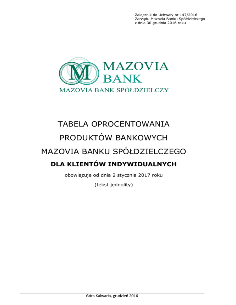 Załącznik do Uchwały nr 147/2016 Zarządu Mazovia Banku Spółdzielczego z dnia 30 grudnia 2016 roku TABELA OPROCENTOWANIA PRODUKTÓW BANKOWYCH MAZOVIA BANKU SPÓŁDZIELCZEGO DLA KLIENTÓW INDYWIDUALNYCH obowiązuje od dnia 2 stycznia 2017 roku (tekst jednolity) Góra Kalwaria, grudzień 2016 Spis treści 1. POSTANOWIENIA OGÓLNE ......................................................................................... 3 2. PRODUKTY KREDYTOWE .............................................................................................. 4 3. PRODUKTY DEPOZYTOWE ........................................................................................... 5 4. RACHUNKI ............................................................................................................................ 7 5. PRODUKTY WYCOFANE Z OFERTY .......................................................................... 8 2|Strona Tabela oprocentowania Produktów bankowych w Mazovia BS dla Klientów Indywidualnych 1. POSTANOWIENIA OGÓLNE 1.1. Tabela oprocentowania produktów bankowych Mazovia Banku Spółdzielczego dla klientów indywidualnych, zwana dalej „Tabelą oprocentowania dla Klientów Indywidualnych” ma zastosowanie do czynności bankowych realizowanych w placówkach Banku oraz za pośrednictwem dostępnych kanałów elektronicznych. 1.2. Użyte w Tabeli oprocentowania dla Klientów Indywidualnych określenie „Bank” należy rozumieć jako Mazovia Bank Spółdzielczy. 1.3. Oprocentowanie podane w dwóch opcjach stanowi alternatywę dla Klienta i jest ustalane indywidualnie pomiędzy Stronami. 1.4. Aktualnie obowiązująca Tabela oprocentowania dla Klientów Indywidualnych dostępna jest w każdej placówce Banku oraz na stronie internetowej Banku (www.mazoviabank.pl). 1.5. Niniejsza regulacja ma charakter ogólny obowiązujący wszystkich Klientów. Odmienne postanowienia mogą wynikać z umów zawieranych z Bankiem. 3|Strona Tabela oprocentowania Produktów bankowych w Mazovia BS dla Klientów Indywidualnych 2. PRODUKTY KREDYTOWE L.p. 1. Rodzaj produktu / okres kredytowania / oprocentowanie Dla limitów bez pomniejszeń Stopa kredytu lombardowego ustalana przez Narodowy Bank Polski x 3,80 Limit odnawialny w Rachunku oszczędnościowo-rozliczeniowym Dla limitów z pomniejszeniami Stopa kredytu lombardowego ustalana przez Narodowy Bank Polski x 4,00 Kredyt konsumencki gotówkowy (udzielany od 02.01.2017 roku) Oprocentowanie 1. 9,99% Kredyt mieszkaniowy „Mój Dom” (dotyczy również kredytów w ramach programu Mieszkanie dla Młodych) 1 Oprocentowanie 6. WIBOR 3M2 + marża Banku3 Uniwersalny Kredyt Hipoteczny1 Oprocentowanie 7. WIBOR 3M2 + marża Banku3 WYSOKOŚĆ OPROCENTOWANIA PRZETERMINOWANEGO Dwukrotność odsetek ustawowych za opóźnienie określonych w art. 481 §2 Kodeksu cywilnego 1 Wysokość oprocentowania uzależniona jest od oceny przez Bank zdolności kredytowej wnioskodawcy, prawnego zabezpieczenia kredytu oraz okresu kredytowania. 2 Wysokość stawki bazowej międzybankowej WIBOR 3M dla kredytu mieszkaniowego „Mój Dom” oraz dla Uniwersalnego Kredytu Hipotecznego, ustalana jest wg stanu na ostatni dzień kwartału poprzedzającego kwartał, w którym stawka będzie obowiązywać i stanowi ono średnią stawek dziennych obowiązujących w miesiącu, na koniec którego wyliczana jest średnia. 3 Ustalona jest indywidualnie dla każdego klienta i jest uzależniona od indywidualnych warunków transakcji, w tym m.in. od kwoty kredytu, wartości prawnego zabezpieczenia kredytu oraz produktów i usług bankowych, które posiada lub z których skorzysta klient. 4|Strona Tabela oprocentowania Produktów bankowych w Mazovia BS dla Klientów Indywidualnych 3. PRODUKTY DEPOZYTOWE L.p . Rodzaj produktu / okres lokacyjny / oprocentowanie MojaLOKATA Max w PLN (udzielana od 06.07.2015r.) Okres lokaty Oprocentowanie stałe oprocentowanie zmienne do 19.999,99 zł od 20.000,00 zł 1. 1M 0,30% WIBID 1M – 1,00pp(0,46%) WIBID 1M – 0,80pp(0,66%) 2. 3M 0,50% WIBID 1M - 0,80pp(0,66%) WIBID 1M - 0,60pp(0,86%) 3. 6M - WIBID 1M - 0,70pp(0,76%) WIBID 1M - 0,50pp(0,96%) 4. 9M - WIBID 1M - 0,70pp(0,76%) WIBID 1M - 0,50pp(0,96%) 5. 12M - WIBID 1M - 0,60pp(0,86%) WIBID 1M - 0,40pp(1,06%) 6. 24M - WIBID 1M - 0,60pp(0,86%) WIBID 1M - 0,40pp(1,06%) 7. 36M - WIBID 1M - 0,60pp(0,86%) WIBID 1M - 0,40pp(1,06%) Warunki lokaty: – Minimalna kwota lokaty wynosi 1.000,00 zł, – Oprocentowanie liczone w skali roku, – Lokata odnawialna na podstawie tabeli oprocentowania obowiązującej w dniu odnowienia, – Oprocentowanie podane w nawiasie jest aktualne na dzień zatwierdzenia niniejszej Tabeli oprocentowania dla Klientów Indywidualnych, – Wysokości stawki bazowej międzybankowej WIBID 1M stanowi średnią stawek dziennych obowiązujących w miesiącu poprzedzającym miesiąc obowiązywania stawki. MojaLOKATA Max w EUR i USD Okres lokaty w EUR w USD 1. 1M 0,01% 0,01% 2. 3M 0,01% 0,01% 3. 6M 0,01% 0,10% 4. 9M 0,05% 0,20% 5. 12M 0,10% 0,25% Warunki lokaty: – Minimalna kwota lokaty wynosi 500 EUR lub 500 USD, – Oprocentowanie zmienne liczone w skali roku, – Lokata odnawialna na podstawie tabeli oprocentowania obowiązującej w dniu odnowienia. MojaLOKATA z książeczką w PLN Okres lokaty Oprocentowanie lokaty 1. 1M 0,20% 2. 3M 0,30% 3. 6M 0,40% 4. 9M 0,40% 5. 12M 0,60% 6. 24M 0,60% 5|Strona Tabela oprocentowania Produktów bankowych w Mazovia BS dla Klientów Indywidualnych 7. 36M 0,60% Warunki lokaty: – Minimalna kwota lokaty wynosi 1.000,00 zł, – Oprocentowanie zmienne liczone w skali roku, – Możliwość dopłat w trakcie trwania lokaty. Minimalna kwota dopłaty wynosi 300,00 zł, – Lokata odnawialna na podstawie tabeli oprocentowania obowiązującej w dniu odnowienia MojaLOKATA Dynamiczna w PLN 1. Okres lokaty 1M 2M 3M 4M 5M 6M 7M 8M 9M 10M 11M 12M % 0,30 0,40 0,50 0,60 0,70 0,80 1,00 1,20 1,50 1,80 2,10 2,40 Warunki lokaty: – Minimalna kwota lokaty wynosi 1.000,00 zł, – Oprocentowanie
