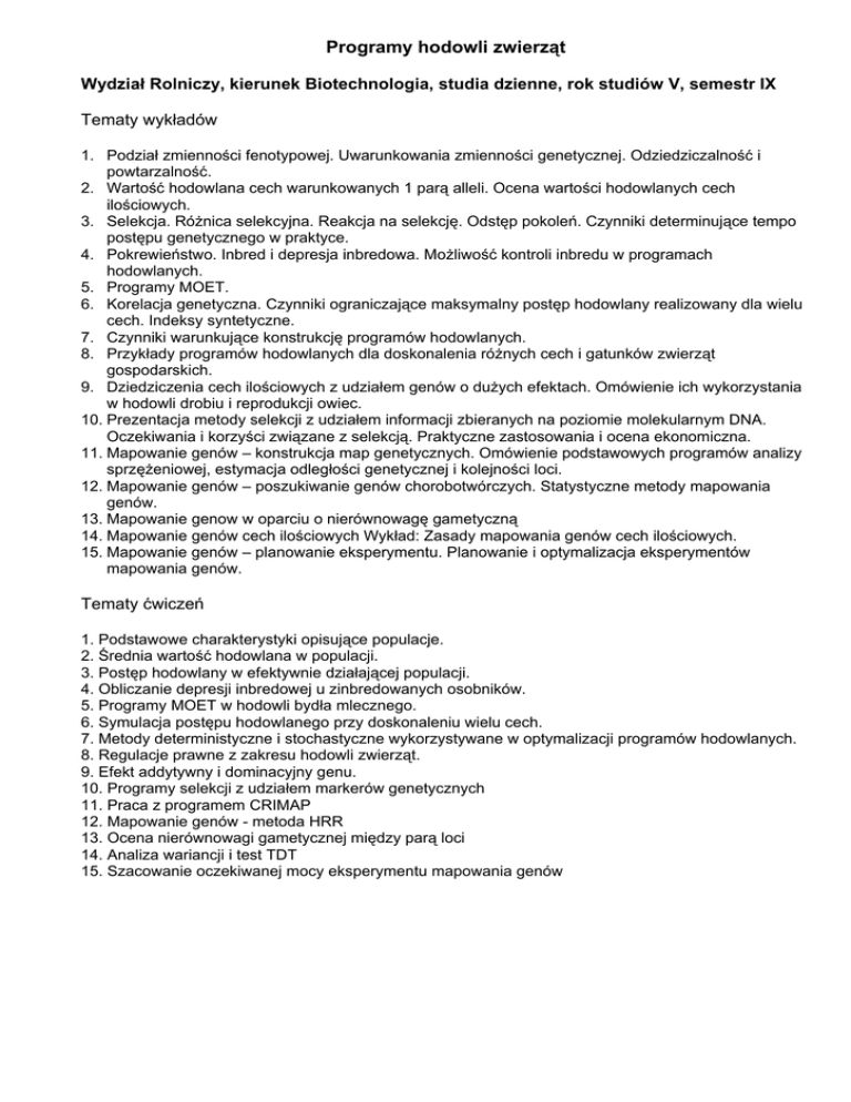Programy hodowli zwierząt Wydział Rolniczy, kierunek Biotechnologia, studia dzienne, rok studiów V, semestr IX Tematy wykładów 1. Podział zmienności fenotypowej. Uwarunkowania zmienności genetycznej. Odziedziczalność i powtarzalność. 2. Wartość hodowlana cech warunkowanych 1 parą alleli. Ocena wartości hodowlanych cech ilościowych. 3. Selekcja. Różnica selekcyjna. Reakcja na selekcję. Odstęp pokoleń. Czynniki determinujące tempo postępu genetycznego w praktyce. 4. Pokrewieństwo. Inbred i depresja inbredowa. Możliwość kontroli inbredu w programach hodowlanych. 5. Programy MOET. 6. Korelacja genetyczna. Czynniki ograniczające maksymalny postęp hodowlany realizowany dla wielu cech. Indeksy syntetyczne. 7. Czynniki warunkujące konstrukcję programów hodowlanych. 8. Przykłady programów hodowlanych dla doskonalenia różnych cech i gatunków zwierząt gospodarskich. 9. Dziedziczenia cech ilościowych z udziałem genów o dużych efektach. Omówienie ich wykorzystania w hodowli drobiu i reprodukcji owiec. 10. Prezentacja metody selekcji z udziałem informacji zbieranych na poziomie molekularnym DNA. Oczekiwania i korzyści związane z selekcją. Praktyczne zastosowania i ocena ekonomiczna. 11. Mapowanie genów – konstrukcja map genetycznych. Omówienie podstawowych programów analizy sprzężeniowej, estymacja odległości genetycznej i kolejności loci. 12. Mapowanie genów – poszukiwanie genów chorobotwórczych. Statystyczne metody mapowania genów. 13. Mapowanie genow w oparciu o nierównowagę gametyczną 14. Mapowanie genów cech ilościowych Wykład: Zasady mapowania genów cech ilościowych. 15. Mapowanie genów – planowanie eksperymentu. Planowanie i optymalizacja eksperymentów mapowania genów. Tematy ćwiczeń 1. Podstawowe charakterystyki opisujące populacje. 2. Średnia wartość hodowlana w populacji. 3. Postęp hodowlany w efektywnie działającej populacji. 4. Obliczanie depresji inbredowej u zinbredowanych osobników. 5. Programy MOET w hodowli bydła mlecznego. 6. Symulacja postępu hodowlanego przy doskonaleniu wielu cech. 7. Metody deterministyczne i stochastyczne wykorzystywane w optymalizacji programów hodowlanych. 8. Regulacje prawne z zakresu hodowli zwierząt. 9. Efekt addytywny i dominacyjny genu. 10. Programy selekcji z udziałem markerów genetycznych 11. Praca z programem CRIMAP 12. Mapowanie genów - metoda HRR 13. Ocena nierównowagi gametycznej między parą loci 14. Analiza wariancji i test TDT 15. Szacowanie oczekiwanej mocy eksperymentu mapowania genów