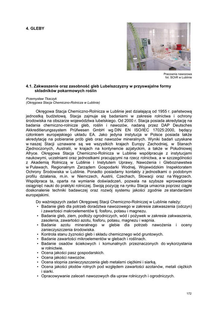 4. GLEBY Pracownia nawozowa fot. SChR w Lublinie 4.1. Zakwaszenie oraz zasobność gleb Lubelszczyzny w przyswajalne formy składników pokarmowych roślin Przemysław Tkaczyk (Okręgowa Stacja Chemiczno-Rolnicza w Lublinie) Okręgowa Stacja Chemiczno-Rolnicza w Lublinie jest działającą od 1955 r. państwową jednostką budżetową. Stacja zajmuje się badaniami w zakresie rolnictwa i ochrony środowiska na obszarze województwa lubelskiego. Od 2000 r. Stacja posiada akredytację na badania chemiczno-rolnicze gleb, roślin i nawozów, nadaną przez DAP Deutsches Akkreditierungssystem Prüfwesen GmbH wg DIN EN ISO/IEC 17025:2000, będący członkiem europejskiego układu EA. Jako jedyna instytucja w Polsce posiada także akredytację na pobieranie prób gleb oraz nawozów mineralnych. Wyniki badań uzyskane w naszej Stacji uznawane są we wszystkich krajach Europy Zachodniej, w Stanach Zjednoczonych, Australii, w krajach na kontynencie azjatyckim, a także w Południowej Afryce. Okręgowa Stacja Chemiczno-Rolnicza w Lublinie współpracuje z instytucjami naukowymi, uczelniami oraz jednostkami pracującymi na rzecz rolnictwa, a w szczególności z Akademią Rolniczą w Lublinie i Instytutem Uprawy, Nawożenia i Gleboznawstwa w Puławach, Regionalnym Zarządem Gospodarki Wodnej, Wojewódzkim Inspektoratem Ochrony Środowiska w Lublinie. Ponadto posiadamy kontakty z jednostkami o podobnym profilu działania, m.in. w Niemczech, Austrii, Czechach, Słowacji oraz na Węgrzech. Współpraca ta, oparta na wymianie doświadczeń, pozwala na szybsze wprowadzenie osiągnięć nauki do praktyki rolniczej. Swoją pozycję na rynku Stacja umacnia poprzez ciągłe doskonalenie techniki badawczej oraz rozwój systemu jakości zgodnie ze standardami europejskimi. Do ważniejszych zadań Okręgowej Stacji Chemiczno-Rolniczej w Lublinie należy: • Badanie gleb dla potrzeb doradztwa nawozowego w zakresie zakwaszenia (odczyn) i zawartości makroelementów tj. fosforu, potasu i magnezu. • Badanie gleb, ziem, podłoży ogrodniczych, wód i pożywek w zakresie zakwaszenia, zasolenia, zawartości azotu, fosforu, potasu, magnezu i wapnia. • Badanie azotu mineralnego w glebie dla potrzeb nawożenia i oceny zanieczyszczenia środowiska. • Kontrola stanu żyzności gleb i składu chemicznego wód gruntowych. • Badanie zawartości mikroelementów w glebach i roślinach. • Badanie osadów ściekowych i komunalnych przeznaczonych do wykorzystania w rolnictwie. • Ocena jakości pasz gospodarskich. • Ocena jakości nawozów. • Ocena stopnia zanieczyszczenia gleb metalami ciężkimi i siarką. • Ocena jakości płodów rolnych pod względem zawartości azotanów, metali ciężkich i siarki. • Opracowywanie zaleceń nawozowych dla upraw rolniczych i ogrodniczych. 172 • Sporządzanie map stanu zakwaszenia, potrzeb wapnowania oraz zasobności gleb w makro- i mikroelementy. • Opiniowanie przydatności gruntów w zakresie ich rolniczego zagospodarowania. • Wykonywanie ekspertyz i wydawanie opinii dotyczących zasobności gleb, składu chemicznego roślin i nawozów oraz prawidłowego stosowania nawozów. • Doradztwo nawozowe dla różnych kierunków produkcji roślinnej. • Prowadzenie działalności szkoleniowej i informacyjnej. • Tworzenie i prowadzenie bazy danych dotyczących zasobności gleb w azot i fosfor oraz zanieczyszczenia azotanami wód w profilu glebowym do 90 cm pod powierzchnią terenu. Wstęp Nadmierne zakwaszenie gleb jest czynnikiem zmniejszającym efektywność stosowania większości zabiegów agrotechnicznych, a zwłaszcza nawożenia mineralnego oraz przyczynia się do ograniczenia plonów. Oprócz tego obserwuje się wtórne skutki zakwaszenia gleby, do których należy zmniejszenie trwałości wiązań pakietów minerałów, rozpad makrokrystalicznej struktury wtórnych minerałów ilastych, zmniejszenie zdolności sorpcyjnej, a przede wszystkim pojawienie się dużych ilości glinu i manganu toksycznego dla roślin. Główną przyczyną tego stanu jest nasz umiarkowany klimat z przewagą opadów nad parowaniem, w wyniku czego kationy zasadowe, głównie magnez (Mg2+) i wapń (Ca2+), przemieszczane są w głąb gleby. Również duży wpływ na zakwaszenie mają rośliny, które zubożają glebę pobierając z niej niezbędne do wzrostu i rozwoju pierwiastki, w tym kationy zasadowe (Ca2+ i Mg2+). Oprócz czynników naturalnych nie mniej ważne są tzw. czynniki antropogeniczne do których należą: stosowanie nawozów (szczególnie azotowych typu amonowego i nawozów potasowych), zanieczyszczenie powietrza, zwłaszcza związkami siarki i azotu (w postaci kwaśnych opadów mokrych lub suchych). Szczególną rolę w procesie zakwaszenia odgrywa niedostosowanie dawek nawozów fizjologicznie kwaśnych do faktycznych potrzeb nawozowych roślin. Zabiegiem ograniczającym niepożądane skutki zakwaszenia gleb jest wapnowanie Naturalna zasobność gleb uprawnych w składniki pokarmowe nie zabezpiecza w pełni potrzeb pokarmowych roślin. Brak odpowiedniej ilości składników w formach przystępnych w środowisku bytowania roślin wpływa na spadek plonów oraz obniżenie ich wartości biologicznej. Konsekwencją zbyt niskiej zasobności gleb w składniki pokarmowe w stosunku do potrzeb pokarmowych roślin jest spadek żyzności gleby, wynikający z wyczerpania jej ze składników pokarmowych. Składniki pokarmowe roślin występują w glebie w różnych formach i ilościach. Z rolniczego punktu widzenia czyli żywienia roślin, najważniejszą grupę stanowią formy przyswajalne, na które to składają się ilości pierwiastka znajdujące się w roztworze glebowym, kompleksie sorpcyjnym oraz występujące w formie słabiej rozpuszczalnych soli. O ich pobraniu decyduje wiele czynników, z których najważniejsze to wiek i gatunek rośliny, wilgotność i napowietrzenie gleby, odczyn, stosunki jonowe, a także temperatura i nasłonecznienie. Do najważniejszych makroelementów m