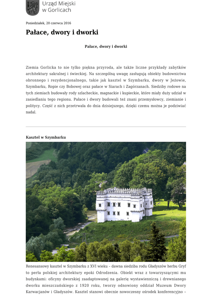 Poniedziałek, 20 czerwca 2016 Pałace, dwory i dworki Pałace, dwory i dworki Ziemia Gorlicka to nie tylko piękna przyroda, ale także liczne przykłady zabytków architektury sakralnej i świeckiej. Na szczególną uwagę zasługują obiekty budownictwa obronnego i rezydencjonalnego, takie jak kasztel w Szymbarku, dwory w Jeżowie, Szymbarku, Ropie czy Bobowej oraz pałace w Siarach i Zagórzanach. Siedziby rodowe na tych ziemiach budowały rody szlacheckie, magnackie i kupieckie, które miały duży udział w zasiedlaniu tego regionu. Pałace i dwory budowali też znani przemysłowcy, ziemianie i politycy. Część z nich przetrwała do dnia dzisiejszego, dzięki czemu można je podziwiać nadal. Kasztel w Szymbarku Renesansowy kasztel w Szymbarku z XVI wieku – dawna siedziba rodu Gładyszów herbu Gryf to perła polskiej architektury epoki Odrodzenia. Obiekt wraz z towarzyszącymi mu budynkami: oficyny dworskiej zaadaptowanej na galerię wystawienniczą i drewnianego dworku mieszczańskiego z 1920 roku, tworzy odnowiony oddział Muzeum Dwory Karwacjanów i Gładyszów. Kasztel stanowi obecnie nowoczesny ośrodek konferencyjno – wystawienniczy. Kasztel stojący na stromej skarpie nad rzeką Ropą został wzniesiony z kamienia w XVI wieku, a przebudowany w 1580 roku. W wieku XIX i XX wieku kasztel znacznie podupadł. Dzisiaj jest po generalnym remoncie, który przywrócił mu dawny wygląd. Piętrowy budynek na planie prostokąta wieńczy renesansowa attyka, a w narożach wznoszą się kwadratowe alkierze. Dane kontaktowe: Ośrodek Konferencyjno-Wystawienniczy „Kasztel w Szymbarku” Szymbark, 38-311 Szymbark (+48) 18 351 31 14 [email protected] www.muzeum.gorlice.pl Godziny otwarcia: maj – wrzesień poniedziałek – piątek 9.00 – 17.00 sobota, niedziela: 9.00 – 18.00 październik – kwiecień poniedziałek – niedziela: 9.00 – 16.00 Ceny biletów: Wstęp wolny. Dwór Groblewskich w Szymbarku Dawny dwór Groblewskich znajduje się przy drodze z Szymbarku do Bystrej. Obecnie znajduje się w nim Stacja Badawcza Instytutu Geografii Polskiej Akademii Nauk. Pałac Długoszów w Siarach Perełką architektury Ziemi Gorlickiej jest Pałac Długoszów w Siarach koło Gorlic. Był własnością Władysława Długosza, który wybudował go w miejscu dworu odkupionego od Władysława Dembowskiego. Obecny pałac stoi na miejscu dwóch poprzednich, które spłonęły w pożarach w latach 1916 i 1923. Secesyjny pałac jest usytuowany na stromej skarpie opadającej w stronę rzeki Sękówki i ulicy J. Kochanowskiego. Wybudowany na podstawie projektu wiedeńskiego atelier architektonicznego Fellnera i Helmera, znanego z planów przebudowy teatru zamkowego w Łańcucie czy pałacu Goetzów w Okocimiu zachwyca ciekawą bryłą, owalnymi lukarnami, mansardowymi dachami oraz sięgającymi niemal posadzek oknami. Z bogactwem form architektonicznych pałacu doskonale komponuje się bogaty wystrój elewacji oraz wnętrza – jasne, przestronne pokoje, wielki hol wejściowy, schody o marmurowej balustradzie, sala balowa, piękne piece kaflowe i kominki. W urokliwym parku otaczającym pałac obok wiekowych dębów, smukłych świerków i dostojnych platanów obejrzeć można rzeźby ogrodowe znanego lwowskiego rzeźbiarza Piotra Wojtowicza, który w roku 1911 wykonał na zamówienie Długosza około 60 rzeźb z kamienia. Zachwycają mitologiczne postaci Neptuna w rydwanie, nimf, maszkarona a także piękne kamienne wazony. Uroku dodaje parkowi stawek z mostkiem, strumyk, fontanna oraz okazała pergola z rzędem słupów, po których pną się rośliny kilku gatunków. W czasie wojny pałac był siedzibą Wehrmachtu, po wojnie majątek Długoszów został skonfiskowany na rzecz Stadniny Koni w Siarach. W latach 80-tych mieścił się tu ośrodek szkoleniowo-wypoczynkowy dla pracowników rolnych oraz filia sanatorium z Wapiennego. Obecnie jest własnością prywatną. Pałac Skrzyńskich w Zagórzanach Zabytkowy zespół pałacowy zbudowany został w latach 1834-1839 według projektu Franciszka Marii Lanciego przez Tadeusza Skrzyńskiego – właściciela Zagórzan oraz licznych posiadłości w okolicy. Pałac wzniesiony został w stylu neogotyckim, jest czteroskrzydłowy, z dużym dziedzińcem, wieżą i tarasem. Obiekt zachwyca asymatryczną, rozbudowaną bryłą oraz bogatym kamieniarskim detalem. W dworze mieszkała rodizna Skrzyńskich. Przebywał w nim poeta i geograf Wincenty Pol oraz znany malarz Artur Grottger. W latach 1945-1989 mieścił się tu Dom Dziecka, a obiekt w tym czasie podupadł. Obecny właściciel prowadzi prace renowacyjne. W pobliżu pałacu znajduje się grobowiec rodziny Skrzyńskich w kształcie piramidy z wkomponowanym w nią krzyżem. Pochowany został tu m.in. Aleksander Skrzyński – premier II Rzeczypospolitej w latach 1925-1926. Dwór w Jeżowie Dwór w Jeżowie, obecnie to część wsi Wilczyska, zbudowany został prawdopodobnie pod koniec XV wieku, a w następnym stuleciu został przebudowany i rozbudowany. W XVII i XVIII wieku Jeżów wielokrotnie zmieniał właścicieli, a na przełomie XVIII i XIX wieku znajdował się w tak złym stanie, że na piętrze urządzono spichlerz. W latach 60. XX wieku dwór odrestaurowano, przywracając mu wygląd z czasów renesansu. Gościli tu Artur Grottger oraz Stanisław Wyspiański. Obecnie dwór pełni rolę Domu Pracy Twórczej Liceum Sztuk Plastycznych w Tarnowie. Obronny dwór posiadał umocnienia w postaci ostrokołu i fosy, której zarys jest widoczny do teraz. Dwór jest piętrowy, murowany, zbudowany na planie prostokąta, nakryty dachem gontowym. W południowo-wschodnim narożniku znajduje się owalna baszta. Wewnątrz zachowały się fragmenty późnorenesansowej polichromii. Dwór Długoszowskich w Bobowej Dwór zwany do dziś „Zamkiem w Bobowej” został wzniesiony w XVII wieku, a następnie gruntownie przebudowany w I połowie XIX wieku. Był siedzibą kolejnych właścicieli Bobowej, a w 1897 roku zn