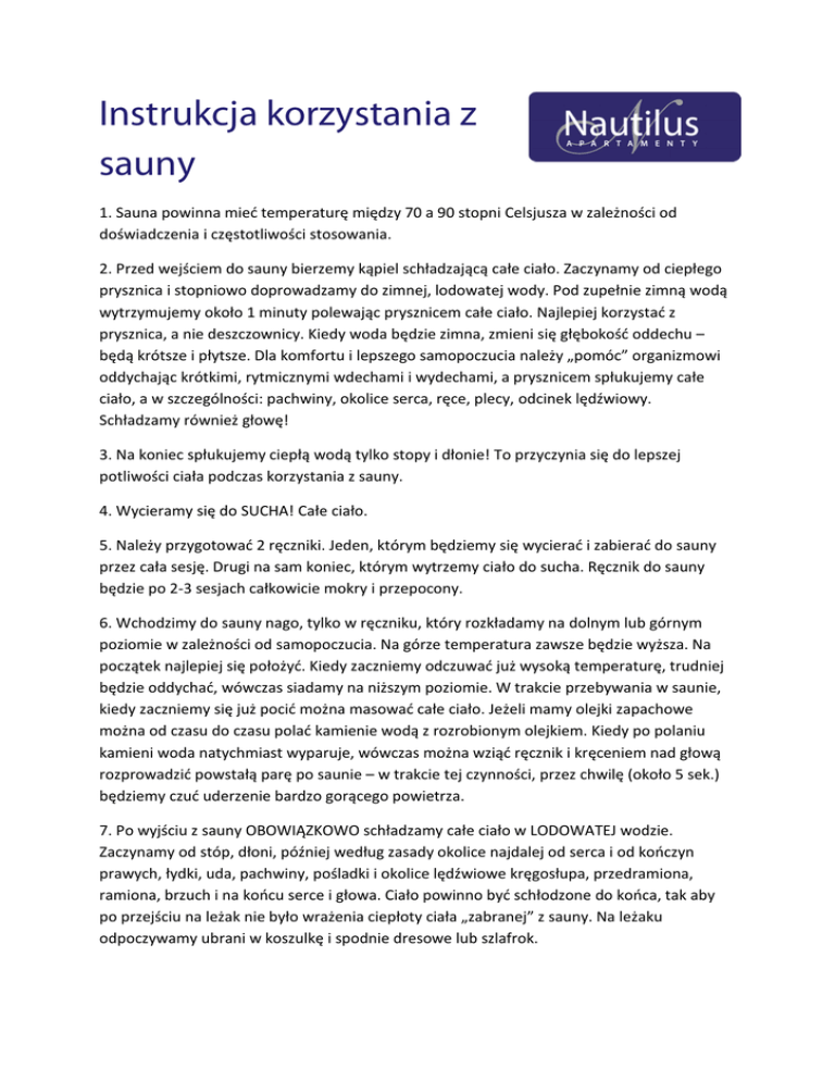 Instrukcja korzystania z sauny 1. Sauna powinna mieć temperaturę między 70 a 90 stopni Celsjusza w zależności od doświadczenia i częstotliwości stosowania. 2. Przed wejściem do sauny bierzemy kąpiel schładzającą całe ciało. Zaczynamy od ciepłego prysznica i stopniowo doprowadzamy do zimnej, lodowatej wody. Pod zupełnie zimną wodą wytrzymujemy około 1 minuty polewając prysznicem całe ciało. Najlepiej korzystać z prysznica, a nie deszczownicy. Kiedy woda będzie zimna, zmieni się głębokość oddechu – będą krótsze i płytsze. Dla komfortu i lepszego samopoczucia należy „pomóc” organizmowi oddychając krótkimi, rytmicznymi wdechami i wydechami, a prysznicem spłukujemy całe ciało, a w szczególności: pachwiny, okolice serca, ręce, plecy, odcinek lędźwiowy. Schładzamy również głowę! 3. Na koniec spłukujemy ciepłą wodą tylko stopy i dłonie! To przyczynia się do lepszej potliwości ciała podczas korzystania z sauny. 4. Wycieramy się do SUCHA! Całe ciało. 5. Należy przygotować 2 ręczniki. Jeden, którym będziemy się wycierać i zabierać do sauny przez cała sesję. Drugi na sam koniec, którym wytrzemy ciało do sucha. Ręcznik do sauny będzie po 2-3 sesjach całkowicie mokry i przepocony. 6. Wchodzimy do sauny nago, tylko w ręczniku, który rozkładamy na dolnym lub górnym poziomie w zależności od samopoczucia. Na górze temperatura zawsze będzie wyższa. Na początek najlepiej się położyć. Kiedy zaczniemy odczuwać już wysoką temperaturę, trudniej będzie oddychać, wówczas siadamy na niższym poziomie. W trakcie przebywania w saunie, kiedy zaczniemy się już pocić można masować całe ciało. Jeżeli mamy olejki zapachowe można od czasu do czasu polać kamienie wodą z rozrobionym olejkiem. Kiedy po polaniu kamieni woda natychmiast wyparuje, wówczas można wziąć ręcznik i kręceniem nad głową rozprowadzić powstałą parę po saunie – w trakcie tej czynności, przez chwilę (około 5 sek.) będziemy czuć uderzenie bardzo gorącego powietrza. 7. Po wyjściu z sauny OBOWIĄZKOWO schładzamy całe ciało w LODOWATEJ wodzie. Zaczynamy od stóp, dłoni, później według zasady okolice najdalej od serca i od kończyn prawych, łydki, uda, pachwiny, pośladki i okolice lędźwiowe kręgosłupa, przedramiona, ramiona, brzuch i na końcu serce i głowa. Ciało powinno być schłodzone do końca, tak aby po przejściu na leżak nie było wrażenia ciepłoty ciała „zabranej” z sauny. Na leżaku odpoczywamy ubrani w koszulkę i spodnie dresowe lub szlafrok. 8. Po upływnie określonego czasu odpoczynku powtarzamy czynność schładzania ciała jak na początku i wszystkie czynności przed wejściem. Każde kolejne wejście do sauny powinno przebiegać według tych samych zasad. Można stopniować czas pobytu w saunie, zaczynając w pierwszym wejściu od 5 minut, a w 3 kończąc na 15 minutach. Zawsze jednak BEZWARUNKOWO przerywamy pobyt w saunie, jeżeli czujemy, że organizm ciężko znosi wysoką temperaturę. „Nie zmuszamy” się do pobytu w saunie, bo np. założyliśmy, że przeprowadzimy dziś 3 sesje po 10 minut. 9. Najlepiej zaplanować od 2 do 3 wejść. Jedno wejście maksymalnie do 15 minut, ale w początkowej fazie, pierwszych tygodniach, a nawet miesiącach korzystania z sauny, wystarczy od 5 do 10 minut. Po wyjściu odpoczywamy na leżaku tyle, ile przebywaliśmy w saunie. W tym czasie popijamy małymi łyczkami wodę. 10. Po zakończeniu pobytu w saunie odpoczywamy na leżaku, tapczanie. Dobrze jest po zakończeniu całej sesji wypić sok pomidorowy, warzywny.