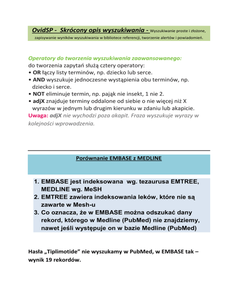 OvidSP - Skrócony opis wyszukiwania - Wyszukiwanie proste i złożone, zapisywanie wyników wyszukiwania w bibliotece referencji, tworzenie alertów i powiadomień. Operatory do tworzenia wyszukiwania zaawansowanego: do tworzenia zapytań służą cztery operatory: • OR łączy listy terminów, np. dziecko lub serce. • AND wyszukuje jednoczesne wystąpienia obu terminów, np. dziecko i serce. • NOT eliminuje termin, np. pająk nie insekt, 1 nie 2. • adjX znajduje terminy oddalone od siebie o nie więcej niż X wyrazów w jednym lub drugim kierunku w zdaniu lub akapicie. Uwaga: adjX nie wychodzi poza akapit. Fraza wyszukuje wyrazy w kolejności wprowadzenia. Porównanie EMBASE z MEDLINE 1. EMBASE jest indeksowana wg. tezaurusa EMTREE, MEDLINE wg. MeSH 2. EMTREE zawiera indeksowania leków, które nie są zawarte w Mesh-u 3. Co oznacza, że w EMBASE można odszukać dany rekord, którego w Medline (PubMed) nie znajdziemy, nawet jeśli występuje on w bazie Medline (PubMed) Hasła „Tiplimotide” nie wyszukamy w PubMed, w EMBASE tak – wynik 19 rekordów. Wybierz bazę danych, aby rozpocząć wyszukiwanie klikając nazwę bazy lub zaznaczając pola wyboru obok odpowiednich pozycji. Bazy bez pól wyboru nie mogą być przeszukiwane wraz z innymi źródłami. Uwaga!!! Po otworzeniu strony OVID, po wybraniu baz do przeszukiwania, logujemy się w My Account, co pozwoli nam zapisywać wyszukaną literaturę. Po zakończeniu pracy pamiętajmy o wylogowaniu się z naszego konta. W My Account tworzymy bibliotekę referencji i zarządzamy naszymi zbiorami. My Projects (moje projekty) jest obszarem organizacji poszukiwań, zawierającym projekty i foldery, w których można przechowywać cytaty, wyszukiwania, teksty, wyniki, pełne teksty, grafiki i wiele innych elementów. W obszarze My Projects każdy użytkownik konta My Account (jeśli jest uprawniony) ma dostęp do 50 MB na przechowywanie elementów zewnętrznych OvidSP. My Projects ma te same opcje wyjściowe, co wyniki wyszukiwania (drukowanie, e-mail i eksport) oraz opcję Remove (usuń), służącą do usuwania zapisanych elementów w razie potrzeby. History (historia wyszukiwania) W oknie Search History (historia wyszukiwania) wyświetlana jest lista wszystkich wyszukiwań, wyników oraz typów wyszukiwania. Połącz wyrażenia wyszukiwania, klikając pola wyboru i wybierając operatory AND i OR w trybie Advanced Search (wyszukiwanie zaawansowane), bądź też wpisując numery wyrażeń i operatory w polu wyszukiwania (np. 1 not 2). Usuń wyszukiwania, używając pól wyboru i przycisku Remove Selected (usuń zaznaczone). Doprecyzuj wyniki lub dodaj do swojego wyszukiwania za pomocą Results Tools (narzędzi wyników) po lewej stronie wyświetlonych wyników wyszukiwania. Search Results (wyniki wyszukiwania) Aby wyświetlić wyniki ostatniego wyszukiwania, przewiń stronę w dół lub wybierz opcję Display (wyświetl), aby przejrzeć dowolne wynik wyszukiwania. • Wyniki są wyświetlane w widoku cytatu, zawierającym informacje o autorze, tytule i źródle. • Menu View (widok) zmienia widok na Title (tytuł) lub Abstract (abstrakt). • Jeśli cytat zawiera abstrakt, to dostępne jest łącze View Abstract (wyświetl abstrakt) do przeglądania abstraktu. Dodawanie elementów do My Projects bezpośrednio z sesji wyszukiwania: Dodawaj materiały do My Projects, przeciągając je do My Projects w oknie Results Tools lub klikając przycisk Add to My Projects i postępując według wyświetlanych monitów. My Projects (moje projekty) jest zorganizowanym obszarem przechowywania, zawierającym projekty i foldery, w których można przechowywać teksty, wyniki, cytaty, pełne teksty, grafiki itp. My Projects ma te same opcje wyjściowe, co wyniki (drukowanie, e-mail i eksport) oraz opcję Remove (usuń), służącą do usuwania zapisanych elementów. • Zaznacz elementy używając pól wyboru. • Naciśnij przycisk Add to My Projects u góry każdej strony. • Postępuj zgodnie z wyświetlanymi monitami. Trzeba utworzyć projekt albo wybrać istniejący projekt lub folder. • Można też przeciągnąć wyniki do sekcji My Projects z okna Result Tools (narzędzia wyników), która znajduje się po lewej stronie strony wyników lub dodawać pojedyncze artykuły używając przycisków znajdujących się przy każdym rekordzie po prawej stronie opisu, jak wyżej. Dodawanie ręcznego cytatu w My Projrcts • Użyj przycisku Actions (czynności) i wybierz polecenie Create Citation (utwórz cytat). • Wybierz typ cytatu. • Wprowadź szczegóły. • Zapisz cytat (opcje zależą od wybranego typu). Status projektu Projekty mogą być aktywne (dostępne w obszarze Manage Projects), archiwalne (zapisane) lub znajdować się w koszu (Trash). Projekty i foldery można przeciągać pomiędzy tymi trzema obszarami. Wyszukiwanie i sortowanie • Wyszukiwanie może obejmować wszystkie projekty lub obecnie wybrane u góry strony. Wyniki w projekcie mogą być uporządkowane według nazwy, tytułu, typu, rozmiaru pliku lub daty. Opcje wyjściowe My Projects • Użyj ikon wyjścia obszaru My Projects, aby wyprowadzić lub usunąć elementy z wnętrza projektu. Uwaga: Można wyprowadzać tylko z obecnie licencjonowanych lub subskrybowanych zasobów. Uwaga: Projekty są utrzymywane przez rok od daty utworzenia. Aby odnowić projekt na kolejny rok, wystarczy użyć przycisku Renew (odnów). Uwaga!!! Użyj zakładki Find Citation aby szybko odszukać określony artykuł. Nie musimy znać danych do wszystkich pól na ekranie, wystarczy np. tytuł artykułu lub kilka danych, które znamy, wpisujemy w odpowiednie pola i klikamy Search. Łącza do materiałów szkoleniowych i opcji językowych są dostępne na dole każdej strony. Więcej informacji o produktach Ovid można znaleźć pod adresem http://www.ovid.com; Materiały szkoleniowe i dokumentacja znajdują się pod adresem http://resourcecenter.ovidsp.com Biblioteka Naukowa Bogumiła Dydek te