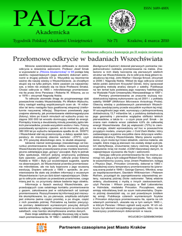 PAUza ISSN 1689-488X Akademicka Tygodnik Polskiej Akademii Umiejętności Nr 71 Kraków, 4 marca 2010 Przełomowe odkrycia i koncepcje po II wojnie światowej Przełomowe odkrycie w badaniach Wszechświata Minione sześćdziesięciolecie obfitowało w doniosłe odkrycia w dziedzinie astronomii. Profesor Józef Smak w wypowiedzi w „PAUzie Akademickiej” nr 65 podaje listę siedmiu najważniejszych (jego zdaniem) dokonań astronomii w drugiej połowie XX w. Wszystkie są niezmiernie ważne dla naszej wiedzy o Wszechświecie. Ja chciałbym skupić się na tylko jednym, które uważam za najważniejsze, a które nie znalazło się na liście Profesora Smaka. Chodzi odkrycie w 1965 r. mikrofalowego promieniowania tła przez Arno Penziasa i Roberta W. Wilsona, za co w 1978 r. otrzymali Nagrodę Nobla. To odkrycie utorowało drogę do przyjmowanego dziś powszechnie modelu Wszechświata. Po Wielkim Wybuchu, który nastąpił według współczesnych ocen ok. 14 miliardów lat temu nastąpiła faza gwałtownej ekspansji (niefortunnie nazywanej inflacją). Stopniowo powstawały jego znajome elementy, jak promieniowanie elektromagnetyczne (fotony), które po trzech minutach od wybuchu przez następne 300 000 lat wnosiło dominujący wkład do energii. Pomiędzy trzecią a dwudziestą minutą powstały jądra lekkich pierwiastków, przede wszystkim wodoru i helu. Fotony pozostawały sprzężone z gazem, aż do momentu, gdy ok. 380 000 lat po wybuchu temperatura spadła do ok. 3000ºC i Wszechświat stał się przezroczysty, a dalszy spadek temperatury do mierzonej obecnie wartości –270ºC, czyli ok. 3ºC powyżej absolutnego zera, to skutek ekspansji. Istnienie niemal izotropowego (niezależnego od kierunku) promieniowania tła jako reliktu wczesnej ewolucji Wszechświata było przewidywane przez modele kosmologiczne zakładające jego „gorący” początek. Były to jednak tylko spekulacje, których jedyną empiryczną podstawą było zjawisko „ucieczki galaktyk”, odkryte przez Edwina Hubbla w 1929 r. Były już wcześniejsze sugestie, oparte na obserwacjach, że Wszechświat przenika promieniowanie mikrofalowe, ale nie były kojarzone z jego wczesną ewolucją. Dopiero odkrycie z 1965 r. sprawiło, że promieniowanie tła stało się źródłem informacji o wczesnym Wszechświecie i tym po dziś dzień najważniejszym. Dlatego to odkrycie uważam za prawdziwie przełomowe, czego miarą jest to, co przyniosły dalsze badania tego obiektu. Informacja o fazach ewolucji Wszechświata, poprzedzających czas ostatniego kontaktu promieniowania z gazem, zakodowana jest w odchyleniach od izotropii promieniowania. Rozszyfrowane tej informacji jest niezwykle skomplikowane, bo, po pierwsze, amplituda odchyleń jest znikoma (setne części promila), a po drugie, część z nich powstała później. Potrzebne są bardzo precyzyjne pomiary detektorami wyniesionymi powyżej dolnych warstw atmosfery, najlepiej umieszczanymi na sztucznych satelitach, oraz bardzo skomplikowana analiza danych. Dwie misje satelitarne odegrały kluczową rolę w badaniach promieniowania tła. W 1992 r. satelita COBE (Cosmic Background Explorer) dokonał pierwszych pomiarów niejednorodności rozkładu promieniowania na niebie. Znaleziono w nich ślady tworzenia się pierwszych wielkich struktur we Wszechświecie. Za to odkrycie dwaj główni realizatorzy tej misji, John Mather i George Smoot, otrzymali w 2006 r. Nagrodę Nobla. Wkład do tego odkrycia wniósł także polski astronom Krzysztof Górski, który opracował oryginalną metodę analizy danych z satelity. Publikacja na ten temat była podstawą jego rozprawy habilitacyjnej na Wydziale Fizyki Uniwersytetu Warszawskiego w 1997 r. Pomiary promieniowania ze znacznie wyższą rozdzielczością kątową wykonywane są od 2001 r. z pokładu satelity WAMP (Wilkinson Microwave Anisotropy Probe). Obecną wiedzę o podstawowych parametrach Wszechświata zawdzięczamy przede wszystkim wynikom tej misji. W szczególności jego wiek, wynoszący z jednoprocentową dokładnością 13,7 miliardów lat, z podobną dokładnością jego geometrię i pierwotne względne obfitości lekkich pierwiastków, a także to – o czym pisze prof. Smak – że znana nam materia wnosi zaledwie 4,6% do całkowitej energii Wszechświata. Zaś jej większość (72%) to ciemna energia, obiekt wprowadzony ad hoc w powszechnie przyjętym modelu, znanym jako Λ Cold Dark Matter, który zadawalająco wyjaśnia wszystkie dane dotyczące wielkoskalowej struktury Wszechświata. Mamy pewne wyobrażenie, czym może być trzeci składnik, ciemna materia, ale cząstki, które mają ją stanowić nie zostały dotąd wykryte. Ich identyfikacja, zrozumienie natury ciemnej energii lub znalezienie innej niż model ΛCDM interpretacji danych, to najważniejsze wyzwania dla fizyki i astronomii. Opisując odkrycie promieniowania tła nie można pominąć roli, jaką w tym odegrał Robert Dicke. Ten, niebywale wszechstronny uczony, wraz Jimem Peables’em, kolegą z Physics Dept., Princeton University, dokonał w 1960 r. niezależnej oceny temperatury promieniowania tła (pierwszą ocenę podał w 1946 r. George Gamov). Wkrótce, wraz ze współpracownikami, Davidem Wilkinson’em i Peterem Roll’em, przystąpił do zaprojektowania odpowiedniej anteny, nazwanej później Dicke radiometer. Takiej właśnie anteny, zbudowanej z myślą o innych zastosowaniach, użyli Penzias i Wilson pracujący w Bell Laboratories w Holmdale, niedaleko Princeton. Początkowo, stałą emisję mikrofalową brali za szum instrumentalny. Dopiero później dowiedzieli się, co jest prawdziwym źródłem tej emisji. Publikacja czterech wymienionych fizyków z Princeton dotycząca promieniowaniu tła, oparta na ich własnych pomiarach, ukazała się w tym samym 1965 r., w którym Penzias i Wilson ogłosili swój wynik. W ich odkryciu był element szczęśliwego przypadku, który nie raz towarzyszy przełomowym dokonaniom w nauce. WOJCIECH DZIE