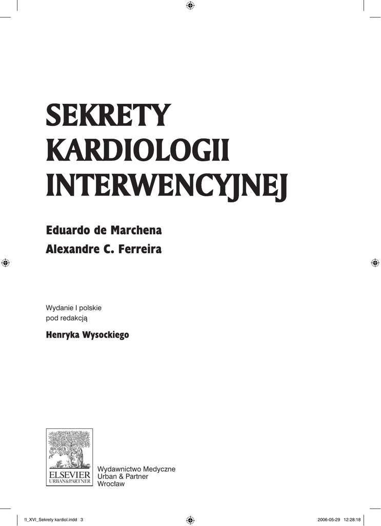 SEKRETY KARDIOLOGII INTERWENCYJNEJ Eduardo de Marchena Alexandre C. Ferreira Wydanie I polskie pod redakcją Henryka Wysockiego Wydawnictwo Medyczne Urban & Partner Wrocław !I_XVI_Sekrety kardiol.indd 3 2006-05-29 12:28:18 SPIS TREŚCI I. CEWNIKOWANIE SERCA 1. Pracownia hemodynamiczna: wyposażenie i personel ................................................... Glenn Barquet, Stephen Mallon 1 2. Promieniowanie i bezpieczeństwo ................................................................................... Glenn Barquet, Stephen Mallon 6 3. Angiografia diagnostyczna ................................................................................................ Niranjan Seshadri, Deepak L. Bhatt 10 4. Wsparcie hemodynamiczne: wewnątrzaortalna pompa balonowa i krążenie zewnątrzustrojowe ........................................................................................... Hooshang Bolooki, Michael Bolooki 16 II. CHOROBY NACZYŃ WIEŃCOWYCH 5. Fizjologia przepływu krwi przez naczynia wieńcowe ...................................................... Morton J. Kern 21 6. Czynność śródbłonka ......................................................................................................... Juan Pablo Zambrano, Alexandre C. Ferreira 36 7. Stopień zaawansowania zmian miażdżycowych naczyń wieńcowych ............................ Juan Pablo Zambrano, Eduardo de Marchena 41 8. Płytki, krzepnięcie i zakrzepica ........................................................................................ Wenche Jy, Joaquin J. Jimenez, Lawrence L. Horstman, Yeon S. Ahn 44 9. Czynniki ryzyka i prewencja ............................................................................................. Maria P. Solano, Ronald B. Goldberg 54 10. Epidemiologia i nieinwazyjna ocena choroby wieńcowej .............................................. Vivek J. Goswami, Robert A. O’Rourke 61 11. Klasyfikacja zmian wieńcowych ........................................................................................ Neerav Shah, Eduardo de Marchena 68 III. FARMAKOTERAPIA 12. Heparyna i inhibitory trombiny ........................................................................................ Sameer Mehta, Samir Yebara, Martha Reyes 73 13. Aspiryna i tienopirydyny ................................................................................................... Maria Isabel López 79 14. Inhibitory receptora glikoproteiny IIB/IIIA ................................................................... Marco Roffi, Debabrata Mukherjee 90 15. Reakcje na radiologiczne środki kontrastowe oraz znieczulenie z zachowaniem świadomości pacjenta ........................................................................................................ Christian Fierro-Renoy 16. Leki rozszerzające naczynia wieńcowe oraz wazoaktywne ............................................ Jeffrey Scott Fenster, Mauricio Velez !I_XVI_Sekrety kardiol.indd 5 94 98 2006-05-29 12:28:18 Spis treści VI IV. PRZYRZĄDY STOSOWANE W PRZEZSKÓRNYCH INTERWENCJACH NA NACZYNIACH WIEŃCOWYCH 17. Wybór angioplastycznego cewnika prowadzącego, balonu i lidera angioplastycznego oraz techniki zabiegu ......................................................................... 105 Craig A. Thompson, Igor F. Palacios 18. Stenty wieńcowe ................................................................................................................. 109 Nilesh J. Goswami, Steven R. Bailey 19. Rotablacja i wieńcowa aterektomia kierunkowa ............................................................ 114 Alan Schob, Oscar C. Muñoz 20. Narzędzia używane do trombektomii i narzędzia laserowe ........................................... 121 On Topaz 21. Urządzenia zabezpieczające przed zatorowością obwodową ........................................ 129 Fernando A. Cura 22. Ultrasonografia wewnątrznaczyniowa ............................................................................. 137 Samir R. Kapadia 23. Cewniki zaopatrzone w czujniki ciśnienia i do pomiarów dopplerowskich ................. 144 Morton J. Kern 24. Urządzenia służące do zamknięcia miejsca nakłucia tętnicy ......................................... 156 Oscar C. Muñoz, Javier Jimenez V. PRZEZSKÓRNE INTERWENCJE W OBRĘBIE TĘTNIC WIEŃCOWYCH: WSKAZANIA I ZASTOSOWANIA 25. Interwencje wieńcowe w dusznicy bolesnej stabilnej ..................................................... 161 Neil Sawhney, Barry Sharaf 26. Angioplastyka wieńcowa w niestabilnej dusznicy bolesnej ............................................ 168 Cesar Jara, Eduardo de Marchena 27. Pierwotna angioplastyka i tromboliza w ostrym zawale mięśnia sercowego z uniesieniem odcinka ST ................................................................................................. 176 Luis E. Rechani, Rafael F. Sequeira 28. Wielonaczyniowa angioplastyka wieńcowa ..................................................................... 181 Ravish Sachar, Deepak L. Bhatt 29. Angioplastyka wieńcowa przed operacją niekardiologiczną ......................................... 193 Neerav Shah, Eduardo de Marchena VI. ZŁOŻONE INTERWENCJE WIEŃCOWE 30. Zmiany z obecnością zwapnień oraz zmiany zlokalizowane w ujściu tętnicy wieńcowej ........................................................................................................................... 197 Glenn Barquet, Alexandre C. Ferreira 31. Zmiany zlokalizowane na rozdwojeniu naczyń oraz w naczyniach krętych ................. 202 Glenn Barquet, Eduardo de Marchena 32. Przewlekła niedrożność naczynia wieńcowego ............................................................... 209 Alan Schob, Eric Auerbach !I_XVI_Sekrety kardiol.indd 6 2006-05-29 12:28:18 Spis treści VII 33. Interwencje w obrębie długich zmian oraz w tętnicach małego kalibru ....................... 214 Mustafa Ridha, Eduardo de Marchena 34. Interwencje w obrębie pomostów z