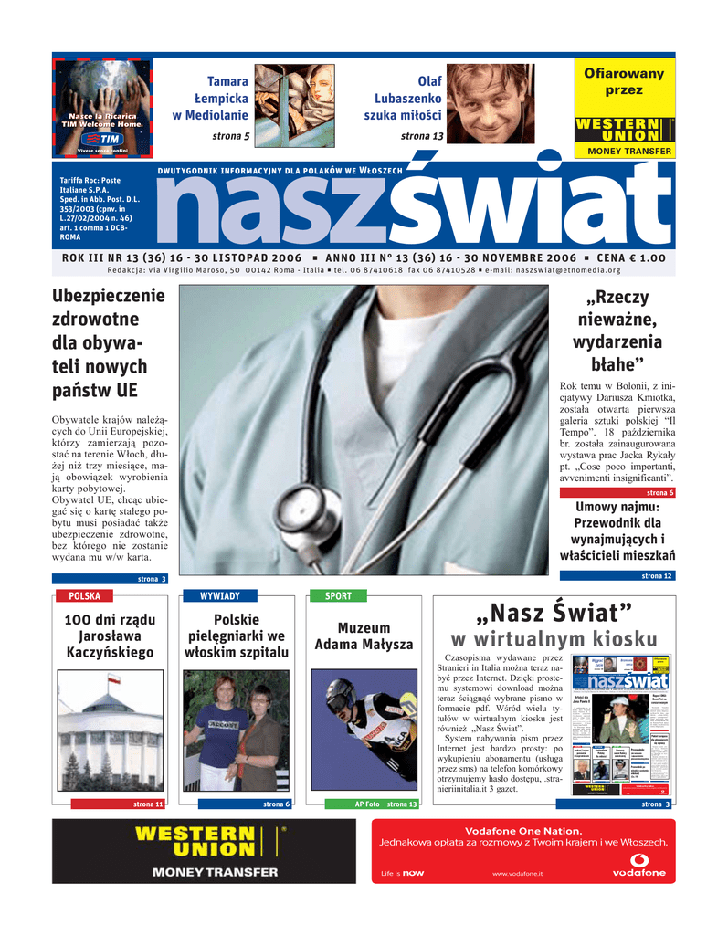 Tamara Łempicka w Mediolanie Olaf Lubaszenko szuka miłości strona 5 strona 13 Ofiarowany przez naszświat dwutygodnik informacyjny dla polaków we Włoszech Tariffa Roc: Poste Italiane S.P.A. Sped. in Abb. Post. D.L. 353/2003 (cpnv. in L.27/02/2004 n. 46) art. 1 comma 1 DCBROMA ROK III NR 13 ( 36) 16 - 30 LISTOPAD 2006 ▪ ANNO III N° 13 ( 36) 16 - 30 NOVEMBRE 2006 ▪ CENA € 1.00 Redakcja: v ia Virg ilio Maroso, 50 00142 Roma - Italia ▪ tel. 06 87410618 fax 06 87410528 ▪ e -mail: naszsw [email protected] Ubezpieczenie „Rzeczy nieważne, wydarzenia błahe” zdrowotne dla obywateli nowych państw UE Rok temu w Bolonii, z inicjatywy Dariusza Kmiotka, została otwarta pierwsza galeria sztuki polskiej “Il Tempo”. 18 października br. została zainaugurowana wystawa prac Jacka Rykały pt. „Cose poco importanti, avvenimenti insignificanti”. Obywatele krajów należących do Unii Europejskiej, którzy zamierzają pozostać na terenie Włoch, dłużej niż trzy miesiące, mają obowiązek wyrobienia karty pobytowej. Obywatel UE, chcąc ubiegać się o kartę stałego pobytu musi posiadać także ubezpieczenie zdrowotne, bez którego nie zostanie wydana mu w/w karta. strona 6 Umowy najmu: Przewodnik dla wynajmujących i właścicieli mieszkań strona 12 strona 3 WYWIADY 100 dni rządu Jarosława Kaczyńskiego strona 11 SPORT Polskie pielęgniarki we włoskim szpitalu strona 6 Muzeum Adama Małysza „Nasz Świat” w wirtualnym kiosku Czasopisma wydawane przez Stranieri in Italia można teraz nabyć przez Internet. Dzięki prostemu systemowi download można teraz ściągnąć wybrane pismo w formacie pdf. Wśród wielu tytułów w wirtualnym kiosku jest również „Nasz Świat”. System nabywania pism przez Internet jest bardzo prosty: po wykupieniu abonamentu (usługa przez sms) na telefon komórkowy otrzymujemy hasło dostępu, .stranieriinitalia.it 3 gazet. AP Foto strona 13 Wygrać życie Brzmienie serca strona 18 strona 18 naszświat DWUTYGODNIK INFORMACYJNY DLA POLAKÓW WE Tariffa Roc: Poste Italiane S.P.A. Sped. in Abb. Post. D.L. 353/2003 (cpnv. in L.27/02/2004 n. 46) art. 1 comma 1 DCB-ROMA Ofiarowany przez WŁOSZECH ROK III NR 12 (35) 01-15 LISTOPAD 2006 ANNO III N° 12 (35) 01-15 NOVEMBRE 2006 CENA 1.00 EURO Re d a kc ja : v i a Vi r g i l io M a r o s o, 50 0 0142 Ro m a - It a l i a t el. 0 6 87410 618 f a x 0 6 87410528 e - m a i l: n a s z s w i a t @ e t n o m e d i a .o r g Raport ONU: Bossi-Fini na cenzurowanym Artyści dla Jana Pawła II 22 października br., w hołdzie Ojcu Świętemu Janowi Pawłowi II, w rzymskim audytorium Conciliazione zaśpiewali artyści z całego świata. Koncert był częścią jubileuszowych uroczystości 25-lecia Fundacji Jana Pawła II. Do Wiecznego Miasta przyjechała także Natalia Kukulska. Nie był to jej pierwszy występ we Włoszech. Miała dwukrotnie okazję zaśpiewać dla Karola Wojtyły. Wysłannik Narodów Zjednoczonych ostro skrytykował ustawę imigracyjną Bossi-Fini, która - jego daniem – „sprzyja dyskryminacji i przestępczości”. Diene pozytywnie natomiast ocenił działania rządu Romano Prodi dążące do zmiany dotychczasowej ustawy imigracyjnej. foto: Dziennik Bałtycki POLSKA strona 3 Pakiet Europass dla ubiegających się o pracę strona 7 POLSKA Andrzej Lepper ponownie wicepremierem SPORT HISTORIE Zostawiłam Polskę dla miłości Pierwszy sezon Kubicy zakończony Przewodnik: Jak świadomie i odpowiedzialnie planować macierzyństwo strona 20 Przewodnik po włoskim systemie edukacji (Cz. IV) AP Foto strona 15 strona 9 AP Foto strona 19 strona 21 Europass został przyjęty decyzją Parlamentu Europejskiego i Rady Europy 15 grudnia 2004 roku i obowiązuje od 1stycznia 2005 roku. Bezpłatne formularze dokumentów pakietu Europass wraz z instrukcjami ich wypełniania można ściągnąć ze stron portalu Europass: www.europass.europa.eu. Dokumenty opracowane są we wszystkich językach Unii Europejskiej. Tylko do września tego roku dokument Europass - CV pobrało 430 tys. osób w tym 21 tys. w języku polskim. strona 2 Vodafone One Nation. Jednakowa opłata za rozmowy z Twoim krajem i we Włoszech. Life is www.vodafone.it strona 3 Vodafone One Nation. Jednakowa opłata za rozmowy z Twoim krajem i we Włoszech. Life is www.vodafone.it 2 naszświat ŻYĆ WE WŁOSZECH Czas pracy w UE Posiedzenie Rady Unii Europejskiej, które odbyło się na początku listopada, poświęcone dyrektywie w sprawie czasu pracy zakończyło się fiaskiem. Chodziło o utrzymanie tzw. klauzuli opt-out, czyli możliwości świadczenia pracy powyżej 48 godzin przeciętnie w tygodniu za zgodą pracownika. Strona Polska opowiadała się za utrzymaniem tej klauzuli, jednak jej przeciwnicy stanowili większość. Czy klauzula opt-out jest konieczna dla poprawy poziomu społecznego rozwoju? Prostej odpowiedzi nie ma, ale warto zobaczyć ile godzin w ciągu roku pracują ludzie w różnych krajach. Wygląda to tak: 1) Korea Płd. - 2.390, 2) Polska 1956, 3) Meksyk - 1857, 4) Australia - 1814, 5) Japonia - 1801, 6) USA 1792, 7) Finlandia -1713, 8) Wielka Brytania - 1673, 9) Włochy - 1591, 10) Belgia - 1542, 11) Niemcy - 1446, 12) Francja - 1431, 13) Norwegia - 1337. (za “Metropol” 08.11.2006) I.W. Nr 13 16 – 30 listopad 2006 Rośnie liczba przedsiębiorców Jak wynika z danych opublikowanych przez włoską Izbę Handlową w Mediolanie i okolicach ponad 18 tysięcy przedsiębiorców to obywatele krajów spoza UE, co stanowi 11,7% wszystkich właścicieli prywatnych firm Ze statystyki Izby Handlowej wynika, że 30,8 % firm prowadzonych przez cudzoziemców zajmuje się handlem, 11,5% oferuje różnego rodzaju usługi od transportowych po medialne, a 3,1% działa w sektorze hotelarsko-restauracyjnym. Wśród przedsiębiorców-cudzoziemców w Mediolanie najliczniejszą grupę stanowią Egipcjanie (19,2%), Chińczycy (13,1%), Marokańczycy (8,3%) i Rumuni (5,9%). 8 z 10 właścicieli firm to mężczyźni. Z myślą o nowych przedsi