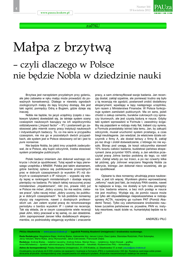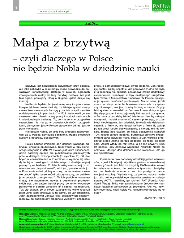 Numer 164 19 kwietnia 2012 4 www.pauza.krakow.pl zaPAU Małpa z brzytwą – czyli dlaczego w Polsce nie będzie Nobla w dziedzinie nauki Brzytwa jest narzędziem przydatnym przy goleniu, ale jako zabawka w ręku małpy może prowadzić do poważnych konsekwencji. Dlatego w niewielu ogrodach zoologicznych małpy do łapy brzytwy dostają. Ale jest taki ogród, pomiędzy Odrą a Bugiem, gdzie dzieje się inaczej. Nobla nie będzie, bo jacyś urzędnicy (często z nau kowym tytułem) dowiedzieli się, że istnieje system oceny czasopism naukowych bazujący na ich współczynniku oddziaływania („Impact factor” – IF) i postanowili go zastosować jako miernik oceny pracy instytucji naukowych i indywidualnych badaczy. To, co ma sens w przypadku czasopism, nie ma go w pozostałych dwóch przypadkach, ale system jest w Polsce stosowany od lat i jest to pure nonsense. Nie będzie Nobla, bo jakiś inny urzędnik zadecydował, że w Polsce, aby kupić odczynnik, trzeba stosować system przetargów publicznych. Polski badacz imieniem Jan dokonał ważnego odkrycia i chciał je opublikować. Tutaj wpadł w łapy pierwszego urzędnika z MNiSW. Polska jest takim skansenem, gdzie bardziej opłaca się publikowanie przeciętnych prac w dobrych czasopismach (o wysokim IF) niż dobrych w czasopismach o IF niższym – wypada się wtedy lepiej w rankingach ministerialnych i dostaje więcej pieniędzy na badania. Po latach takiej narzuconej przez ministerstwo „impaktomanii”, nikt (no, prawie nikt) już w Polsce nie mówi: „dobry uczony, bo ma ważne, ciekawe prace”, tylko raczej mówi: „dobry uczony, bo publikuje w dobrych czasopismach”. Te lub podobne nonsensy słyszy się nagminnie, nawet z dostojnych profesorskich ust. Jan zatem wysłał pracę do renomowanego periodyku o bardzo wysokim IF i czekał na recenzje. Tak się składa, że w owym czasopiśmie wiele recenzji pisał John, który pracował w tej samej, co Jan dziedzinie. John zaproponował Janowi kilka dodatkowych eksperymentów, co podniosłoby elegancję wyników i znaczenie pracy, a sam zintensyfikował swoje badania. Jan recenzję dostał, zaklął szpetnie, ale ponieważ trudno się było z tą recenzją nie zgodzić, postanowił zrobić dodatkowy eksperyment, wpadając w łapy następnego urzędnika, tym razem z Ministerstwa Finansów. W Polsce funkcjonuje system zamówień publicznych. Ma on sens, jeżeli chodzi o zakup cementu, buraków cukrowych czy spinaczy biurowych, ale jest czystą bzdurą w nauce. Gdyby taki system wprowadzić w Formule I, zawodnicy ścigaliby się pojazdami w rodzaju mały fiat, trabant czy syrena, a Formuła przestałaby istnieć lata temu. Jan, by zakupić odczynnik, musiał uruchomić system przetargu, a czas biegł nieubłaganie. Jan wiedział, że właściwie działa odczynnik z firmy A, ale dostał tańszy z firmy B, zaklął po raz drugi i zrobił doświadczenie, z którego nic nie wyszło. Biorąc pod uwagę, że koszt odczynnika stanowił 10% kosztu całości badania, budżetowi państwa eksperyment Jana przyniósł 100% straty, a Jan wkrótce przeczytał pracę Johna bardzo podobną do tego, co robił sam. Zaklął wtedy po raz trzeci, a po raz czwarty kilka lat później, gdy Johnowi wręczano Nagrodę Nobla za odkrycie, którego Jan dokonał nieco wcześniej, ale go nie opublikował. Opisane tu dwa nonsensy utrudniają prace naukowców, a jest ich więcej. Wynikiem głośno wprowadzanej „reformy” nauki jest fakt, że instytuty PAN-owskie, nawet te najlepsze w kraju, nie dostały w tym roku pieniędzy na tzw. badania własne, a bez nich postęp w nauce nie jest możliwy. Wydaje się, że pomóc nauce może już tylko akt obywatelskiego nieposłuszeństwa w rodzaju sprawy ACTA, nazwijmy go ruchem PAT (Pomóż Akademii Teraz). Tylko czy zatomizowane środowisko nau kowe (uczelnie państwowe vs. prywatne, PAN vs. instytuty resortowe, nauki ścisłe vs. humanistyka) będzie na to stać? Andrzej Pilc PAUza Akademicka – www.pauza.krakow.pl – tygodnik Polskiej Akademii Umiejętności i środowiska naukowego. Rada Redakcyjna: Magdalena Bajer, Andrzej Białas, Aleksander Koj, Janusz Limon, Ewa Lipska, Stanisław Rodziński, Piotr Sztompka, Jerzy Vetulani, Marta Wyka, Jerzy Wyrozumski, Jakub Zakrzewski, Franciszek Ziejka. Redakcja: Andrzej Białas – redaktor naczelny; Andrzej Kobos, Marian Nowy – redaktorzy; Adam Korpak – grafika; Anna Michalewicz – dyrektor administracyjny; Witold Brzoskowski – fotoskład; Wydawnictwo PAU – konsultacje. Adres do korespondencji: Polska Akademia Umiejętności, 31–016 Kraków, ul. Sławkowska 17; e-mail: [email protected] Oczekujemy na artykuły do 6 000 znaków (ze spacjami) i ilustracje w formacie JPEG o rozdzielczości 300 dpi. Redakcja zastrzega sobie prawo skracania artykułów i korespondencji oraz zaopatrywania ich własnymi tytułami. Artykułów niezamówionych redakcja nie zwraca.