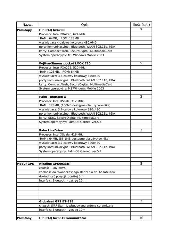 Nazwa Palmtopy Moduł GPS Palmfony Opis Ilość (szt.) HP iPAQ hx4700 Procesor: Intel PXA270, 624 MHz RAM : 64MB, ROM: 128MB wyświetlacz 4-calowy kolorowy 480x640 porty komunikacyjne : Bluetooth, WLAN 802.11b, IrDA karty: CompactFlash, SecureDigital, MultimediaCard System operacyjny: MS Windows Mobile 2003 7 Fujitsu-Simens pocket LOOX 720 Procesor: Intel PXA272, 520 MHz RAM : 128MB, ROM: 64MB wyświetlacz: 3.6-calowy kolorowy 640x480 porty komunikacyjne : Bluetooth, WLAN 802.11b, IrDA karty: CompactFlash, SecureDigital, MultimediaCard System operacyjny: MS Windows Mobile 2003 5 Palm Tungsten X Procesor: Intel XScale, 312 MHz RAM : 128MB, (100MB dostępne dla użytkownika) wyświetlacz: 3.7-calowy kolorowy 320x480 porty komunikacyjne : Bluetooth, WLAN 802.11b, IrDA karty: SDIO, SecureDigital, MultimediaCard System operacyjny: Palm OS Garnet ver.5.4 3 Palm LiveDrive Procesor: Intel XScale, 416 MHz RAM : 64MB, (55.1MB dostępne dla użytkownika), wyświetlacz: 3.7-calowy kolorowy 320x480 porty komunikacyjne : Bluetooth, WLAN 802.11b, IrDA System operacyjny: Palm OS Garnet ver.5.4 3 Rikaline GPS6033BT czułość: -187 dBW, zdolność do równoczesnego śledzenia do 32 satelitów dokładność pozycji: poniżej 5m interfejs: Bluetooth - zasięg 10m 8 Globalsat GPS BT-338 chipset: SiRF Star III, wbudowana antena ceramiczna interfejs: Bluetooth - zasięg 10m 2 HP iPAQ hw6515 komunikator 10 Procesor: Intel PXA270, 312 MHz RAM : 64MB, ROM: 64MB wyświetlacz: 3.0-calowy kolorowy 240x240 porty komunikacyjne : Bluetooth, IrDA, USB karty: SecureDigital, MultimediaCard aparat cyfrowy 1.3 MP, dyktafon, GPS, telefon GSM System operacyjny: MS Windows Mobile 2003 SE Nokia 9300i Smartfon EGSM 900, GSM 1800/1900 automatyczna zmiana zakresu Pamięć: do 80MB wewnętrznej pamięci na dane wyświetlacz zewnętrzny : 128x128, wewnętrzny 640x200 Lączność: WLAN 802.11g, Bluetooth, IrDA 2 Nokia 9500 Communicator EGSM 900, GSM 1800/1900 automatyczna zmiana zakresu Pamięć: do 80MB wewnętrznej pamięci na dane wyświetlacz zewnętrzny : 128x128, wewnętrzny 640x200 Lączność: WLAN 802.11g, Bluetooth, IrDA 2