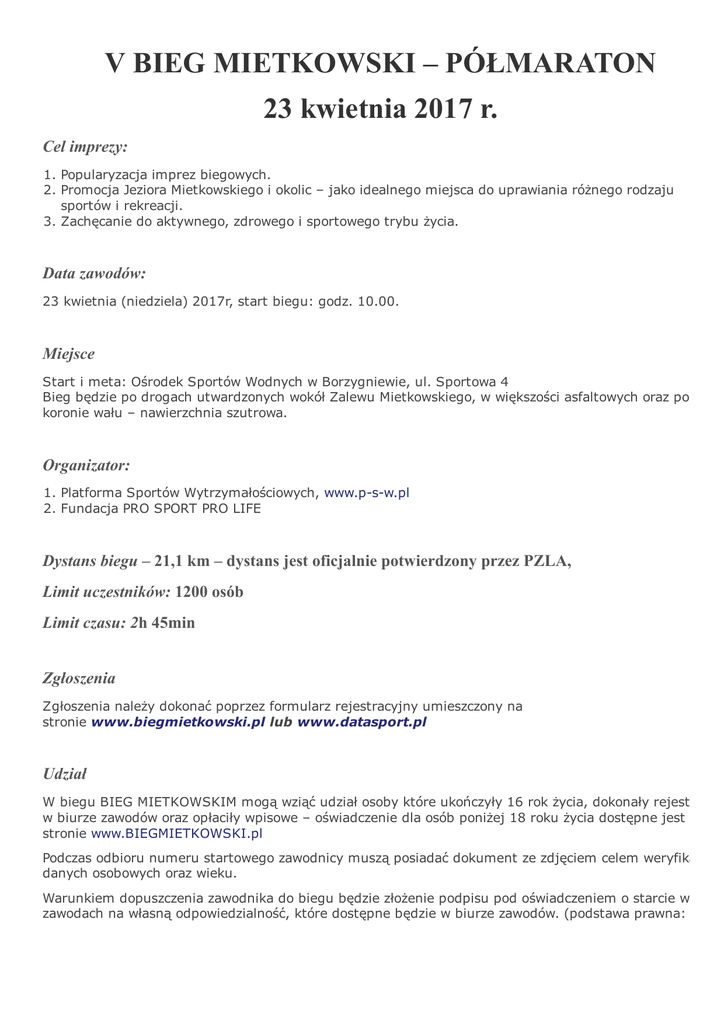 V BIEG MIETKOWSKI – PÓŁMARATON 23 kwietnia 2017 r. Cel imprezy: 1. Popularyzacja imprez biegowych. 2. Promocja Jeziora Mietkowskiego i okolic – jako idealnego miejsca do uprawiania różnego rodzaju sportów i rekreacji. 3. Zachęcanie do aktywnego, zdrowego i sportowego trybu życia. Data zawodów: 23 kwietnia (niedziela) 2017r, start biegu: godz. 10.00. Miejsce Start i meta: Ośrodek Sportów Wodnych w Borzygniewie, ul. Sportowa 4 Bieg będzie po drogach utwardzonych wokół Zalewu Mietkowskiego, w większości asfaltowych oraz po koronie wału – nawierzchnia szutrowa. Organizator: 1. Platforma Sportów Wytrzymałościowych, www.psw.pl 2. Fundacja PRO SPORT PRO LIFE Dystans biegu – 21,1 km – dystans jest oficjalnie potwierdzony przez PZLA, Limit uczestników: 1200 osób Limit czasu: 2h 45min Zgłoszenia Zgłoszenia należy dokonać poprzez formularz rejestracyjny umieszczony na stronie www.biegmietkowski.pl lub www.datasport.pl Udział W biegu BIEG MIETKOWSKIM mogą wziąć udział osoby które ukończyły 16 rok życia, dokonały rejestracji w biurze zawodów oraz opłaciły wpisowe – oświadczenie dla osób poniżej 18 roku życia dostępne jest na stronie www.BIEGMIETKOWSKI.pl Podczas odbioru numeru startowego zawodnicy muszą posiadać dokument ze zdjęciem celem weryfikacji danych osobowych oraz wieku. Warunkiem dopuszczenia zawodnika do biegu będzie złożenie podpisu pod oświadczeniem o starcie w zawodach na własną odpowiedzialność, które dostępne będzie w biurze zawodów. (podstawa prawna: Rozporządzenie Ministra Edukacji Narodowej z dnia 12.09.2001r. Dz. U. Nr 101 poz. 1095). Program imprezy 7.30 – 9.45 – odbiór numerów startowych i weryfikacja zawodników, 9.30 – animacje dla najmłodszych dzieci, 9:35 – wspólna rozgrzewka zawodników półmaratonu, 10.00 – start biegu głównego – 21.095 m 10.15 – start biegu na 100m – wiek 67 lat, 10.20 – start biegu na 500 m – wiek 89 lat, 10.30 – start biegu na 1000m – dwie kategorie: 1012 i 1315 lat, 11.15 – spodziewany pierwszy zawodnik na mecie, 13.00 – oficjalne zakończenie imprezy, wręczenie nagród dla najlepszych zawodników. Klasyfikacja Generalna: Kobiet Mężczyzn Klasyfikacje Wiekowe: K „JUNIORKI”–1619 lat, K 20 (2029lat), K30 (3039lat), K 40 (4149lat), K50+ M „JUNIORZY”–1619 lat, M 20 (2029lat), M30 (3039lat), M40 (4149lat), M50 (5059lat), M60+ Klasyfikacja Drużynowa: Najlepsza drużyna biegowa. Drużyna to minimum 8 osób, z których 7 najlepszych czasów będzie branych do klasyfikacji. Drużyna może mieć dowolną ilość osób, jednak nagroda będzie dla max 12 osób w drużynie. Wyniki: Wyniki będą publikowane w biurze zawodów na tablicy oraz na stronie internetowej biegu: www.biegmietkowski.pl Indywidualne czasy zawodników będą wysłane smsem do każdego zawodnika. Nagrody dla zwycięzców: Kobiety i Mężczyźni Open 1 Miejsce – puchar Biegu Mietkowskiego + 400 pln, 2 Miejsce – puchar Biegu Mietkowskiego + 200 pln 3 Miejsce – puchar Biegu Mietkowskiego + 150 pln 4 Miejsce – puchar Biegu Mietkowskiego + 100 pln 5 Miejsce – puchar Biegu Mietkowskiego + 75 pln Pierwsze 5 osób w OPEN nie bierze udziału w klasyfikacji wiekowej! Nagrody w klasyfikacjach wiekowych: Miejsca 13 we wszystkich kategoriach wiekowych otrzymają pamiątkowe statuetki + zestaw regeneracyjny Nagroda dla najlepszej drużyny: (trwają ustalenia) Do rozlosowania wśród wszystkich uczestników będą: 2 pary butów do biegania 2 czapeczki biegowe Asics 4 paski na numer startowy z torebką na żele 1 pakiet startowy na Triathlon Mietków 2 koszulki biegowe drużyny Triathlon Mietków Team Ostateczna pula nagród może ulec zmianie (zwiększeniu) – w zależności od budżetu imprezy! Opłaty Startowe Opłaty startowe są uzależnione od kolejności wpłat (pomysł kolegów z Sobótki nam się spodobał) i są możliwe tylko poprzez płatności online w formularzu zapisów, na stronie datasport.pl. I tak: 30 pln – pierwsze 100 wpłat 40 pln – wpłaty od 101 do 400setnej wpłaty 50 pln – pozostałe osoby, do dnia 14 kwietnia 80pln – od 15 kwietnia i w biurze zawodów Mężczyźni 60+ oraz Kobiety 55+ – 15 pln – bez względu na termin zapisów Drużyny (minimum 8 osób) – 20% obniżka od ceny indywidualnej obowiązującej w danym terminie. Tylko przy jednorazowej wpłacie za całą drużynę. KOSZULKA BIEGU MIETKOWSKIEGO – opcjonalnie – 25 zł (dobra jakościowo koszulka techniczna, firmy Stedman) Pakiet startowy zawiera: pamiątkowy numer startowy z chipem do pomiaru czasu 3 bufety na trasie: 6 km, 11 km i 15 km posiłek regeneracyjny na mecie medal po ukończeniu zawodów niepowtarzalną atmosferę (kto był już ten wie) i możliwość nielimitowanego podziwiania widoków! ulotki i upominki od sponsorów – o ile znajdą się sponsorzy:) Postanowienie Końcowe 1. Zawody odbędą się bez względu na warunki atmosferyczne. 2. Organizator nie zapewnia dodatkowego ubezpieczenia zawodników. 3. Każdy zawodnik, może zakupić przy zapisach dodatkowe ubezpieczenie NNW. 4. Organizatorzy nie odpowiadają za rzeczy pozostawione bez opieki. 5. Młodzież poniżej 18 roku życia startuje za pisemną zgodą rodzica/opiekuna. 6. Protesty należy składać pisemnie (emailem) w terminie do godziny 12.15 w dniu biegu. 7. Reklamacje związane z ewentualnymi błędami przy pomiarze czasu do 24h po odbyciu zawodów lub opublikowaniu wyników. 8. Wszystkich zawodników startujących w Biegu Mietkowskim obowiązuje niniejszy regulamin. Rejestracja jest równoznaczna z akceptacją regulaminu. 9. Organizator zastrzega sobie prawo odwołania imprezy bez podawania przyczyn. 10. Akceptacja regulaminu jest jednoznaczna ze zgodą na wykorzystywanie wizerunku zawodnika w celach promocyjnych we wszelkich materiałach zarówno cyfrowych jak i drukowanych. 11. Organizator zastrzega sobie prawo do wprowadzenia zmian oraz ostatecznej interpretacji regulaminu, który będzie dostęp