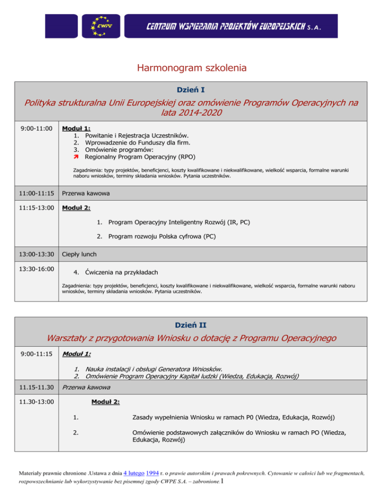 Harmonogram szkolenia - Centrum Wspierania Projektów