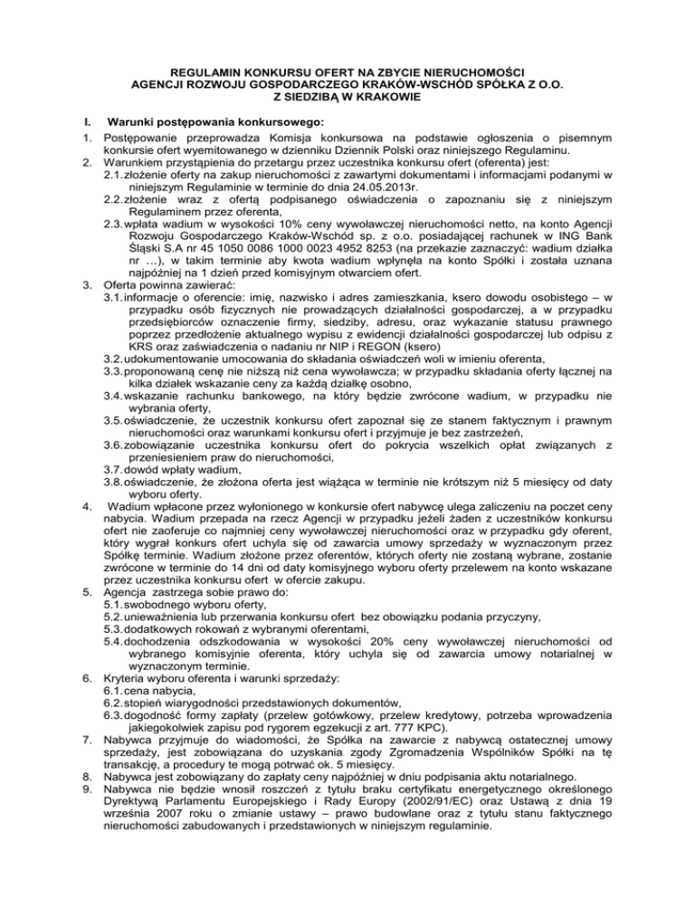 REGULAMIN KONKURSU OFERT NA ZBYCIE NIERUCHOMOŚCI AGENCJI ROZWOJU GOSPODARCZEGO KRAKÓW-WSCHÓD SPÓŁKA Z O.O. Z SIEDZIBĄ W KRAKOWIE I. Warunki postępowania konkursowego: 1. Postępowanie przeprowadza Komisja konkursowa na podstawie ogłoszenia o pisemnym konkursie ofert wyemitowanego w dzienniku Dziennik Polski oraz niniejszego Regulaminu. 2. Warunkiem przystąpienia do przetargu przez uczestnika konkursu ofert (oferenta) jest: 2.1. złożenie oferty na zakup nieruchomości z zawartymi dokumentami i informacjami podanymi w niniejszym Regulaminie w terminie do dnia 24.05.2013r. 2.2. złożenie wraz z ofertą podpisanego oświadczenia o zapoznaniu się z niniejszym Regulaminem przez oferenta, 2.3. wpłata wadium w wysokości 10% ceny wywoławczej nieruchomości netto, na konto Agencji Rozwoju Gospodarczego Kraków-Wschód sp. z o.o. posiadającej rachunek w ING Bank Śląski S.A nr 45 1050 0086 1000 0023 4952 8253 (na przekazie zaznaczyć: wadium działka nr …), w takim terminie aby kwota wadium wpłynęła na konto Spółki i została uznana najpóźniej na 1 dzień przed komisyjnym otwarciem ofert. 3. Oferta powinna zawierać: 3.1. informacje o oferencie: imię, nazwisko i adres zamieszkania, ksero dowodu osobistego – w przypadku osób fizycznych nie prowadzących działalności gospodarczej, a w przypadku przedsiębiorców oznaczenie firmy, siedziby, adresu, oraz wykazanie statusu prawnego poprzez przedłożenie aktualnego wypisu z ewidencji działalności gospodarczej lub odpisu z KRS oraz zaświadczenia o nadaniu nr NIP i REGON (ksero) 3.2. udokumentowanie umocowania do składania oświadczeń woli w imieniu oferenta, 3.3. proponowaną cenę nie niższą niż cena wywoławcza; w przypadku składania oferty łącznej na kilka działek wskazanie ceny za każdą działkę osobno, 3.4. wskazanie rachunku bankowego, na który będzie zwrócone wadium, w przypadku nie wybrania oferty, 3.5. oświadczenie, że uczestnik konkursu ofert zapoznał się ze stanem faktycznym i prawnym nieruchomości oraz warunkami konkursu ofert i przyjmuje je bez zastrzeżeń, 3.6. zobowiązanie uczestnika konkursu ofert do pokrycia wszelkich opłat związanych z przeniesieniem praw do nieruchomości, 3.7. dowód wpłaty wadium, 3.8. oświadczenie, że złożona oferta jest wiążąca w terminie nie krótszym niż 5 miesięcy od daty wyboru oferty. 4. Wadium wpłacone przez wyłonionego w konkursie ofert nabywcę ulega zaliczeniu na poczet ceny nabycia. Wadium przepada na rzecz Agencji w przypadku jeżeli żaden z uczestników konkursu ofert nie zaoferuje co najmniej ceny wywoławczej nieruchomości oraz w przypadku gdy oferent, który wygrał konkurs ofert uchyla się od zawarcia umowy sprzedaży w wyznaczonym przez Spółkę terminie. Wadium złożone przez oferentów, których oferty nie zostaną wybrane, zostanie zwrócone w terminie do 14 dni od daty komisyjnego wyboru oferty przelewem na konto wskazane przez uczestnika konkursu ofert w ofercie zakupu. 5. Agencja zastrzega sobie prawo do: 5.1. swobodnego wyboru oferty, 5.2. unieważnienia lub przerwania konkursu ofert bez obowiązku podania przyczyny, 5.3. dodatkowych rokowań z wybranymi oferentami, 5.4. dochodzenia odszkodowania w wysokości 20% ceny wywoławczej nieruchomości od wybranego komisyjnie oferenta, który uchyla się od zawarcia umowy notarialnej w wyznaczonym terminie. 6. Kryteria wyboru oferenta i warunki sprzedaży: 6.1. cena nabycia, 6.2. stopień wiarygodności przedstawionych dokumentów, 6.3. dogodność formy zapłaty (przelew gotówkowy, przelew kredytowy, potrzeba wprowadzenia jakiegokolwiek zapisu pod rygorem egzekucji z art. 777 KPC). 7. Nabywca przyjmuje do wiadomości, że Spółka na zawarcie z nabywcą ostatecznej umowy sprzedaży, jest zobowiązana do uzyskania zgody Zgromadzenia Wspólników Spółki na tę transakcję, a procedury te mogą potrwać ok. 5 miesięcy. 8. Nabywca jest zobowiązany do zapłaty ceny najpóźniej w dniu podpisania aktu notarialnego. 9. Nabywca nie będzie wnosił roszczeń z tytułu braku certyfikatu energetycznego określonego Dyrektywą Parlamentu Europejskiego i Rady Europy (2002/91/EC) oraz Ustawą z dnia 19 września 2007 roku o zmianie ustawy – prawo budowlane oraz z tytułu stanu faktycznego nieruchomości zabudowanych i przedstawionych w niniejszym regulaminie. II. Przedmiot postępowania konkursowego: Konkurs ofert dotyczy sprzedaży prawa użytkowania wieczystego i własności, niezabudowanych i zabudowanych działek gruntu położonych w Krakowie Nowej Hucie os. Branice. Oferta może dotyczyć jednej, niektórych lub wszystkich działek wyspecyfikowanych w tabeli, wedle woli oferenta. 2 powierzchnia w m lp. obręb nr działki 1 2 3 4 5 6 7 8 9 10 11 12 13 14 15 16 17 18 19 20 21 22 23 24 25 26 27 28 29 30 31 32 33 34 35 36 37 38 39 40 41 42 43 44 45 46 47 48 49 50 51 52 53 54 55 56 57 58 59 60 61 62 63 64 65 66 67 68 69 70 36 36 36 36 36 36 36 36 36 36 36 36 36 36 36 36 36 36 36 36 36 36 36 36 36 36 36 36 36 36 36 36 36 36 36 36 36 36 36 36 36 36 36 36 36 36 36 36 36 37 37 37 37 37 37 37 37 37 37 37 37 37 37 37 37 37 37 37 37 37 11 12 13 20 21 23 30 31 35 52 54 55 58 60 81 91 99 105 106 107 116 117 120 122 124 127 129 147 154 170 185 193 195 200 202 204 207 210 215 227 250 258 259 266 281 323 327 333 340 64 66 80 91 92 99 100 104/2 133 134 135 136 137 140 141 142 143 144 147/1 149 169 adres nieruchomości gruntu ul. Rzepakowa ul. Rzepakowa ul. Rzepakowa okolice ul. Igołomskiej okolice ul. Igołomskiej okolice ul. Igołomskiej ul. Szymańskiego ul. Szymańskiego ul. Szymańskiego okolice ul. Igołomskiej okolice ul. Igołomskiej ul. Rzepakowa okolice ul. Igołomskiej ul. Rzepakowa ul. Rzepakowa ul. Rzepakowa ul. Rzepakowa okolice ul. Rzepakowej okolice ul. Rzepakowej okolice ul. Rzepakowej okolice ul. Szymańskiego okolice ul. Szymańskiego ul. Szymańskiego ul. Szymańskiego ul. Szymańskiego ul. Szymańskiego okolice ul. Szymańskiego ul Karaszewicza ul. Sasanek okolice ul. T