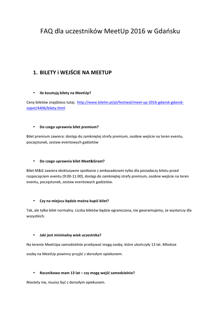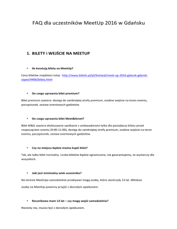 FAQdlauczestnikówMeetUp2016wGdańsku 1. BILETYiWEJŚCIENAMEETUP • IlekosztująbiletynaMeetUp? Cenybiletówznajdziesztutaj:http://www.biletin.pl/pl/festiwal/meet-up-2016-gdansk-gdansksopot/4406/bilety.html • Doczegouprawniabiletpremium? Biletpremiumzawiera:dostępdozamkniętejstrefypremium,osobnewejścienatereneventu, poczęstunek,zestaweventowychgadżetów • DoczegouprawniabiletMeet&Greet? BiletM&Gzawieraekskluzywnespotkaniezambasadoramitylkodlaposiadaczybiletuprzed rozpoczęciemeventu(9:00-11:00),dostępdozamkniętejstrefypremium,osobnewejścienateren eventu,poczęstunek,zestaweventowychgadżetów. • Czynamiejscubędziemożnakupićbilet? Tak,aletylkobiletnormalny.Liczbabiletówbędzieograniczona,niegwarantujemy,żewystarczydla wszystkich. • Jakijestminimalnywiekuczestnika? NaterenieMeetUpasamodzielnieprzebywaćmogąosoby,któreukończyły13lat.Młodsze osobynaMeetUppowinnyprzyjśćzdorosłymopiekunem. • Rocznikowomam13lat–czymogęwejśćsamodzielnie? Niestetynie,musiszbyćzdorosłymopiekunem. • Zakilkadnikończę13lat–czymogęwejśćsamodzielnie? Niestetynie,musiszbyćzdorosłymopiekunem. • Czyrodzicmożenapisaćmioświadczenie,żemogęwejśćsamodzielnie? Niestetynie.Jeśliniemaszskończonych13lat,musiszprzyjśćzopiekunem. • Czymójopiekunmusikupićbilet? Tak,każdyuczestnikmusimiećswójbilet. • Czyosobyniepełnosprawnemogąwejśćzadarmo? Nie,wszyscyuczestnicymusząmiećbilety. • JakdojechaćdoERGOAreny? 45minzlotniskaim.LechaWałęsyautobusem122doprzystankuERGOARENA 16minzdworcakolejowegoGDAŃSKGŁÓWNYidworcaPKSGdańsktramwajemSKM(przystanek GdańskŻabianka) 3minutyzdworcakolejowegoSOPOTtramwajemSKM(przystanekGdańskŻabianka) • Gdziemogęzaparkowaćsamochód? PrzyERGOArenieznajdująsięoznakowaneparkingi. • Jaktrafiędoodpowiedniegowejścia?Niezgubięsię? Niemartwsię!Wszystkiewejściabędąbardzowyraźnieoznakowane–trafiszbezproblemu. • CzybiletypremiumiM&Gmająosobnewejście? Tak,będąoneodpowiedniooznaczone. • Czynaeventmuszęprzyjśćpunktualnie? Nie,alesprawdźdokłądnieprogram,żebynicCięnieominęło. • DoktórejgodzinypotrwaMeetUP? Konieceventuzaplanowanyjestmiędzy19a20:00. • CzymogęwyjśćzERGOArenyiwrócićdośrodka? Tak,ponieważprzypierwszymwejściuTwójbiletwymienionyzostanienaspecjalnąopaskę. 2. AKREDYTACJE • CzymogędołączyćdoWaszejekipyjakowolontariusz? Nie,ponieważmamyjużskompletowanąekipę. • MamkanałnaYouTubie–czymogęubiegaćsięoakredytację? Możesz–nadolestronyinternetowejznajdujesięodpowiedniformularz.Wypełnijgoipoczekajna odpowiedźorganizatorów. • Ilemuszęmiećsubów,żebydostaćakredytację? Niemamystałegoprogu–przyznawanieakredytacjizależnebędzieodliczbyosób,któreotakową będąsięubiegały. • Ktomożeubiegaćsięoakredytacjęmedialną? Dziennikarzeiczynnipracownicyredakcji(prasa,radio,telewizja,portaleinternetowe) 3. EVENT • Czybędziemożliwośćkupieniaczegośdojedzenia? Tak,naterenieERGOArenybędziemożnakupićcośdojedzenia. • CzynapewnoudamisięzrobićzdjęciezmoimulubionymYouTuberem? YouTuberzybędądostępninaterenieeventuprzezcałydzień–wystarczy,żebędzieszdobrzeszukać iłapaćichnaściankach. • CzynaMeetUpiebędziemójulubionyYouTuber? ZerkajnanaszfanpageMeetUpPolska–publikujemytamnabieżącolistętwórców,którzypojawią sięnaevencie. • JakieatrakcjebędąnaMeetUpie? Nanaszejstronieinternetowejopublikujemyniedługocałyprogram. • Jakznajdęstrefępremium?Odktórejgodzinymogętamwejść? WERGOAreniebędąodpowiednieoznaczenia,akilkadniprzedMeetUpemopublikujemymapkę całegoeventu.DlaosóbzbiletamipremiumstrefaPremiumczynnabędzieodgodziny11:00,adla osóbzbiletamiM&Godgodziny09:00. • GdzieikiedyodbędziesięMeet&Greetzambasadorami? Meet&Greetodbędziemiędzy9:00a11:00wstrefiePremium. 4. MEETUPWEWROCŁAWIU • KiedybędziemożnakupićbiletynaMeetUpweWrocałwiu? Bliżejwakacji,niedługodamyznaćnafanpage’uMeetUpPolska. • JacyYouTuberzybędąweWrocławiu? Będziemydawaćznaćbliżejwakacji.