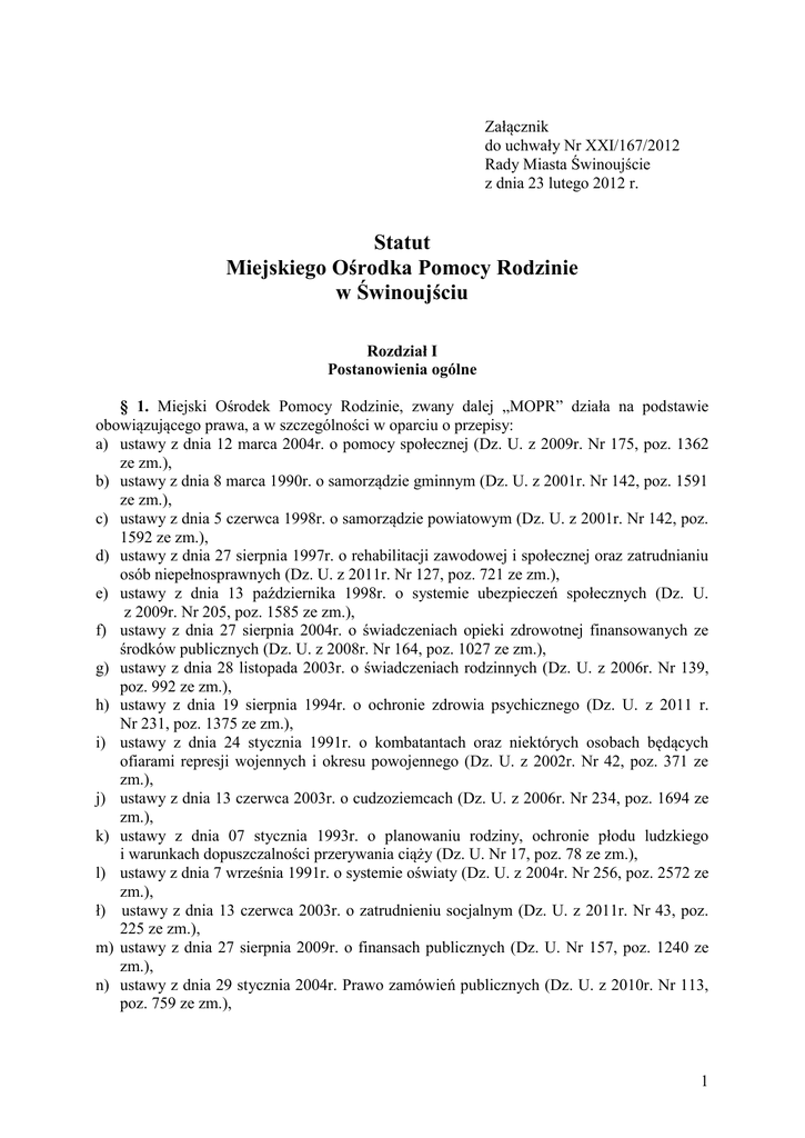Załącznik do uchwały Nr XXI/167/2012 Rady Miasta Świnoujście z dnia 23 lutego 2012 r. Statut Miejskiego Ośrodka Pomocy Rodzinie w Świnoujściu Rozdział I Postanowienia ogólne § 1. Miejski Ośrodek Pomocy Rodzinie, zwany dalej „MOPR” działa na podstawie obowiązującego prawa, a w szczególności w oparciu o przepisy: a) ustawy z dnia 12 marca 2004r. o pomocy społecznej (Dz. U. z 2009r. Nr 175, poz. 1362 ze zm.), b) ustawy z dnia 8 marca 1990r. o samorządzie gminnym (Dz. U. z 2001r. Nr 142, poz. 1591 ze zm.), c) ustawy z dnia 5 czerwca 1998r. o samorządzie powiatowym (Dz. U. z 2001r. Nr 142, poz. 1592 ze zm.), d) ustawy z dnia 27 sierpnia 1997r. o rehabilitacji zawodowej i społecznej oraz zatrudnianiu osób niepełnosprawnych (Dz. U. z 2011r. Nr 127, poz. 721 ze zm.), e) ustawy z dnia 13 października 1998r. o systemie ubezpieczeń społecznych (Dz. U. z 2009r. Nr 205, poz. 1585 ze zm.), f) ustawy z dnia 27 sierpnia 2004r. o świadczeniach opieki zdrowotnej finansowanych ze środków publicznych (Dz. U. z 2008r. Nr 164, poz. 1027 ze zm.), g) ustawy z dnia 28 listopada 2003r. o świadczeniach rodzinnych (Dz. U. z 2006r. Nr 139, poz. 992 ze zm.), h) ustawy z dnia 19 sierpnia 1994r. o ochronie zdrowia psychicznego (Dz. U. z 2011 r. Nr 231, poz. 1375 ze zm.), i) ustawy z dnia 24 stycznia 1991r. o kombatantach oraz niektórych osobach będących ofiarami represji wojennych i okresu powojennego (Dz. U. z 2002r. Nr 42, poz. 371 ze zm.), j) ustawy z dnia 13 czerwca 2003r. o cudzoziemcach (Dz. U. z 2006r. Nr 234, poz. 1694 ze zm.), k) ustawy z dnia 07 stycznia 1993r. o planowaniu rodziny, ochronie płodu ludzkiego i warunkach dopuszczalności przerywania ciąży (Dz. U. Nr 17, poz. 78 ze zm.), l) ustawy z dnia 7 września 1991r. o systemie oświaty (Dz. U. z 2004r. Nr 256, poz. 2572 ze zm.), ł) ustawy z dnia 13 czerwca 2003r. o zatrudnieniu socjalnym (Dz. U. z 2011r. Nr 43, poz. 225 ze zm.), m) ustawy z dnia 27 sierpnia 2009r. o finansach publicznych (Dz. U. Nr 157, poz. 1240 ze zm.), n) ustawy z dnia 29 stycznia 2004r. Prawo zamówień publicznych (Dz. U. z 2010r. Nr 113, poz. 759 ze zm.), 1 o) ustawy z dnia 22 kwietnia 2005 r. o postępowaniu wobec dłużników alimentacyjnych oraz zaliczce alimentacyjnej (Dz. U. Nr 86, poz. 732 ze zm.), p) ustawy z dnia 20 kwietnia 2004r. o promocji zatrudnienia i instytucjach rynku pracy (Dz. U. z 2008r. Nr 69, poz. 415 ze zm.), r) ustawy z dnia 29 lipca 2005r. o przeciwdziałaniu narkomanii (Dz. U. Nr 179, poz. 1485 ze zm.), s) ustawy z dnia 29 lipca 2005r. o przeciwdziałaniu przemocy w rodzinie (Dz. U. Nr 180, poz. 1493 ze zm.), t) ustawy z dnia 7 września 2007r. o pomocy osobom uprawnionym do alimentów (Dz. U. z 2009r. Nr 1, poz. 7 ze zm.) u) ustawy z dnia 9 czerwca 2011 r. o wspieraniu rodziny i systemie pieczy zastępczej (Dz. U. z 2011r. Nr 149, poz. 887). w) uchwały Nr V/28/99 Rady Miasta Świnoujścia z dnia 18 lutego 1999 roku w sprawie powołania Miejskiego Ośrodka pomocy Rodzinie w Świnoujściu i upoważnienia jego dyrektora do wydawania decyzji administracyjnych, y) niniejszego statutu uchwalonego przez Radę Miasta Świnoujścia, § 2. MOPR jest samodzielną jednostką organizacyjną nie posiadającą osobowości prawnej, działającą jako wyodrębniona jednostka budżetowa Miasta Świnoujścia. § 3. 1. Siedziba MOPR mieści się przy ul. J. Dąbrowskiego 4 w Świnoujściu. 2. Terenem działania MOPR jest Miasto Świnoujście. Rozdział II Cele i zakres działania § 4. 1. Celem działania MOPR jest w szczególności umożliwienie osobom i rodzinom przezwyciężanie trudnych sytuacji życiowych, których nie są one w stanie pokonać, wykorzystując własne uprawnienia, zasoby i możliwości. 2. Zapobieganie sytuacjom, o których mowa w § 4 ust. 1, przez podejmowanie działań zmierzających do życiowego usamodzielnienia osób i rodzin oraz ich integracji ze środowiskiem. § 5. Do zakresu działania MOPR między innymi należy: a) pobudzanie społecznej aktywności w zaspokajaniu niezbędnych potrzeb życiowych osób i rodzin, w szczególności poprzez: - świadczenie usług, w tym usług opiekuńczych, - przyznawanie i wypłacanie świadczeń, - organizowanie specjalistycznego poradnictwa socjalnego, przewidzianych ustawą o pomocy społecznej oraz innymi przepisami, b) prowadzenie pracy socjalnej, rozumianej jako działalność zawodowa, skierowanej na pomoc osobom i rodzinom we wzmacnianiu lub odzyskaniu zdolności do funkcjonowania w społeczeństwie oraz na tworzenie warunków sprzyjających temu celowi, c) prowadzenie badań i analiz służących ocenie wielkości potrzeb, stosowania właściwych sposobów udzielania świadczeń z zakresu pomocy społecznej oraz formułowanie oceny stopnia zaspokajania potrzeb, d) opracowywanie strategii i programów rozwiązywania problemów społecznych, e) współpraca z organami administracji rządowej i samorządowej, a także z organizacjami społecznymi i pozarządowymi, Kościołem Katolickim i innymi kościołami, związkami wyznaniowymi oraz osobami fizycznymi i prawnymi, f) wspomaganie środowisk lokalnych organizujących pracę z dziećmi i młodzieżą, 2 g) wykonywanie innych przekazywanych zadań, na rzecz osób i rodzin wymagających wsparcia i pomocy, w tym pomoc kombatantom, prowadzenie postępowań w sprawach świadczeń rodzinnych oraz zaliczek alimentacyjnych, h) wspieranie rodzin przeżywających trudności w wypełnianiu funkcji opiekuńczowychowawczych, i) wykonywanie zadań w zakresie przeciwdziałania przemocy w rodzinie, j) prowadzenie postępowań w sprawach świadczeń z funduszu alimentacyjnego oraz podejmowanie działań wobec dłużników alimentacyjnych w zakresie wynikającym z ustawy o pomocy osobom uprawnionym do alimentów. § 6. MOPR realizuje zadania: 1) Miasta Świnoujście w zakresie pomocy społecznej, będące zadaniami własnymi o charakterze obowiązkowym i własnymi gminy, w szczególności: a) udzielanie schronienia, zapewnienie po