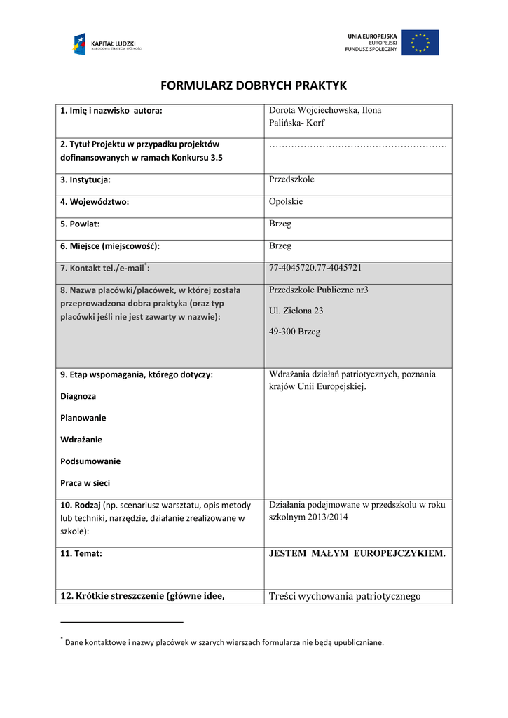 FORMULARZ DOBRYCH PRAKTYK 1. Imię i nazwisko autora: Dorota Wojciechowska, Ilona Palińska- Korf 2. Tytuł Projektu w przypadku projektów dofinansowanych w ramach Konkursu 3.5 ………………………………………………… 3. Instytucja: Przedszkole 4. Województwo: Opolskie 5. Powiat: Brzeg 6. Miejsce (miejscowość): Brzeg 7. Kontakt tel./e-mail*: 77-4045720.77-4045721 8. Nazwa placówki/placówek, w której została przeprowadzona dobra praktyka (oraz typ placówki jeśli nie jest zawarty w nazwie): Przedszkole Publiczne nr3 Ul. Zielona 23 49-300 Brzeg 9. Etap wspomagania, którego dotyczy: Wdrażania działań patriotycznych, poznania krajów Unii Europejskiej. Diagnoza Planowanie Wdrażanie Podsumowanie Praca w sieci 10. Rodzaj (np. scenariusz warsztatu, opis metody lub techniki, narzędzie, działanie zrealizowane w szkole): Działania podejmowane w przedszkolu w roku szkolnym 2013/2014 11. Temat: JESTEM MAŁYM EUROPEJCZYKIEM. 12. Krótkie streszczenie (główne idee, Treści wychowania patriotycznego * Dane kontaktowe i nazwy placówek w szarych wierszach formularza nie będą upubliczniane. założenia, uzasadnienie): 13. Cel: realizowane są już na szczeblu edukacji przedszkolnej. Głównym zadaniem przedszkola jest budzenie u dzieci miłości do małej i wielkiej Ojczyzny przez ugruntowanie poczucia tożsamości regionalnej, narodowej, europejskiej. Kształtowanie patriotyzmu jest doniosłym zadaniem nauczyciela, to on bowiem przygotowuje nowe pokolenie Polaków, które w przyszłości weźmie w swe ręce losy Ojczyzny. 14. Szczegółowy przebieg: Przybliżanie dzieciom kultury i dorobku krajów wspólnoty europejskiej. Rozbudzanie ciekawości dzieci poprzez poznawanie piękna i bogactwa wybranych krajów Unii Europejskiej. Kształtowanie wśród dzieci tolerancji wobec innych ludzi. Kształtowanie świadomości narodowej dziecka, jego poczucia więzi ze swoim krajem i zintegrowaną Europą Podczas realizacji tematu podjęłyśmy szereg działań : Zorganizowanie i przeprowadzenie zajęć dydaktycznych wprowadzających dzieci w szczegóły danego państwa Unii Europejskiej – jedno państwo w miesiącu „Palcem po mapie”. Poznanie znaczenia zwrotu: „Unia Europejska”, poznanie symboli UE ( (flaga, hymn). Zapoznanie dzieci z wyglądem flag wybranych państw UE, zorganizowanie rodzinnego konkursu plastycznego (Wykorzystanie różnorodnych technik plastycznych). Poznanie charakterystycznych postaci i autorów wybranych państw oraz ich dzieł podczas cyklicznych spotkań z panią bibliotekarką – nawiązanie współpracy z miejską biblioteką. Zachęcanie dzieci do próbowania wyszukanych posiłków – wprowadzanie ciekawych propozycji kulinarnych związanych z danym państwem. „ Mali poligloci” – zachęcanie dzieci do stosowania zwrotów grzecznościowych (dzień dobry, do widzenia, dziękuję, przepraszam) w języku państwa, o którym mowa w danym miesiącu. Zapoznanie dzieci z tańcami danych krajów, charakterystyczną muzyką, piosenkami. Wyrabianie u dzieci tolerancji w stosunku do ludzi innych krajów poprzez wyszukiwanie pozycji w literaturze, oglądanie ilustracji, filmów – wystawa prac plastycznych dzieci „Mój przyjaciel Europejczyk”. Podsumowaniem rocznej pracy a także upamiętnieniem rocznicy był festyn rodzinny „W Unii Europejskiej wszystkie dzieci są wesołe” ukazujący dzieciom i przybyłym gościom, że państwa europejskie, wchodzące w skład unii, to jedna wielka rodzina. Każda grupa, poczynając od maluszków, reprezentowała inny kraj. Przybyli na festyn rodzice oraz pozostali goście mieli więc możliwość podróży przez Polskę, Francję, Holandię, Hiszpanię oraz Czechy. Nie mogło więc zabraknąć Pasadoble, Polki czy polskiego Trojaka. Oprócz tego każda grupa zaprezentowała znany wszystkim kanon „Panie Janie” w języku kraju, jaki reprezentowała. Całość zakończyło odśpiewanie piosenki „Europa wspólny dom”, której refrenu uczyli się rodzice podczas festynu. Imprezy takie, to nie tylko wspaniała okazja do wspólnego spędzanie czasu, do integracji rodziców z przedszkolem, ale również sposób na podsumowanie rocznej pracy z dziećmi. 15. Wskazówki dla „naśladowców”: Decydując się na realizację tematu „JESTEM MAŁYM EUROPEJCZYKIEM” początkowo obawialiśmy się czy temat nie jest zbyt trudny i poważny do realizacji w przedszkolu z małymi dziećmi. Nasze obawy zostały rozwiane już po pierwszych zajęciach. Pozornie trudnych tematów nie należy się bać, warto podejmować trud. W przyszłości również będziemy w dużym stopniu angażować rodziców do realizacji wspólnych zadań i przedsięwzięć. Ewentualne rezultat(y) prosimy dodawać jako załączniki do wiadomości, w której przesyłany jest formularz. Dobre praktyki prosimy przesyłać na adres: [email protected] – z tytułem wiadomości zawierającym „Dobre praktyki” na początku. Wysyłając wypełnione zgłoszenie autor/autorzy oświadcza(ją), że wyraża(ją) Ośrodkowi Rozwoju Edukacji zgodę do rozpowszechniania na wszelkich polach eksploatacji zawartych w nim informacji (z wyłączeniem pkt. 7 i 8), ich redakcję oraz oświadcza(ją), że materiał stanowi wytwór autorski i został opracowany samodzielnie i nie narusza praw autorskich innych osób.