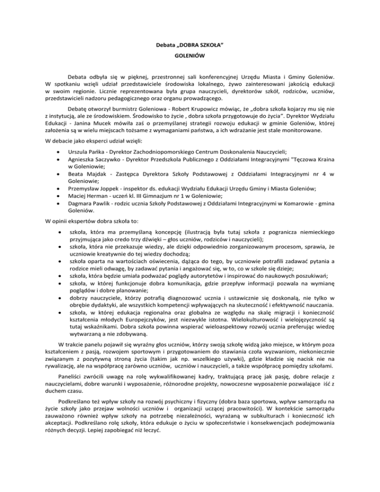 Debata „DOBRA SZKOŁA” GOLENIÓW Debata odbyła się w pięknej, przestronnej sali konferencyjnej Urzędu Miasta i Gminy Goleniów. W spotkaniu wzięli udział przedstawiciele środowiska lokalnego, żywo zainteresowani jakością edukacji w swoim regionie. Licznie reprezentowana była grupa nauczycieli, dyrektorów szkół, rodziców, uczniów, przedstawicieli nadzoru pedagogicznego oraz organu prowadzącego. Debatę otworzył burmistrz Goleniowa - Robert Krupowicz mówiąc, że „dobra szkoła kojarzy mu się nie z instytucją, ale ze środowiskiem. Środowisko to życie , dobra szkoła przygotowuje do życia”. Dyrektor Wydziału Edukacji - Janina Mucek mówiła zaś o przemyślanej strategii rozwoju edukacji w gminie Goleniów, której założenia są w wielu miejscach tożsame z wymaganiami państwa, a ich wdrażanie jest stale monitorowane. W debacie jako eksperci udział wzięli: Urszula Pańka - Dyrektor Zachodniopomorskiego Centrum Doskonalenia Nauczycieli; Agnieszka Saczywko - Dyrektor Przedszkola Publicznego z Oddziałami Integracyjnymi "Tęczowa Kraina w Goleniowie; Beata Majdak - Zastępca Dyrektora Szkoły Podstawowej z Oddziałami Integracyjnymi nr 4 w Goleniowie; Przemysław Joppek - inspektor ds. edukacji Wydziału Edukacji Urzędu Gminy i Miasta Goleniów; Maciej Herman - uczeń kl. III Gimnazjum nr 1 w Goleniowie; Dagmara Pawlik - rodzic ucznia Szkoły Podstawowej z Oddziałami Integracyjnymi w Komarowie - gmina Goleniów. W opinii ekspertów dobra szkoła to: szkoła, która ma przemyślaną koncepcję (ilustracją była tutaj szkoła z pogranicza niemieckiego przyjmująca jako credo trzy dźwięki – głos uczniów, rodziców i nauczycieli); szkoła, która nie przekazuje wiedzy, ale dzięki odpowiednio zorganizowanym procesom, sprawia, że uczniowie kreatywnie do tej wiedzy dochodzą; szkoła oparta na wartościach oświecenia, dążąca do tego, by uczniowie potrafili zadawać pytania a rodzice mieli odwagę, by zadawać pytania i angażować się, w to, co w szkole się dzieje; szkoła, która będzie umiała podważać poglądy autorytetów i inspirować do naukowych poszukiwań; szkoła, w której funkcjonuje dobra komunikacja, gdzie przepływ informacji pozwala na wymianę poglądów i dobre planowanie; dobrzy nauczyciele, którzy potrafią diagnozować ucznia i ustawicznie się doskonalą, nie tylko w obrębie dydaktyki, ale wszystkich kompetencji wpływających na skuteczność i efektywność nauczania. szkoła, w której edukacja regionalna oraz globalna ze względu na skalę migracji i konieczność kształcenia młodych Europejczyków, jest niezwykle istotna. Wielokulturowość i wielojęzyczność są tutaj wskaźnikami. Dobra szkoła powinna wspierać wieloaspektowy rozwój ucznia preferując wiedzę wytwarzaną a nie zdobywaną. W trakcie panelu pojawił się wyraźny głos uczniów, którzy swoją szkołę widzą jako miejsce, w którym poza kształceniem z pasją, rozwojem sportowym i przygotowaniem do stawiania czoła wyzwaniom, niekoniecznie związanym z pozytywną stroną życia (takim jak np. wszelkiego używki), gdzie kładzie się nacisk nie na rywalizację, ale na współpracę zarówno uczniów, uczniów i nauczycieli, a także współpracę pomiędzy szkołami. Paneliści zwrócili uwagę na rolę wykwalifikowanej kadry, traktującą pracę jak pasję, dobre relacje z nauczycielami, dobre warunki i wyposażenie, różnorodne projekty, nowoczesne wyposażenie pozwalające iść z duchem czasu. Podkreślano też wpływ szkoły na rozwój psychiczny i fizyczny (dobra baza sportowa, wpływ samorządu na życie szkoły jako przejaw wolności uczniów i organizacji uczącej pracowitości). W kontekście samorządu zauważono również wpływ szkoły na potrzebę niezależności, wyrażaną w subkulturach i konieczność ich akceptacji. Podkreślano rolę szkoły, która edukuje o życiu w społeczeństwie i konsekwencjach podejmowania różnych decyzji. Lepiej zapobiegać niż leczyć. W opinii rodziców dobra szkoła to dobrze wynagradzani i dobrze przygotowani nauczyciele, zwracający uwagę na każdego ucznia, by nie przegapić indywidualnych predyspozycji i zdolności. Dobra szkoła, to szkoła aktywizująca rodziców tak, by nie stali oni z boku, oraz wspierająca ich w poważnym traktowaniu dzieci (poważne traktowanie wymaga wyznaczania granic i respektowania tych granic. Rolą szkoły jest wyznaczać autorytety, a nie sprawować władzę autorytarną. Cytat z wypowiedzi jednaj z panelistek - „Jak ktoś chce szybkich efektów, niech sieje zboże”, pokazuje świadomość, że edukacja i wychowanie to dłuższy proces. Bardzo ważne w dobrej szkole jest podmiotowe traktowanie ucznia – w opinii panelistki „poważne, uznające prawo do pragnień i możliwości ich wyrażania”. Dobrą szkołą jest szkoła rozwijającą zainteresowania i stwarzająca wszystkim możliwość rozwoju. W drodze do stworzenia dobrej szkoły istnieją jednak ograniczenia. Według uczestników debaty są to m.in. finanse; częste, drogie zmieniany podręczników (w opinii rodziców); zbyt liczne zmiany prawa oświatowego, nie pozwalającego skupić się dyrektorom na realizacji wizji szkoły. Po wypowiedziach panelistów odtworzono nagraną wypowiedź Joanny Kulmowej, która stwierdziła, że dobra szkoła to taka, która pozwala spełniać marzenia i dobrze się bawić uczniom, robić to, co lubią. Po prezentacji panelistów rozpoczęła się dyskusją, która pokazała, że jakość oświaty i szkół na terenie gminy Goleniów jest dla uczestników ważna. Odważnie stawiano m.in. pytania na temat tego, czy nauczanie w szkole może odbywać się poprzez realizację projektów międzyprzedmiotowych, czy nauczyciel może uczyć tego, ile drewna potrzebuje stolarz na wykonanie krzesła. Dyskusja wskazała, że takie możliwości daje nowa podstawa programowa i wspólne planowanie przez nauczycieli procesów edukacyjnych. Przewijające się w dyskusji 