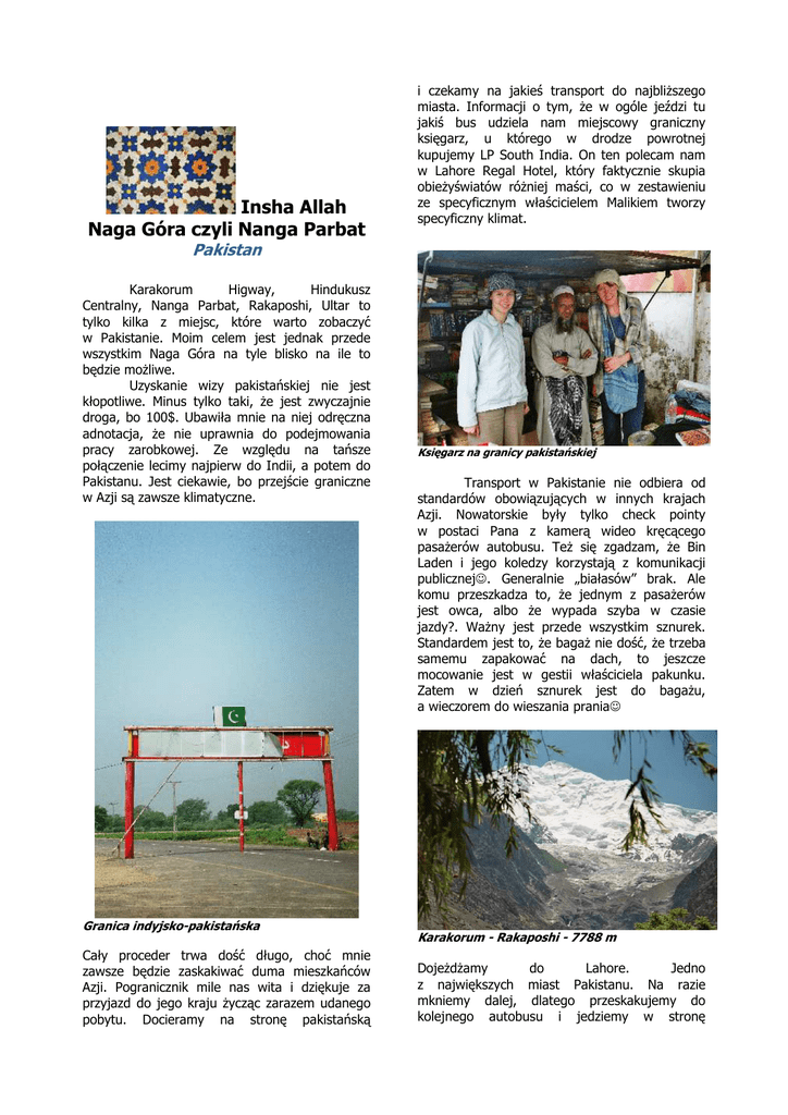 Insha Allah Naga Góra czyli Nanga Parbat i czekamy na jakieś transport do najbliższego miasta. Informacji o tym, że w ogóle jeździ tu jakiś bus udziela nam miejscowy graniczny księgarz, u którego w drodze powrotnej kupujemy LP South India. On ten polecam nam w Lahore Regal Hotel, który faktycznie skupia obieżyświatów różniej maści, co w zestawieniu ze specyficznym właścicielem Malikiem tworzy specyficzny klimat. Pakistan Karakorum Higway, Hindukusz Centralny, Nanga Parbat, Rakaposhi, Ultar to tylko kilka z miejsc, które warto zobaczyć w Pakistanie. Moim celem jest jednak przede wszystkim Naga Góra na tyle blisko na ile to będzie możliwe. Uzyskanie wizy pakistańskiej nie jest kłopotliwe. Minus tylko taki, że jest zwyczajnie droga, bo 100$. Ubawiła mnie na niej odręczna adnotacja, że nie uprawnia do podejmowania pracy zarobkowej. Ze względu na tańsze połączenie lecimy najpierw do Indii, a potem do Pakistanu. Jest ciekawie, bo przejście graniczne w Azji są zawsze klimatyczne. Granica indyjsko-pakistańska Cały proceder trwa dość długo, choć mnie zawsze będzie zaskakiwać duma mieszkańców Azji. Pogranicznik mile nas wita i dziękuje za przyjazd do jego kraju życząc zarazem udanego pobytu. Docieramy na stronę pakistańską Księgarz na granicy pakistańskiej Transport w Pakistanie nie odbiera od standardów obowiązujących w innych krajach Azji. Nowatorskie były tylko check pointy w postaci Pana z kamerą wideo kręcącego pasażerów autobusu. Też się zgadzam, że Bin Laden i jego koledzy korzystają z komunikacji publicznej☺. Generalnie „białasów” brak. Ale komu przeszkadza to, że jednym z pasażerów jest owca, albo że wypada szyba w czasie jazdy?. Ważny jest przede wszystkim sznurek. Standardem jest to, że bagaż nie dość, że trzeba samemu zapakować na dach, to jeszcze mocowanie jest w gestii właściciela pakunku. Zatem w dzień sznurek jest do bagażu, a wieczorem do wieszania prania☺ Karakorum - Rakaposhi - 7788 m Dojeżdżamy do Lahore. Jedno z największych miast Pakistanu. Na razie mkniemy dalej, dlatego przeskakujemy do kolejnego autobusu i jedziemy w stronę Islamabadu i Rawalpindii. Stamtąd bowiem jadą autobusy w stronę Karakorum Highway (KHH). Do Rawalpindii docieramy zdrowo po 23.00. Dojście do dworca to błotnista breją, na poboczu leży zdechła krowa, mroczno, ciemno, wilki jakieś.... Generalnie sytuacja staje się lekko niepokojąca. Jeszcze bardziej jak się okazuje, że nie ma połączenia nocnego w stronę gór. Przydworcowe hotele raczej nie wyglądają zachęcająco. Wtedy Kasia przypomina sobie, że jest tutaj na kontrakcie kolega kolegi. Zatem prawie bliski znajomy☺. Nie wierzyłam, że po nas przyjedzie. Przyjechał, choć widać było przerażone w jego oczach. Do dłużej rozmowie okazało się, że przez KW Katowice mamy wspólnych znajomych. Świat jest naprawdę mały, tym bardziej, że ja Kasię poznałam przez net, a do spotkania doszło dopiero na lotnisku w Delhi. Korzystamy w gościny Kolegi. Jedziemy na wycieczkę do Taxila, które jest jednym z najbardziej znanych terenów archeologicznych świata. Kiedyś było to również centrum buddyzmu. Oglądamy również Shas Faisal Mosgue w Islamabadzie (mogący zmieścić 100 tys. wiernych), który jak to bywa z budowlami idącymi na rekord nie należy do najładniejszych. Wracamy na nasz dworzec w Rawalpindi i kupujemy bilet do Rainkhot Bridge. Niestety trafiamy na ostatnie miejsca w tyle autobusu, co przy podróży przeszło 14h oznacza niestety niezłe bujanie i loty z siedzenia pod dach autobusu. Na spanie nie ma kompletnie szans. kawałek na stopa. Docieramy do wioski składającej się z 4 chat. Nie ma bieżącej wody, ale jest zimna cola, którą pijemy będąc bacznie oglądanymi przez mieszkańców. Idziemy dalej, bo kolejny odpoczynek czeka nam przy Feary Meadow. Drepcząc czujemy jak zmęczenie autobusową podróżą daje znać. Robimy sobie przerwę na drzemkę po drodze. Efekt? Nie mamy szans dotrzeć tego samego dnia do Feary. 15 km w 40˚C skwarze do Rainkhot Bridge Rozbijamy namiot na pierwszym płaskim terenie. Jest na tyle ciepło, że śpimy przy otwartych namiocie z widokiem na Nanga Parbat. Rano nie budzi nas słonce, ale oczy wpatrzone w nasze twarze. Nie wiem skąd pojawił się ten człowiek, ale z kałasznikowem na ramieniu wzbudza respekt. Częstuję go cukierkami, bo z języka urdu jestem raczej kiepska. W zamian dostaję szkiełka. Tak mi się przynajmniej wtedy wydawało. W dalszej podróży okazało się, że są to lokalne minerały, tj. turmalin i kryształ górski. Po rozmowie w języku migowym domyślamy się, że mężczyzna liczył, że mamy coś na zapalenie spojówek. Chyba.. Niestety nasza apteczka to wyłącznie podstawowe medykamenty w stylu „stop sraka” i niewiele możemy tak realnie pomóc. Przynajmniej w temacie oczu:) Biuro podróży Silk Route w Rawalpindii Do miejsca naszego startu dojeżdżamy nad ranem, jeszcze przed największym słońcem. Potem zaczyna się piekło... 15kg plecak da się znieść, gorzej z temperaturą, która osiąga 40 stopni. A na cień nie ma żadnych szans. Mija nas jeep wypełniony japończykami. Robią nam zdjęcia, bo nikt tej drogi w ciągu dnia nie pokonuje na piechotę. W końcu łapiemy się mały W drodze do Feary Meadow Gotujemy na paliwie turystycznym kuskusa i dalej w drogę. Dość szybko dochodzimy do Feary Meadow. Tutaj też dokonujemy wyciągnięcia szwów z ręki kumpla. Bezpośrednio przed wyjazdem miał mały wypadek i założono mu kilka szwów na dłoni, które po 10 dniach trzeba było wyciągnąć. Nie było innej rady jak zabrać skalpel na wyjazd. Stan zapalny się nie wdał, ale wysokość spowodowała ogólną opuchliznę, w efekcie czego rozcięcie raczej się finezyjnie nie zrosło. Najważniejsze, że dobrze się goi. Ruszamy dalej w stronę Beyali. Na tej wysokości już jest gorzej z gotowaniem. Udaje się jednak zjeść kus-kus, 