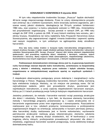 KOMUNIKAT Z KONFERENCJI 9 stycznia 2016 W tym roku niepołomickie środowisko Szczepu „Puszcza” będzie obchodzić 40-lecie swego nieprzerwanego działania. Przez te cztery dziesięciolecia przyszło nam zmierzyć się z wielkimi wyzwaniami, które stwarzały zarówno zagrożenia, jak i szanse nowej jakości działania. Ideologizacja lat 70-tych, przełom Solidarności 1980 roku, stan wojenny i w końcu odzyskanie wolności w 1989 roku. Zmienialiśmy też przynależność organizacyjną – Szczep powstał w ramach ZHP, po 1990 roku wstąpił do ZHP 1918, a potem do ZHR. W swej historii mieliśmy lata wzrostu, jak i okresy kryzysu. Dwadzieścia lat temu nadaliśmy Kołu Przyjaciół Harcerstwa status Stowarzyszenia, aby zagwarantować ciągłość trwania środowiska i zapewnić opiekę nad naszym majątkiem, w tym unikalnym na ogólnopolska skalę ośrodkiem harcerskim. Dwa lata temu wobec braków w korpusie kadry instruktorskiej zintegrowaliśmy w ramach struktury Szczepu w jeden zespół młodzież pełniącą funkcje instruktorskie i aktywnych członków Stowarzyszenia KPH. Szczep „Puszcza” stanowi dziś istotny element niepołomickiej społeczności. Jest prawdziwą wspólnotą dzieci, młodzieży i dorosłych, rodziców, byłych instruktorów i harcerzy. Mamy wsparcie władz samorządowych, niepołomickiego szkolnictwa, duchowieństwa oraz innych organizacji i stowarzyszeń, z którymi współpracujemy. Podstawowym doświadczeniem minionego okresu jest to, że gwarancję żywotności ruchu harcerskiego stanowi dojrzała kadra instruktorska, zorientowana na bezpośrednią pracę z dziećmi i młodzieżą, wspierana przez rodziców i byłych członków Szczepu, zorganizowana w wielopokoleniowej wspólnocie opartej na wspólnych symbolach i tradycji. Z niepokojem obserwujemy postępujący proces słabnięcia i marginalizacji ruchu harcerskiego w Polsce. Wygasają środowiska harcerskie, których wielką wartością była wieloletnia tradycja. Niestety, na ich miejsce nie powstają nowe. Od lat najtrudniejsze zadanie, jakim jest prowadzenie drużyn, powierzane jest najmłodszym instruktorom, a coraz częściej niepełnoletnim harcerzom starszym, którzy po 2-3 latach przekazują swoje funkcje kolejnym niepełnoletnim harcerzom Jesteśmy przekonani, że metoda i harcerskie wartości wciąż pozostają atrakcyjne dla dzieci i młodzieży. Świadczy o tym fakt, że kluczowe elementy harcerskiej metody i harcerskiego programu przejmowane są i często atrakcyjniej niż w harcerstwie organizowane przez inne organizacje i stowarzyszenia. Puszczaństwo realizowane jest w tzw. szkołach przeżycia; terenoznawstwo w profesjonalnie organizowanych biegach na orientację; samarytanka w kursach pierwszej pomocy; idea harcerskiej służby realizowana jest w formie wolontariatu; wychowanie patriotyczne atrakcyjnie realizują grupy rekonstrukcyjne; elementy szkolenia wojskowego stały się domeną drużyn strzeleckich, itd. W konfrontacji z coraz bogatszą ofertą różnych, profesjonalnie prowadzonych aktywności dla dzieci i młodzieży, organizacje harcerskie wyraźnie przegrywają. Coraz dotkliwiej brakuje doświadczonej kadry. W takiej sytuacji potrzeba się zdobyć na krytyczną autorefleksję, aby odpowiedzieć na pytania, jakie są rzeczywiste przyczyny słabnięcia ruchu harcerskiego? Czy przypadkiem sami nie tworzymy wewnątrz organizacji barier, które w konsekwencji ograniczają bądź blokują możliwości ich rozwoju? Dlatego Komendantka Szczepu phm Ewa Rychtarczyk i Przewodniczący KPH pwd Piotr Nescieruk zaprosili do naszego ośrodka harcerskiego w Niepołomicach wybitnych przedstawicieli ruchu harcerskiego: hm Bogusława Kośmidera – Przewodniczącego Rady Miasta Krakowa, wieloletniego instruktora Szczepu „Zielona Trójka”; hm Marka Gajdzińskiego – wieloletniego instruktora Szczepu 16 WDH, współzałożyciela ZHR, aktualnie komendanta Mazowieckiej Chorągwi ZHR, autora książki - bestsellera ostatnich lat „Harcerski system wychowania”, hm Jarosława Błoniarza – wieloletniego instruktora opolskiego środowiska harcerskiego, byłego wiceprzewodniczącego ZHR, aktualnie członka Rady Naczelnej ZHR i animatora Niezależnego Wydawnictwa Harcerskiego, hm Andrzeja Wysockiego – członka założyciela ZHR, wieloletniego instruktora Szczepu „Zielona Trójka”, współtwórcę Hufca Podhalańskiego ZHP i autora ostatnio wydanej książki na temat ruchu wędrowniczego „Wodzowie i wilki”. W szerokim gronie zaproszonych do dyskusji gości, kadry instruktorskiej Szczepu, członków KPH, rodziców i sympatyków, przedstawicieli władz niepołomickiego samorządu oraz Powiatu Wielickiego, niepołomickiej oświaty - odbyliśmy debatę próbując znaleźć odpowiedzi na kluczowe naszym zdaniem kwestie: 1. Jaka jest rzeczywista kondycja ruchu harcerskiego? Czy sposób zorganizowania struktur organizacyjnych służy skutecznie animowaniu i wspieraniu harcerskiej pracy na poziomie drużyn i lokalnych wspólnot harcerskich? Czy małe, rozproszone drużyny kierowane przez najmłodszych instruktorów mają szansę na skuteczne realizowanie podstawowych form harcerskiego wychowania? 2. Czy istniejący model kształcenia i zdobywania stopni instruktorskich służy animowaniu ruchu harcerskiego? 3. Czy organizacje harcerskie potrafią skutecznie wykorzystać potencjał byłych instruktorów i harcerzy? Czy istnieje system współpracy z rodzicami i szerokim otoczeniem społecznym? W dyskusji moderowanej przez: hm Wojciecha Wróblewskiego, hm Macieja Klimę i phm Dorotę Zielonka zidentyfikowaliśmy następujące bariery wewnątrzorganizacyjne, które ograniczają, bądź wręcz uniemożliwiają rozwój ruchu harcerskiego: 1. Organizacja - Ruch Sposób zorganizowania, a szczególnie ilość pionów organizacyjnych i praktyka działania struktur ZHR stają się coraz częściej barierą dla skutecznej pracy wychowawczej i programowej na poziomie drużyn i szczepów. Drużynowi s