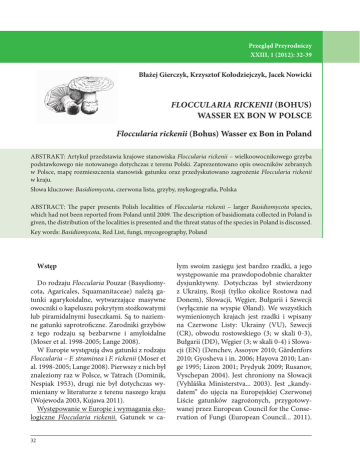 Przegląd Przyrodniczy XXIII, 1 (2012): 32-39 Błażej Gierczyk, Krzysztof Kołodziejczyk, Jacek Nowicki FLOCCULARIA RICKENII (BOHUS) WASSER EX BON W POLSCE Floccularia rickenii (Bohus) Wasser ex Bon in Poland ABSTRAKT: Artykuł przedstawia krajowe stanowiska Floccularia rickenii – wielkoowocnikowego grzyba podstawkowego nie notowanego dotychczas z terenu Polski. Zaprezentowano opis owocników zebranych w Polsce, mapę rozmieszczenia stanowisk gatunku oraz przedyskutowano zagrożenie Floccularia rickenii w kraju. Słowa kluczowe: Basidiomycota, czerwona lista, grzyby, mykogeografia, Polska ABSTRACT: The paper presents Polish localities of Floccularia rickenii – larger Basidiomycota species, which had not been reported from Poland until 2009. The description of basidiomata collected in Poland is given, the distribution of the localities is presented and the threat status of the species in Poland is discussed. Key words: Basidiomycota, Red List, fungi, mycogeography, Poland Wstęp Do rodzaju Floccularia Pouzar (Basydiomycota, Agaricales, Squamanitaceae) należą gatunki agarykoidalne, wytwarzające masywne owocniki o kapeluszu pokrytym stożkowatymi lub piramidalnymi łuseczkami. Są to naziemne gatunki saprotroficzne. Zarodniki grzybów z tego rodzaju są bezbarwne i amyloidalne (Moser et al. 1998-2005; Lange 2008). W Europie występują dwa gatunki z rodzaju Floccularia – F. straminea i F. rickenii (Moser et al. 1998-2005; Lange 2008). Pierwszy z nich był znaleziony raz w Polsce, w Tatrach (Dominik, Nespiak 1953), drugi nie był dotychczas wymieniany w literaturze z terenu naszego kraju (Wojewoda 2003, Kujawa 2011). Występowanie w Europie i wymagania ekologiczne Floccularia rickenii. Gatunek w ca32 łym swoim zasięgu jest bardzo rzadki, a jego występowanie ma prawdopodobnie charakter dysjunktywny. Dotychczas był stwierdzony z Ukrainy, Rosji (tylko okolice Rostowa nad Donem), Słowacji, Węgier, Bułgarii i Szwecji (wyłącznie na wyspie Øland). We wszystkich wymienionych krajach jest rzadki i wpisany na Czerwone Listy: Ukrainy (VU), Szwecji (CR), obwodu rostowskiego (3; w skali 0-3), Bułgarii (DD), Węgier (3; w skali 0-4) i Słowacji (EN) (Denchev, Assoyov 2010; Gärdenfors 2010; Gyosheva i in. 2006; Hayova 2010; Lange 1995; Lizon 2001; Prydyuk 2009; Rusanov, Vyschepan 2004). Jest chroniony na Słowacji (Vyhláška Ministerstva... 2003). Jest „kandydatem” do ujęcia na Europejskiej Czerwonej Liście gatunków zagrożonych, przygotowywanej przez European Council for the Conservation of Fungi (European Council... 2011). Floccularia rickenii (Bohus) Wasser ex Bon w Polsce Ryc. 1. Owocniki Floccularia rickenii ze stanowiska koło Niesulowa: A. przekrój owocnika; B. powierzchnia kapelusza; C. pokrój; D. strefa pierścieniowa; E. młody owocnik (fot. K. Kołodziejczyk) Fig. 1. Basidiomata of Floccularia rickenii from the locality near Niesulów: A. cross-section of the basidiocarp; B. pileus surface; C. general habit; D. annular zone; E. young basidiocarp (photo by K. Kołodziejczyk) Floccularia rickenii jest gatunkiem ciepłolubnym, preferującym termofilne lasy i zarośla na glebach piaszczystych. Zdaniem większości badaczy (m.in. Dermek 1988; Horak 2005) jest związana z robinią akacjową (Robinia pseudoacacia), jednakże na Ukrainie znajdowana była w monokulturach klonu tatarskiego (Acer tataricum) (Prydyuk 2009), a w Szwecji w zaroślach głogowo-różanych (Crataegus rhi- pidophylla v. rhipidophylla, Rosa sp.) (Bohlin, Knutsson 2001). Omawiany gatunek ma jadalne owocniki, jakkolwiek przez rzadkość swojego występowania jest mało znany i tylko sporadycznie zbierany. W regionach gdzie występuje liczniej (okolice Hurbanowa na Słowacji, południowo-wschodnia Ukraina), miejscowa ludność zbiera go dość często. Uważa się, że spożyty 33 Przegląd Przyrodniczy XXIII, 1 (2012) Ryc. 2. Cechy mikroskopowe Floccularia rickenii: A. skórka kapelusza; B. zarodniki; C. podstawki; D. elementy osłony (podziałka: 10 μm) Fig. 2. Microcharacters of Floccularia rickenii: A. pileipellis; B. spores; C. basidia; D. elements of veil (scale bar: 10 μm) w większych ilościach może wywołać objawy zatrucia, głównie objawy ze strony przewodu pokarmowego (nudności) (Dermek 1988). Celem artykułu jest zaprezentowanie Floccularia rickenii – gatunku stwierdzonego po raz pierwszy w Polsce w 2009 roku, przedstawienie opisu znalezionych owocników i mapy rozmieszczenia gatunku oraz przedyskutowanie jego zagrożenia w kraju. Metody Nazwy gatunków roślin podano za Mirkiem i in. (2002), gatunków grzybów – za Wojewodą (2003) natomiast nazwy makro- i mezoregionów przyjęto za Kondrackim (2002). Opis cech mikroskopowych sporządzono na podstawie obserwacji owocników zebranych w Wielkopolsce, z których wykonano preparaty mikroskopowe barwione w czerwieni Kongo. Pomiary zarodników przeprowadzono dla losowej, reprezentatywnej próby 30 zarodników. Obserwacje i pomiary wykonano przy użyciu mikroskopu Bresser Bino Researcher, wyposażonego w obiektyw immersyjny (100×). Rysunki sporządzono w oparciu o mikrofotografie zrobione przy pomocy aparatu Nikon Coolpix 950 Digi34 tal Camera. Owocniki są przechowywane w prywatnym fungarium jednego z autorów (BG). Wyniki Floccularia rickenii (Bohus) Wasser ex Bon Synonimy: Armillaria rickenii Bohus; Ripartitella rickenii (Bohus) Singer; Tricholoma luteovirens ss. Ricken p. p. (Volk, Burdsall 1995) Opis gatunku. Owocnik masywny, agarykoidalny, kapelusz do 90 mm średnicy, początkowo wypukły, półkulisty, z czasem rozpostarty, kremowo-żółty do jasnokremowego, pokryty licznymi piramidalnymi łuseczkami kremowej barwy, do 4 mm wysokimi. Trzon krótszy od średnicy kapelusza, do 60 x 30 mm, bulwiasto zgrubiały u podstawy, biały do kremowego, poniżej strefy pierścieniowej gęsto pokryty łuseczkami podobnymi do tych na kapeluszu, powyżej strefy pierścieniowej nagi. Strefa pierścieniowa wyraźna, włóknisto-łuseczkowata. Bl