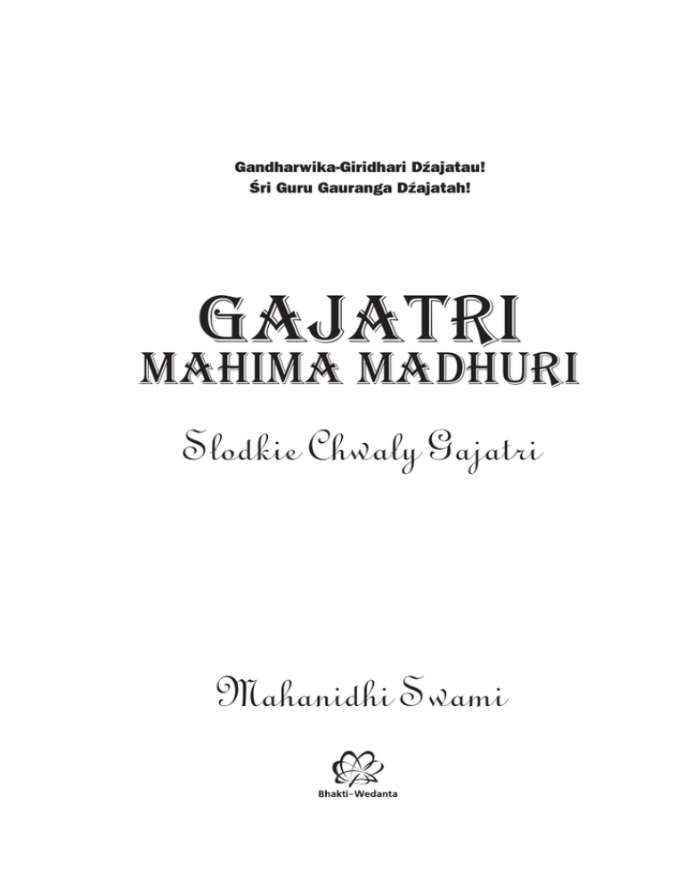 Gandharwika-Giridhari Dźajatau! Śri Guru Gauranga Dźajatah! gajatri mahima madhuri Słodkie Chwały Gajatri Mahanidhi Swami Tytuł wydania angielskiego: Gayatri mahima madhuri Tłumaczenie – Madana Mohana Mohini Dewi Dasi Korekta – Diwja Kisiori Dewi Dasi i bh Arek DTP – Ćamasa Muni Das Projekt okładki – Asi Kunda Dewi Dasi © Copyright for Polish edition by Bhakti Wedanta © Copyright for English edition by Mahanidhi Swami ISBN 83-60275-01-7 Wydanie I Warszawa 2007/520 Gaurabda Dystrybucja: Wydawnictwo Bhakti-Wedanta ul. Zakręt 11, 05-500 Piaseczno Adres do korespondencji: ul. Marszałkowska 6/7, 00-590 Warszawa tel./faks (0-22) 398 02 77, kom. (0-601) 592 111 [email protected], www.bhakti-wedanta.pl Czytelników zainteresowanych tematem tej książki zapraszamy do korespondencji lub odwiedzenia miejsc kultury wisznuickiej: Świątynia Międzynarodowego Towarzystwa Świadomości Kryszny ul. Zakręt 11 Mysiadło k. Warszawy 05-500 Piaseczno, tel. (22) 750 77 97 Świątynia Międzynarodowego Towarzystwa Świadomości Kryszny ul. Brodzka 157, 54-067 Wrocław tel. (71) 354 38 02 Świątynia Międzynarodowego Towarzystwa Świadomości Kryszny Czarnów 21, 58-424 Pisarzowice k/Kamiennej Góry tel. (75) 742 88 92 Spis treści Wprowadzenie 11 Wstęp 13 Rozdział pierwszy – Diksza i Upanajanam Trzy Margi • Mantra • Moc Mantry • Upanajanam • Upanajanam i tradycja Gaudija • Pańća Samskary • Diksza • Kwalifikacje guru • Zwykłe cechy charakterystyczne • Wyjątkowe cechy charakterystyczne • Cechy ucznia • Właściwy czas na mantra diksza Rozdział drugi – Brahma Gajatri Tożsamość Brahma-gajatri • Źródło Brahma-gajatri • Znaczenie Om Znaczenie Wjahryti – Bhur, Bhuwah, Swaha • Znaczenie Tat • Znaczenie Sawitur • Znaczenie Warenjam • Znaczenie Bhargo • Znaczenie Dewasja • Znaczenie Dhimahi • Znaczenie Dhijo jo nah • Znaczenie Praćodajat • Znaczenie Mantry Brahma-gajatri • Sambandha, Abhidheja i Prajodźana • Korzyści z intonowania Brahma-gajatri • Brahma-gajatri i Śrimad Bhagawatam • Brahma-gajatri i Maha-mantra Hare Kryszna • Historie z Prabhupadem i Gajatri Rozdział trzeci – Upawita i zasady intonowani Święta nić • Jak zrobić nić bramińską • Nektar Upawity • Znaczenie Mantry • Jak intonować Mantry • Modlitwy Bhuta Suddhi • Mantra siddhi • Najlepszy czas do intonowania Rozdział czwarty – Guru Gajatri Wizja Guru • Znaczenie Ajm • Znaczenie Guru-mantry • Znaczenie słów Guru-gajatri • Znaczenie Guru-Gajatr Rozdział piąty – Gaura Gajatri Znaczenie Gaura Mantry • Znaczenie słów Gaura-gajatri • Znaczenie Gaura-gajatri Gajatri Mahima Madhuri – Słodkie Chwały Gajatri 3 Gajatri Mahima Madhuri – Słodkie Chwały Gajatri Rozdział szósty – Gopala Mantra Tożsamość i znaczenie • Gopala-mantra i sambandha • Gopala-mantra – Swarasiki i Mantra Upasana • Znaczenie Gopala-mantry • Znaczenie Klim • Znaczenie Krysznaja • Znaczenie Gowindaja • Znaczenie Gopidźanawallabhaja • Znaczenie Swaha • Znaczenie słów w Gopala-mantrze • Znaczenie Gopala-mantry • Jak intonować Gopala-mantrę • Korzyści z Gopala-mantry • Gopala-mantra i intonowanie Hare Kryszna • Pan Ćajtanja i Gopala-mantra Rozdział siódmy – Kama Gajatri Tożsamość • Historia oświecenia Brahmy • Śri Wryndawan Dham • Brahma-samhita, modlitwy Brahmy • Podsumowanie oświecenia Brahmy • Znaczenie Klim • Znaczenie Kamadewaja • Znaczenie Widmahe • Znaczenie Puszpa, Banaja i Dhimahi • Znaczenie Tan • Znaczenie Ananga • Znaczenie Praćodajat • Znaczenie Kama-gajatri • Klim Kama-dewaja Widmahe • Puszpa-banaja-dhimahi • Tan No Nangah Praćodajat • Dodatkowe znaczenia Kama-gajatri • Księżyce Krysznaćandry • Medytacje o Kama-gajatri • Korzyści z intonowania Kama-gajatri Rozdział ósmy – Mantra Gopi Bhawa Mantra Sannjasa (braminów-awadhuta) • Błaganie o premę • Znaczenie Om • Znaczenie Klim • Znaczenie Gopi Bhawa • Znaczenie Aśrajaja • Znaczenie Swaha • Znaczenie mantry Gopi-bhawa • Medytacje o mantrze Gopi-bhawa • Kiedy intonować mantrę Gopi Bhawad • Sannjasa Szikszamryta • Kwalifikacje do przyjęcia sannjasy • Inicjacja sannjasa • Samskary Sannjasa Dasa • Inicjacja sannjasa Śri Ćajtanji • Posłannik • Mańdźari Bhawa • Właściwe zachowanie • Cytaty Prabhupada do rozmyślania •Pierwsza kwalifikacja • Swami Jezus • Cztery etapy • Rób to, co niezbędne • Nauczanie z sukcesem • Miłość oznacza współpracę • Czytaj i nauczaj • Znaczenie dandy sannjasa • Doskonałość sannjasy • Śrila Prabhupada przyjmuje sannjasę • Śri Ćajtanja Mahaprabhu – sannjasa lila • Prema Bhikszu – Kryszna przyjmuje sannjasę 4 Gajatri Mahima Madhuri dedykuję mojemu ukochanemu mistrzowi duchowemu Jego Boskiej Łasce A.C.Bhaktiwedancie Swamiemu Prabhupadowi, Założycielowi-Aćarji Międzynarodowego Towarzystwa Świadomości Kryszny. Z powodu swojego nieograniczonego współczucia dla tej upadłej duszy, łaskawie obdarzył mnie świętymi mantrami Gajatri i przyjął mnie na swojego ucznia. Wszelka chwała mojemu najbardziej miłosiernemu mistrzowi, wiecznemu przyjacielowi i przewodnikowi. Gajatri Mahima Madhuri – Słodkie Chwały Gajatri Podziękowania Na początku wyrażam swoją wdzięczność Gopala Kryszna Goswamiemu. Jako mój GBC, Brat Duchowy i przyjaciel był zawsze tolerancyjny i wspierał mnie, dodając odwagi w ostatnich dziesięciu latach w Indiach. Dziękuje Bhanu Swamiemu i Gopiparanadhana za tłumaczenie Hari-bhakti-wilasa i za odpowiadanie na wiele moich pytań odnośnie mantry Gajatri. Jestem wielkim dłużnikiem Bhakti Widjapurny Swamiego, za poświęcenie wielu godzin swojego cennego czasu, aby przewodzić mi w tym temacie. Z całego serca dziękuję Rupa-Raghunacie, Gopala Ćandra Gosz i wielu Gaudija Wajsznawom i sannjasinom, którzy pomagali na różne sposoby. Ragalekha 
