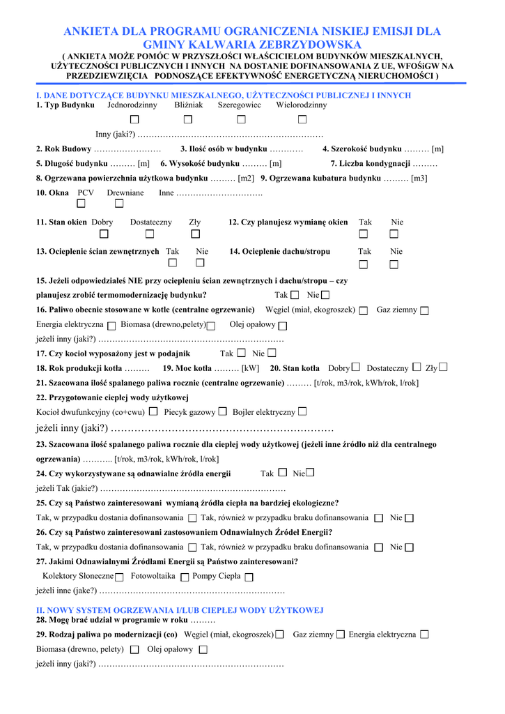 ANKIETA DLA PROGRAMU OGRANICZENIA NISKIEJ EMISJI DLA GMINY KALWARIA ZEBRZYDOWSKA ( ANKIETA MOŻE POMÓC W PRZYSZŁOŚCI WŁAŚCICIELOM BUDYNKÓW MIESZKALNYCH, UŻYTECZNOŚCI PUBLICZNYCH I INNYCH NA DOSTANIE DOFINANSOWANIA Z UE, WFOŚiGW NA PRZEDZIEWZIĘCIA PODNOSZĄCE EFEKTYWNOŚĆ ENERGETYCZNĄ NIERUCHOMOŚCI ) I. DANE DOTYCZĄCE BUDYNKU MIESZKALNEGO, UŻYTECZNOŚCI PUBLICZNEJ I INNYCH 1. Typ Budynku Jednorodzinny Bliźniak Szeregowiec Wielorodzinny Inny (jaki?) ………………………………………………………… 2. Rok Budowy …………………… 5. Długość budynku ……… [m] 3. Ilość osób w budynku ………… 4. Szerokość budynku ……… [m] 6. Wysokość budynku ……… [m] 7. Liczba kondygnacji ……… 8. Ogrzewana powierzchnia użytkowa budynku ……… [m2] 9. Ogrzewana kubatura budynku ……… [m3] 10. Okna PCV Inne …………………………. Drewniane 11. Stan okien Dobry Dostateczny Zły 13. Ocieplenie ścian zewnętrznych Tak Nie 12. Czy planujesz wymianę okien Tak Nie 14. Ocieplenie dachu/stropu Tak Nie 15. Jeżeli odpowiedziałeś NIE przy ociepleniu ścian zewnętrznych i dachu/stropu – czy planujesz zrobić termomodernizację budynku? Tak Węgiel (miał, ekogroszek) 16. Paliwo obecnie stosowane w kotle (centralne ogrzewanie) Energia elektryczna Biomasa (drewno,pelety) Nie Gaz ziemny Olej opałowy jeżeli inny (jaki?) ………………………………………………………… 17. Czy kocioł wyposażony jest w podajnik 18. Rok produkcji kotła ……… Tak Nie 19. Moc kotła ……… [kW] 20. Stan kotła Dobry Dostateczny Zły 21. Szacowana ilość spalanego paliwa rocznie (centralne ogrzewanie) ……… [t/rok, m3/rok, kWh/rok, l/rok] 22. Przygotowanie ciepłej wody użytkowej Kocioł dwufunkcyjny (co+cwu) Piecyk gazowy Bojler elektryczny jeżeli inny (jaki?) ………………………………………………………… 23. Szacowana ilość spalanego paliwa rocznie dla ciepłej wody użytkowej (jeżeli inne źródło niż dla centralnego ogrzewania) ……….. [t/rok, m3/rok, kWh/rok, l/rok] 24. Czy wykorzystywane są odnawialne źródła energii Tak Nie jeżeli Tak (jakie?) ………………………………………………………… 25. Czy są Państwo zainteresowani wymianą źródła ciepła na bardziej ekologiczne? Tak, również w przypadku braku dofinansowania Tak, w przypadku dostania dofinansowania Nie 26. Czy są Państwo zainteresowani zastosowaniem Odnawialnych Źródeł Energii? Tak, również w przypadku braku dofinansowania Tak, w przypadku dostania dofinansowania Nie 27. Jakimi Odnawialnymi Źródłami Energii są Państwo zainteresowani? Kolektory Słoneczne Fotowoltaika Pompy Ciepła jeżeli inne (jake?) ………………………………………………………… II. NOWY SYSTEM OGRZEWANIA I/LUB CIEPŁEJ WODY UŻYTKOWEJ 28. Mogę brać udział w programie w roku ……… 29. Rodzaj paliwa po modernizacji (co) Węgiel (miał, ekogroszek) Biomasa (drewno, pelety) Olej opałowy jeżeli inny (jaki?) ………………………………………………………… Gaz ziemny Energia elektryczna 30. Przygotowanie ciepłej wody użytkowej po modernizacji Kocioł dwufunkcyjny (co+cwu) Piecyk gazowy Bojler elektryczny jeżeli inny (jaki?) ………………………………………………………… 31. Mógłbym(mogłabym) wnieść maksymalnie wkład w wysokości: 2000 zł. 4000 zł. 6000 zł. 8000 zł. inny (jaki?) ……………………………….. III. TRANSPORT 32. Czy posiadają Państwo samochód osobowy? Tak Nie 33. Ile posiadają Państwo samochodów osobowych? …….. 34. Rok produkcji samochodów ……………………… 35. Jakiego rodzaju paliwa używają Państwo w samochodach? Benzyna Diesel LPG Biodisel inny (jaki?) ………………………. 36. Ile kilometrów pokonują Państwo samochodem (samochodami) rocznie? …….. 37. Czy Państwo regularnie korzystają z transportu publicznego? Tak Nie 38. Jeżeli Tak jakim? ……………………… 39. Ile osób korzysta z transportu publicznego? …………………. IV. DANE WŁAŚCICIELA BUDYNKU 40. Imię i Nazwisko (lub Nazwa firmy) ……………………………………… 41. Adres ……………………………….... 42. Telefon kontaktowy ……………………………….... 43. E-mail ……………………………………………….... Wyrażam zgodę na przetwarzanie moich danych osobowych przez Gminę Kalwaria Zebrzydowska zgodnie z ustawą z dnia 29 sierpnia 1997r. o ochronie danych osobowych (Dz. U. z 2002 r. Nr 101, poz. 926 z późn. zm.) dla potrzeb realizacji Programu Ograniczenia Niskiej Emisji. ……………………….. …………………….. data, miejscowość czytelny podpis