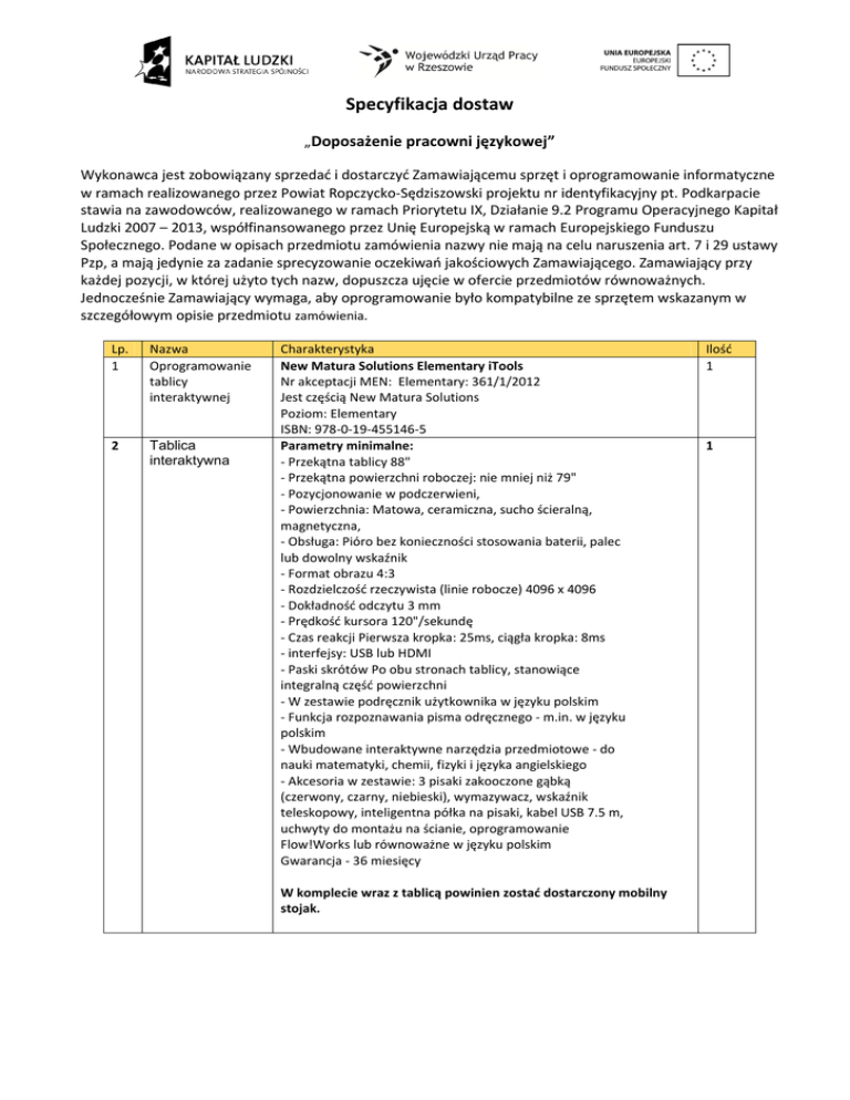 Specyfikacja dostaw „Doposażenie pracowni językowej” Wykonawca jest zobowiązany sprzedać i dostarczyć Zamawiającemu sprzęt i oprogramowanie informatyczne w ramach realizowanego przez Powiat Ropczycko-Sędziszowski projektu nr identyfikacyjny pt. Podkarpacie stawia na zawodowców, realizowanego w ramach Priorytetu IX, Działanie 9.2 Programu Operacyjnego Kapitał Ludzki 2007 – 2013, współfinansowanego przez Unię Europejską w ramach Europejskiego Funduszu Społecznego. Podane w opisach przedmiotu zamówienia nazwy nie mają na celu naruszenia art. 7 i 29 ustawy Pzp, a mają jedynie za zadanie sprecyzowanie oczekiwań jakościowych Zamawiającego. Zamawiający przy każdej pozycji, w której użyto tych nazw, dopuszcza ujęcie w ofercie przedmiotów równoważnych. Jednocześnie Zamawiający wymaga, aby oprogramowanie było kompatybilne ze sprzętem wskazanym w szczegółowym opisie przedmiotu zamówienia. Lp. 1 Nazwa Oprogramowanie tablicy interaktywnej 2 Tablica interaktywna Charakterystyka New Matura Solutions Elementary iTools Nr akceptacji MEN: Elementary: 361/1/2012 Jest częścią New Matura Solutions Poziom: Elementary ISBN: 978-0-19-455146-5 Parametry minimalne: - Przekątna tablicy 88" - Przekątna powierzchni roboczej: nie mniej niż 79" - Pozycjonowanie w podczerwieni, - Powierzchnia: Matowa, ceramiczna, sucho ścieralną, magnetyczna, - Obsługa: Pióro bez konieczności stosowania baterii, palec lub dowolny wskaźnik - Format obrazu 4:3 - Rozdzielczość rzeczywista (linie robocze) 4096 x 4096 - Dokładność odczytu 3 mm - Prędkość kursora 120"/sekundę - Czas reakcji Pierwsza kropka: 25ms, ciągła kropka: 8ms - interfejsy: USB lub HDMI - Paski skrótów Po obu stronach tablicy, stanowiące integralną część powierzchni - W zestawie podręcznik użytkownika w języku polskim - Funkcja rozpoznawania pisma odręcznego - m.in. w języku polskim - Wbudowane interaktywne narzędzia przedmiotowe - do nauki matematyki, chemii, fizyki i języka angielskiego - Akcesoria w zestawie: 3 pisaki zakooczone gąbką (czerwony, czarny, niebieski), wymazywacz, wskaźnik teleskopowy, inteligentna półka na pisaki, kabel USB 7.5 m, uchwyty do montażu na ścianie, oprogramowanie Flow!Works lub równoważne w języku polskim Gwarancja - 36 miesięcy W komplecie wraz z tablicą powinien zostać dostarczony mobilny stojak. Ilość 1 1 3 Projektor multimedialny 4 Laptop Poglądowe zdjęcie stojaka z tablicą Parametry minimalne: Technologia ekranu – DLP Rozdzielczość podstawowa min 720p (1280x720) lub (1280x800) Możliwe rozdzielczości min. VGA (640x480) do UXGA (1600 x 1200) Jasność min. 2200 ANSI Lumenów Kontrast min. 10000:1 Zoom min. 1,11:1 Korekta trapezu min. 1D, Pionowo +/- 40 stopni Długość życia lampy min. 190W/4500/6000 godz. (tryb normalny / tryb ekonomiczny) Częstotliwość pozioma min. 31~90 kHz Częstotliwość pionowa min. 48~120 Hz Wyświetlane kolory min. 1,07 mld pełna paleta kolorów Proporcje obrazu 16:10, 16:9, 4:3 Akcesoria standardowe: instrukcja szybkiego uruchamiania, instrukcja obsługi na płycie CD, pilot/baterie, kabel VGA, kabel zasilający, torba Języki OSD (On Screen Display) min. polski/angielski Złącza: S-Video, HDMI, D-Sub, Audio 3,5 mm, RS232 (DB-9pin) Wbudowane głośniki Sprzęt fabrycznie nowy Komputer przenośny o parametrach nie gorszych niż: - ekran LCD LED o przekątnej od 15 do 16 cali, - minimalna rozdzielczość LCD 1366x768, - procesor uzyskujący co najmniej 3500 punktów w teście PassMark – CPU Mark z dnia 26.09.2013 r., kategoria: High End CPUs. (http://www.cpubenchmark.net; w załączeniu obraz strony zawierający wyniki testu) - wielkość pamięci RAM 4GB DDR3 1333 MHz, - dysk twardy minimum 500 GB SATA, 5400 RPM, - napęd optyczny DVD+/-RW DL, - wyjście karty graficznej D-Sub lub DVI (w przypadku wyjścia DVI należy dostarczyć konwerter DVI-DSub), wbudowane wyjście HDMI, - typ akumulatora litowo-jonowa, minimum 6-komorowa, - wbudowana karta dźwiękowa, wejście mikrofonu, - wbudowany czytnik kart pamięci SD, - wbudowana karta LAN 100/1000Gbps, - wbudowana karta WiFi IEEE 802.11b/g/n, - wbudowany Bluetooth, 3xUSB w tym minimum 1 x USB 3.0 - wbudowana kamera , wbudowany mikrofon, - waga maksymalna 2.70 kg, - dołączona optyczna, przewodowa myszka zewnętrzna posiadająca 3 przyciski oraz rolkę do przewijania, - dołączona torba przenośna posiadająca komorę na laptopa zamykaną na 1 1 suwak oraz 1 kieszeń z klapą na akcesoria, 5 Oprogramowanie do laptopa System operacyjny -Windows 7 Professional OEM lub Windows 8 Professional OEM lub równoważny, Opis równoważności: - System konfigurowalny w całości z interfejsu graficznego, w pełni zgodny z usługą Active Directory funkcjonującą u zamawiającego w oparciu o Windows Serwer 2008 R2 - System operacyjny w najnowszej oficjalnej wersji oprogramowania i polskiej wersji językowej, wraz z narzędziem do szybkiego odtworzenia systemu operacyjnego - Możliwość dokonywania aktualizacji i poprawek systemu przez Internet; Możliwość dokonywania uaktualnień sterowników urządzeń przez Internet – witrynę producenta systemu; - Darmowe aktualizacje w ramach wersji systemu operacyjnego przez Internet (niezbędne aktualizacje, poprawki, biuletyny bezpieczeństwa muszą być dostarczane bez dodatkowych opłat) – wymagane podanie nazwy strony serwera WWW; - Internetowa aktualizacja zapewniona w języku polskim; - Wbudowana zapora internetowa (firewall) dla ochrony połączeń internetowych; zintegrowana z systemem konsola do zarządzania ustawieniami zapory i regułami IPSec v4 i v6; - Zlokalizowane w języku polskim, co najmniej następujące elementy: menu, przeglądarka internetowa, pomoc, komunikaty systemowe; - Wsparcie dla większości powszechnie używanych urządzeń peryferyjnych (np.: drukarek, urządzeń sieciowych, standardów USB, Plug&Play, Wi-Fi); - System działa w trybie graficznym z elementami 3D, zintegrowana z interfej